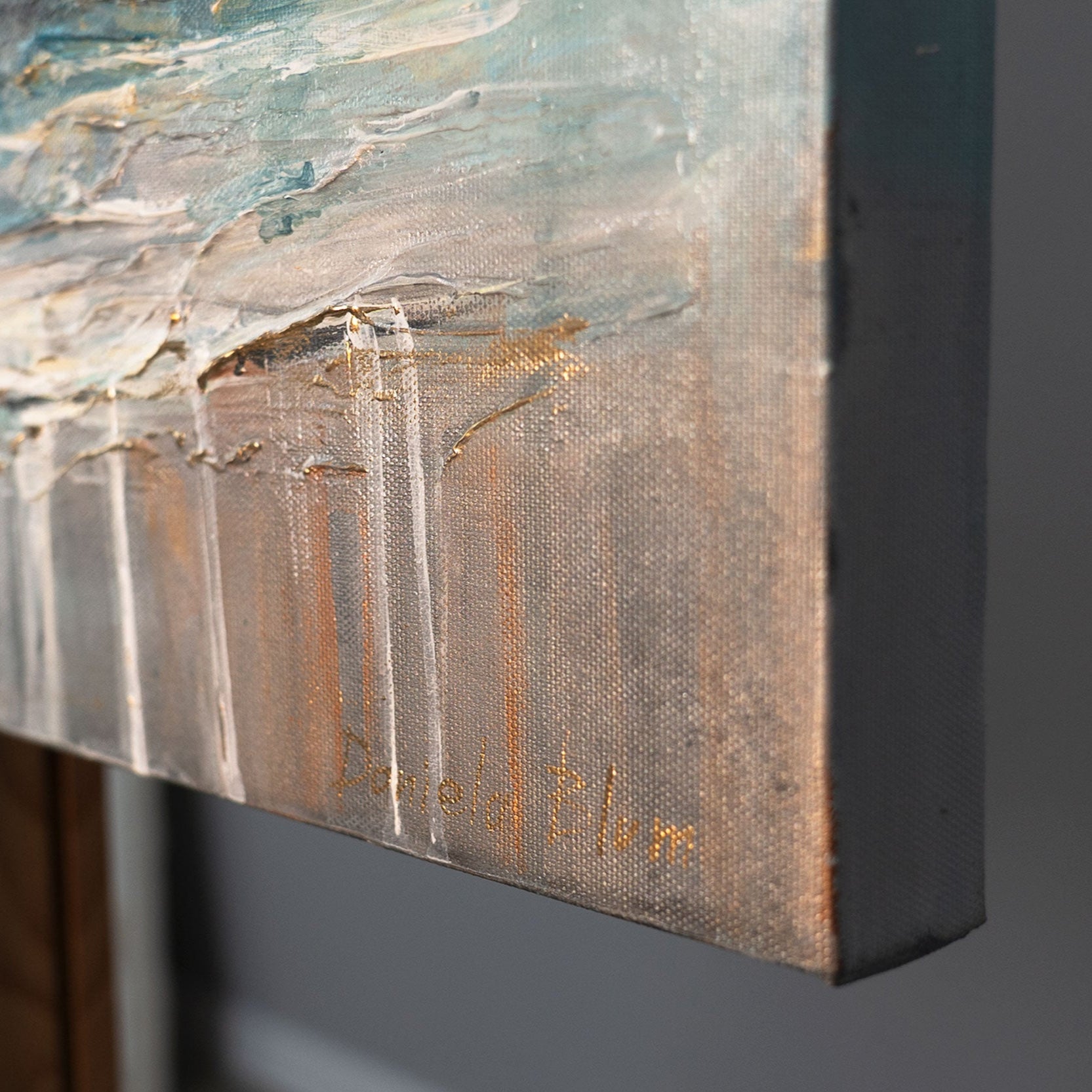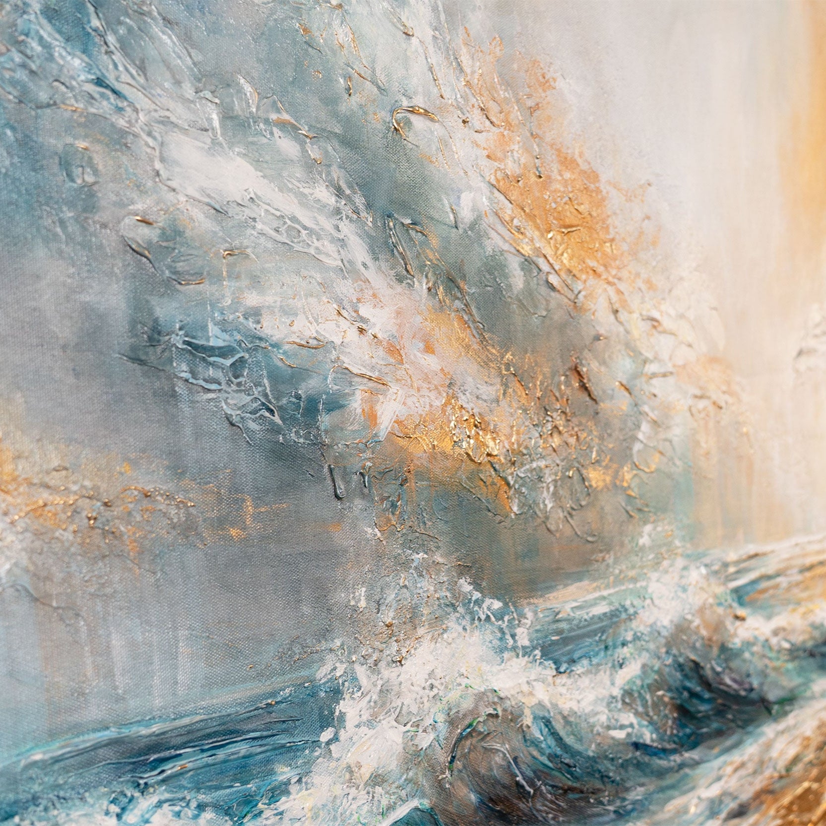 "Sea Dawn" ist ein handgemaltes Acrylbild auf Leinwand, das einen abstrakten Meeresblick bei Sonnenaufgang darstellt. Mit strukturierter Farbgebung in Türkis, Blau, Beige und Gold entsteht ein atmosphärisches Spiel von Licht und Wasser.