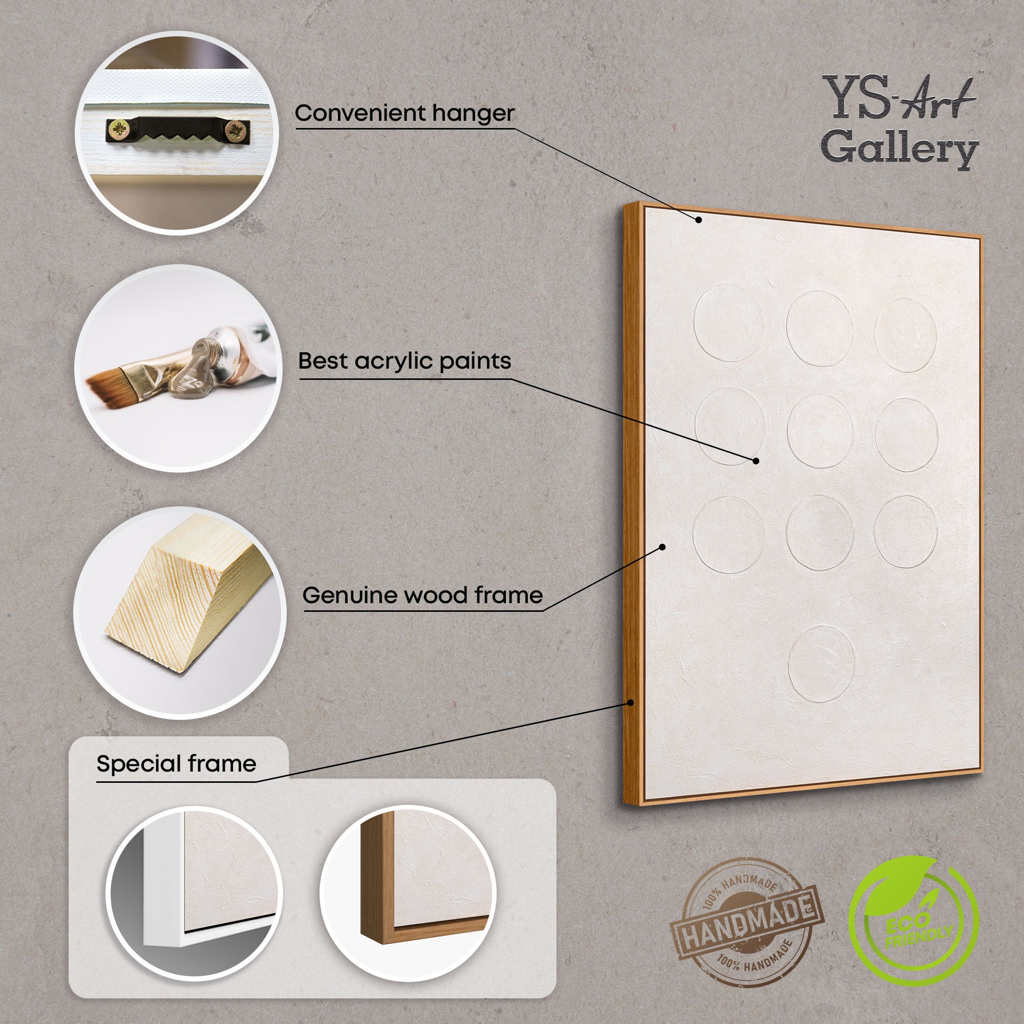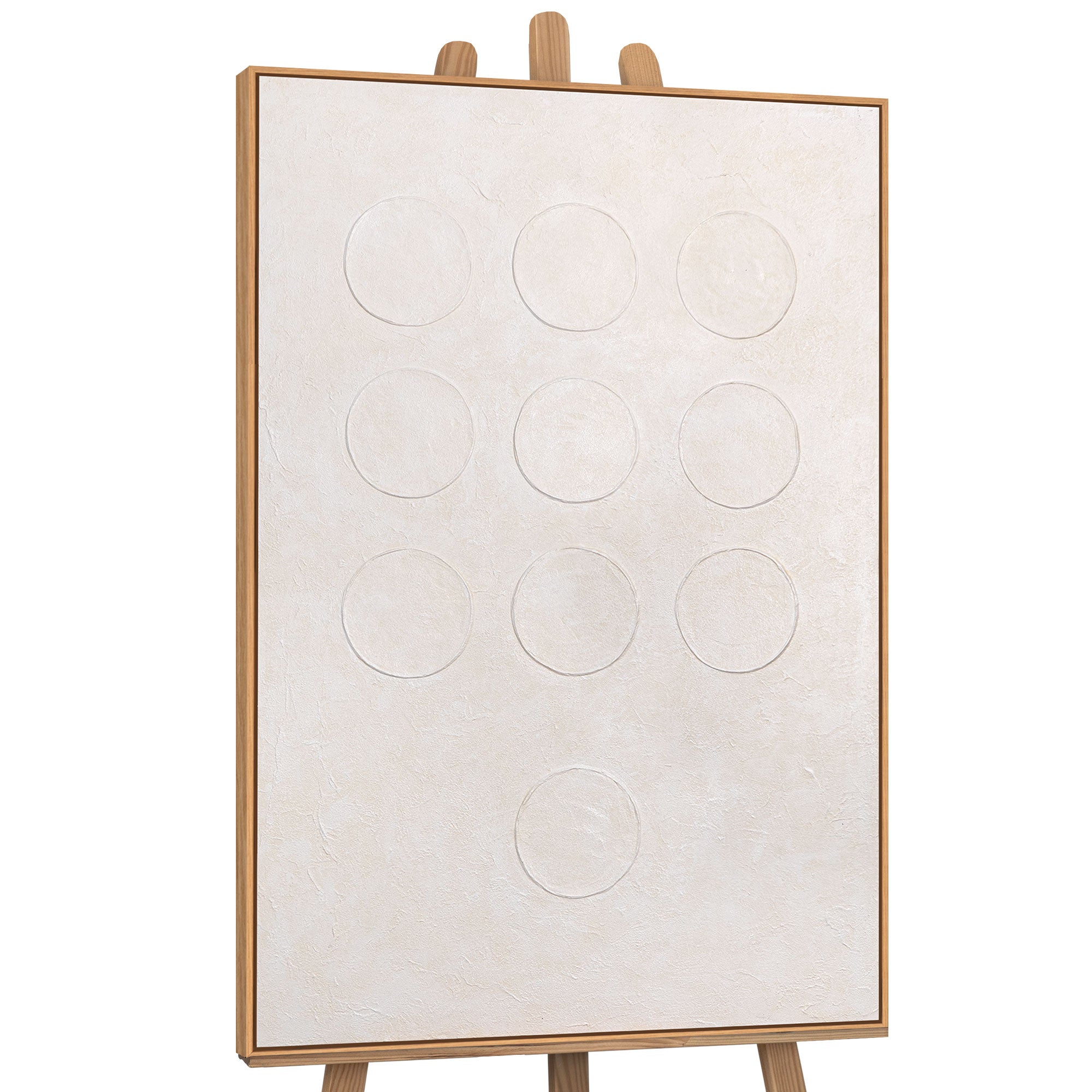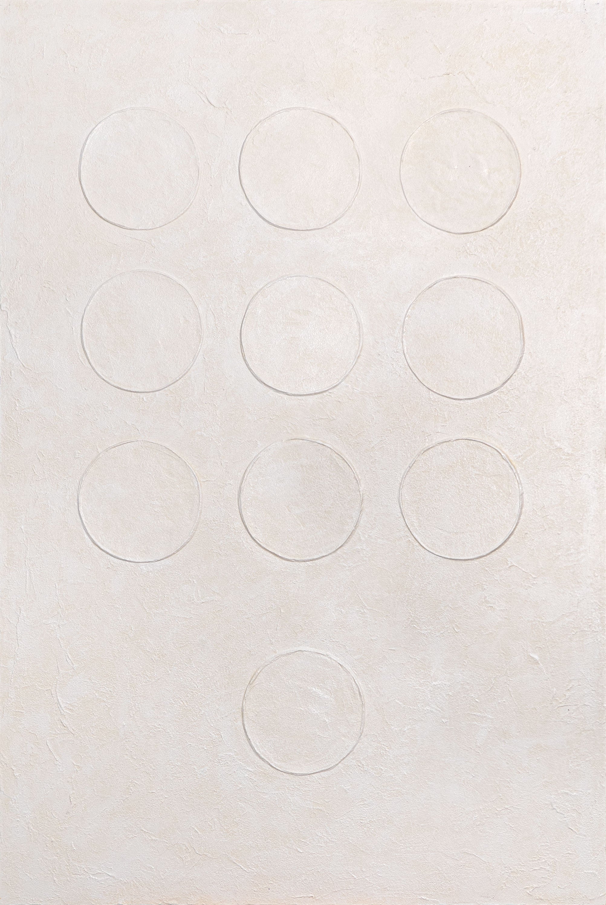 « White Code » incarne l'essence même de la peinture acrylique texturée moderne. Neuf formes circulaires émergent subtilement de la surface, créant un équilibre entre ordre et mouvement. Les délicates nuances crème et blanc confèrent à l'œuvre une élégance minimaliste et épurée, idéale pour les espaces modernes et sereins.