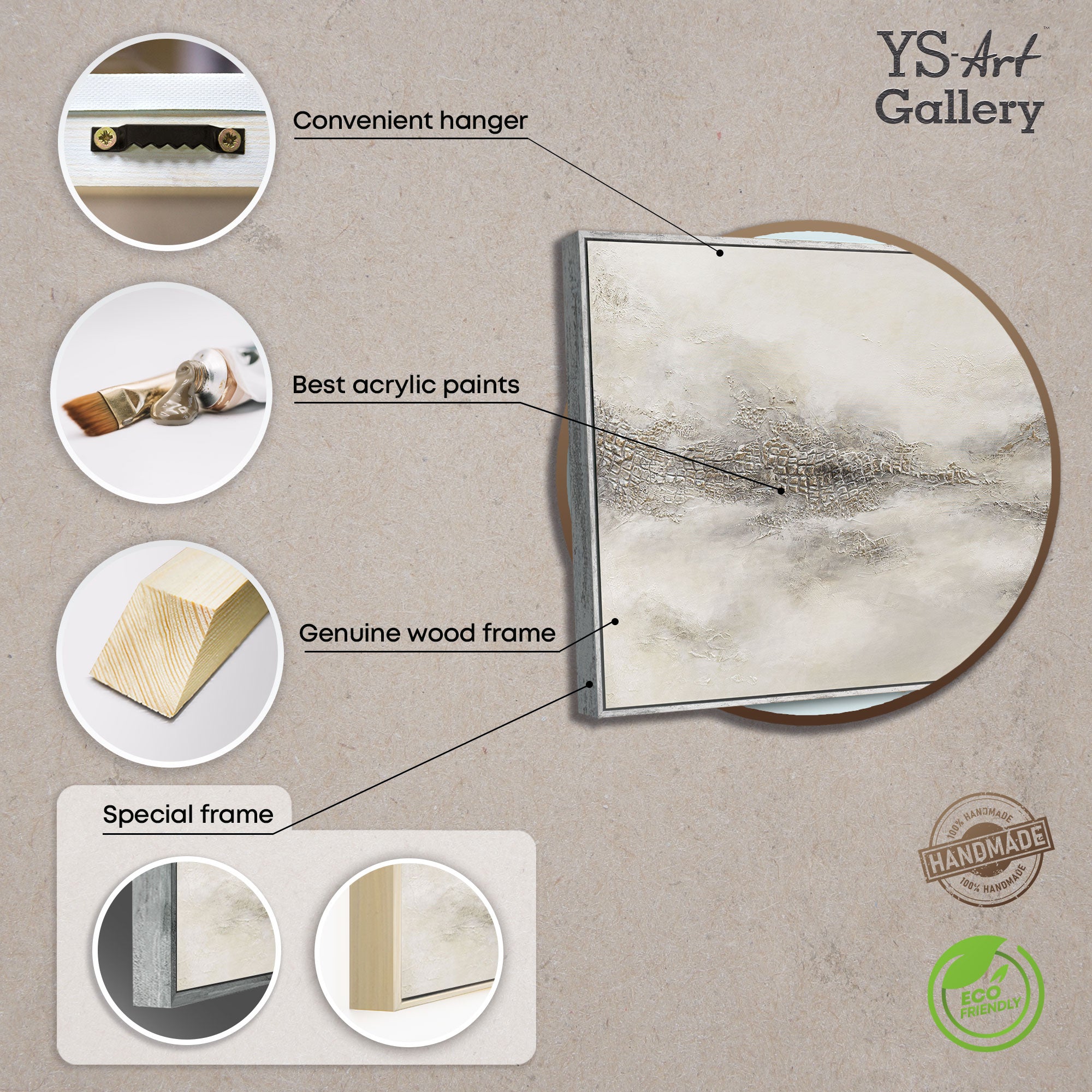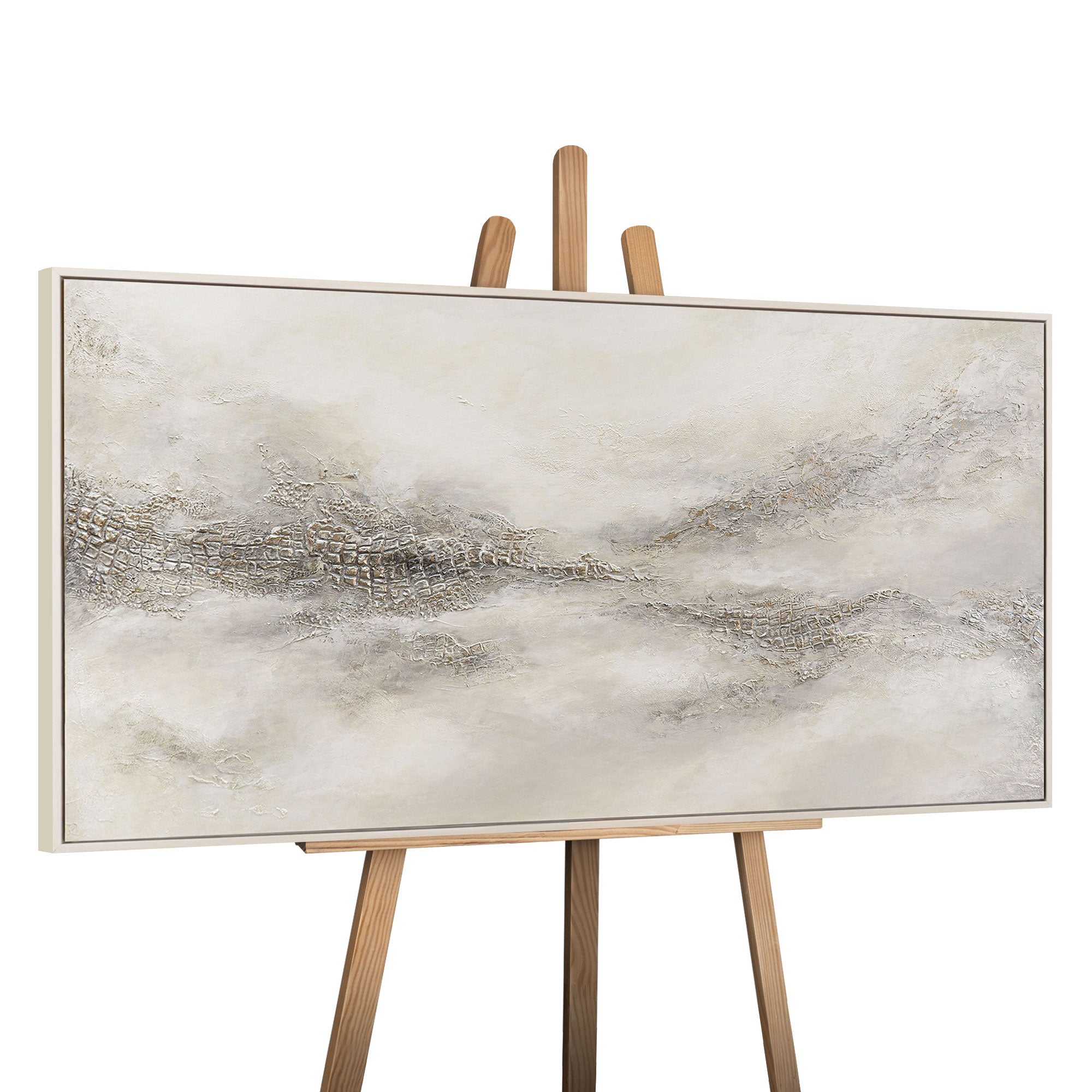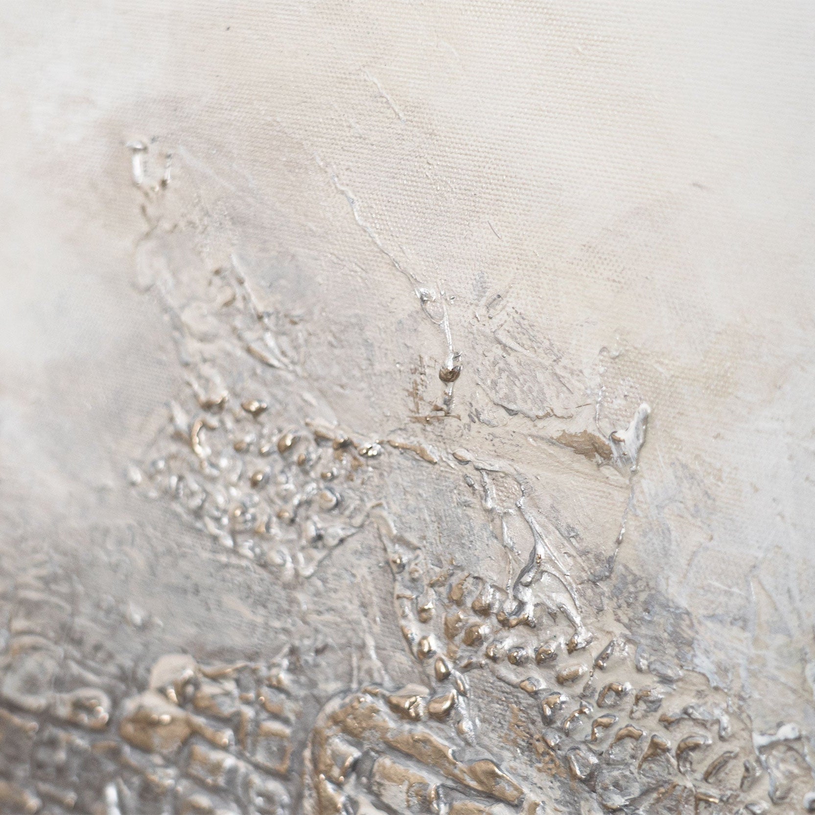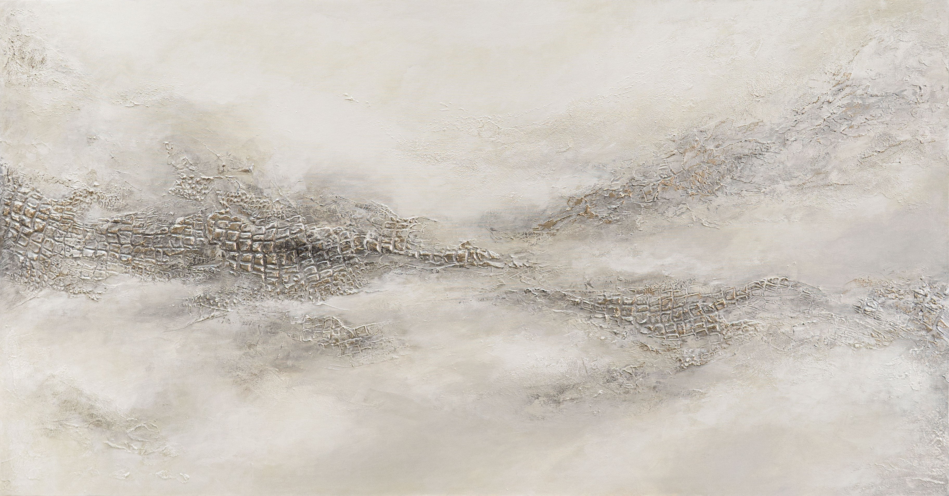 « Distance nébuleuse » révèle la beauté paisible de l'inconnu. Dans des nuances douces de gris et de beige délicat, les textures se fondent en une étendue brumeuse, entre rêve et souvenir. La structure en relief confère de la profondeur à la surface, tandis que la lumière glisse sur les plans en relief, telle une ligne d'horizon lointaine se fondant dans la brume.