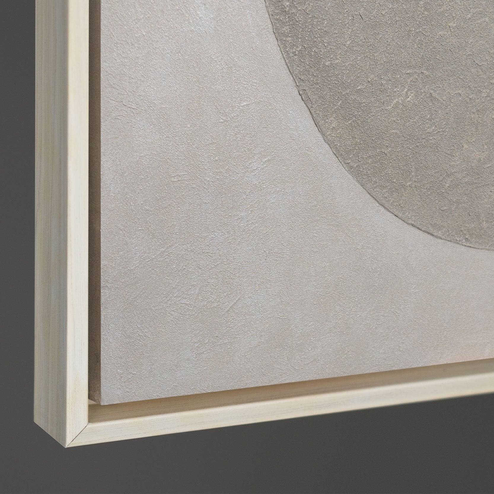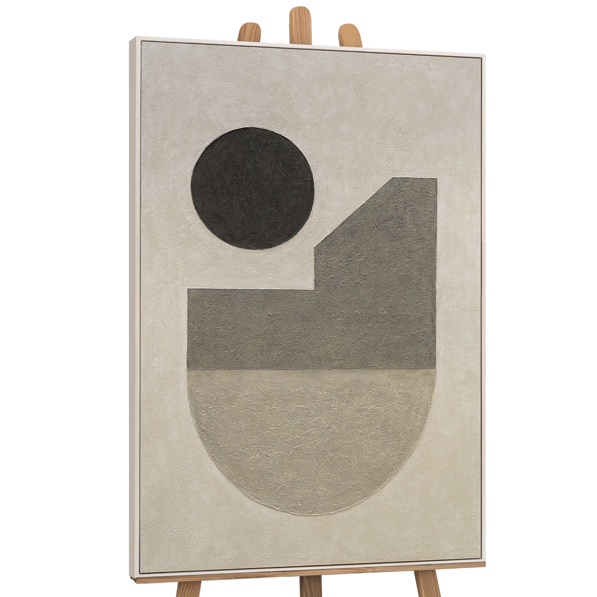 « La Sérénité de la Géométrie » est une œuvre d'art caractérisée par l'équilibre et la sobriété. Des formes géométriques simples – cercle, rectangle et demi-surface – se mêlent à une texture délicate et à des nuances harmonieuses de gris et de beige. Cette composition dégage une impression de tranquillité, de précision et de l'élégance discrète du design minimaliste.