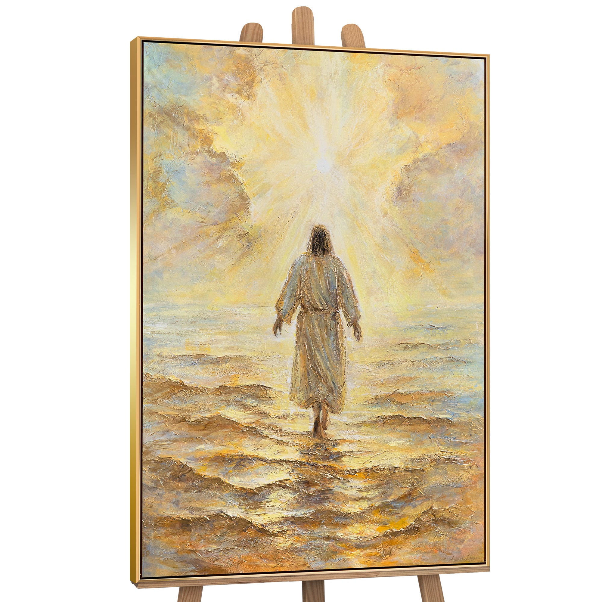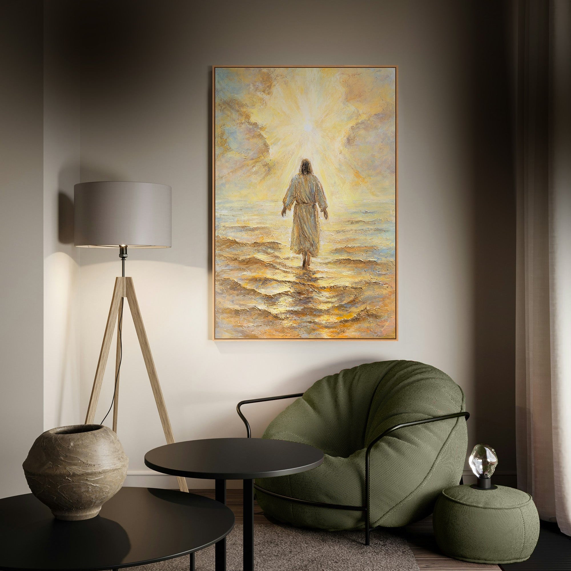 « L'Éclat de la Foi » représente une scène inspirante : Jésus marchant sur l'eau dans une lumière dorée. Cette image religieuse symbolise la foi divine et la lumière que le Christ apporte au monde. La vision du Christ baigné dans cette radiance céleste unique inspire paix, espoir et force spirituelle.