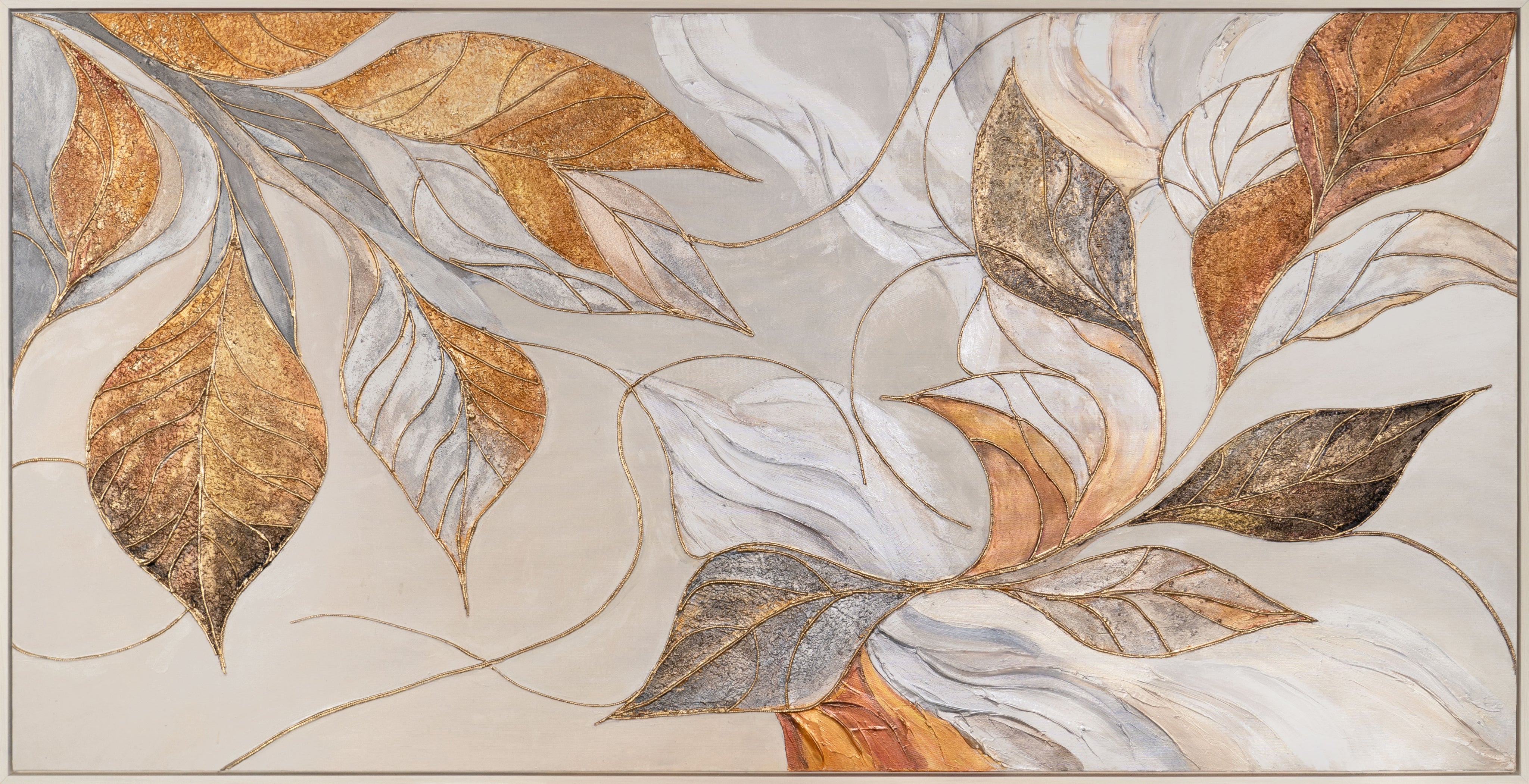 Dieses elegante Acrylbild bringt die Schönheit der Natur in stilisierter Form an Ihre Wand. Goldene und bronzene Blätter vereinen sich auf einer strukturierten Leinwand zu einem harmonischen Kunstwerk, das Wärme und Raffinesse ausstrahlt.