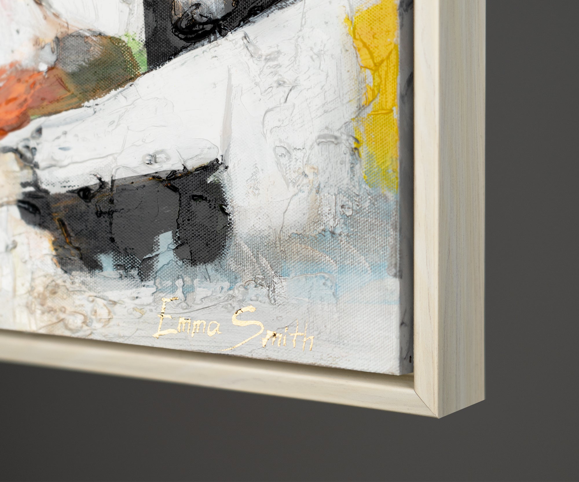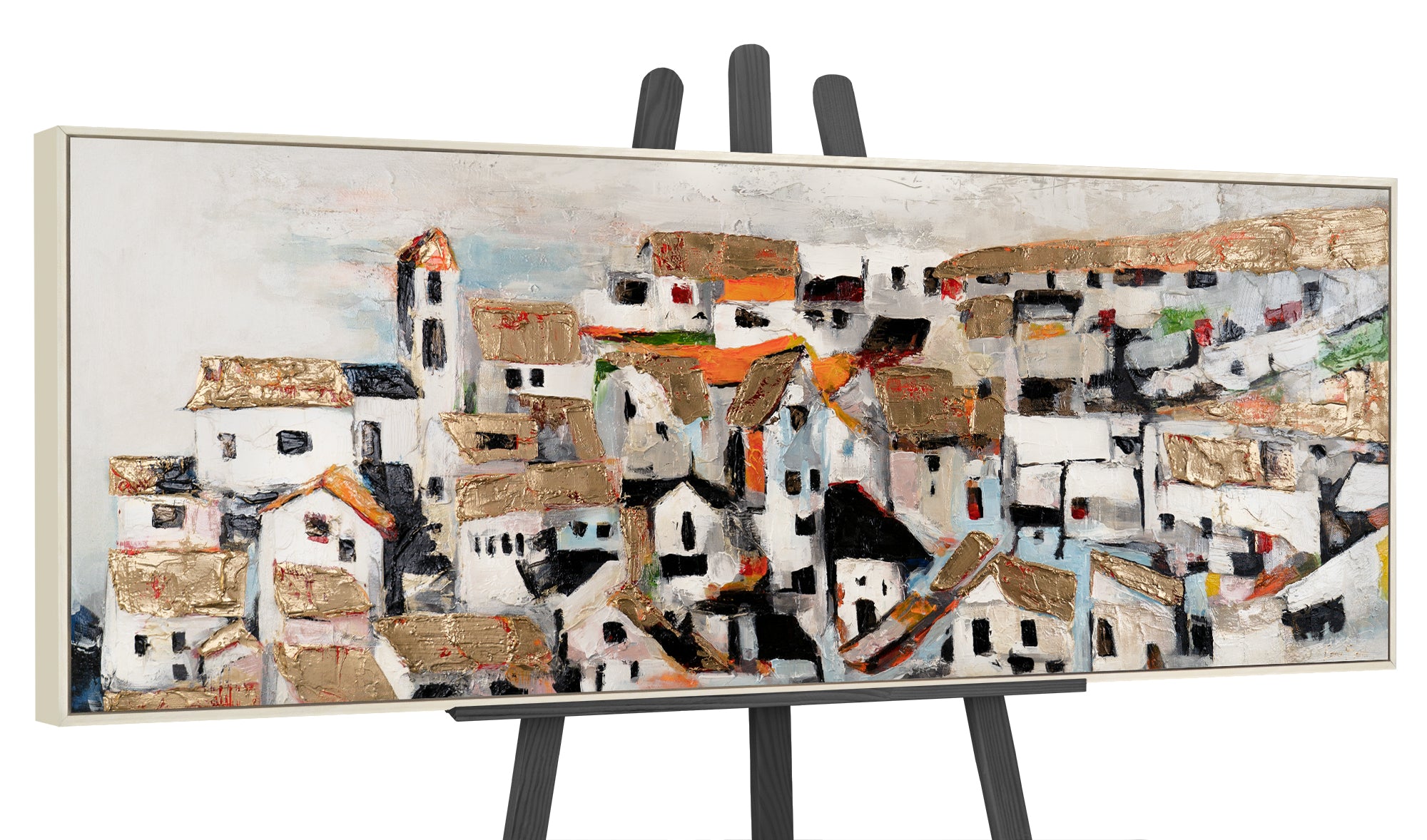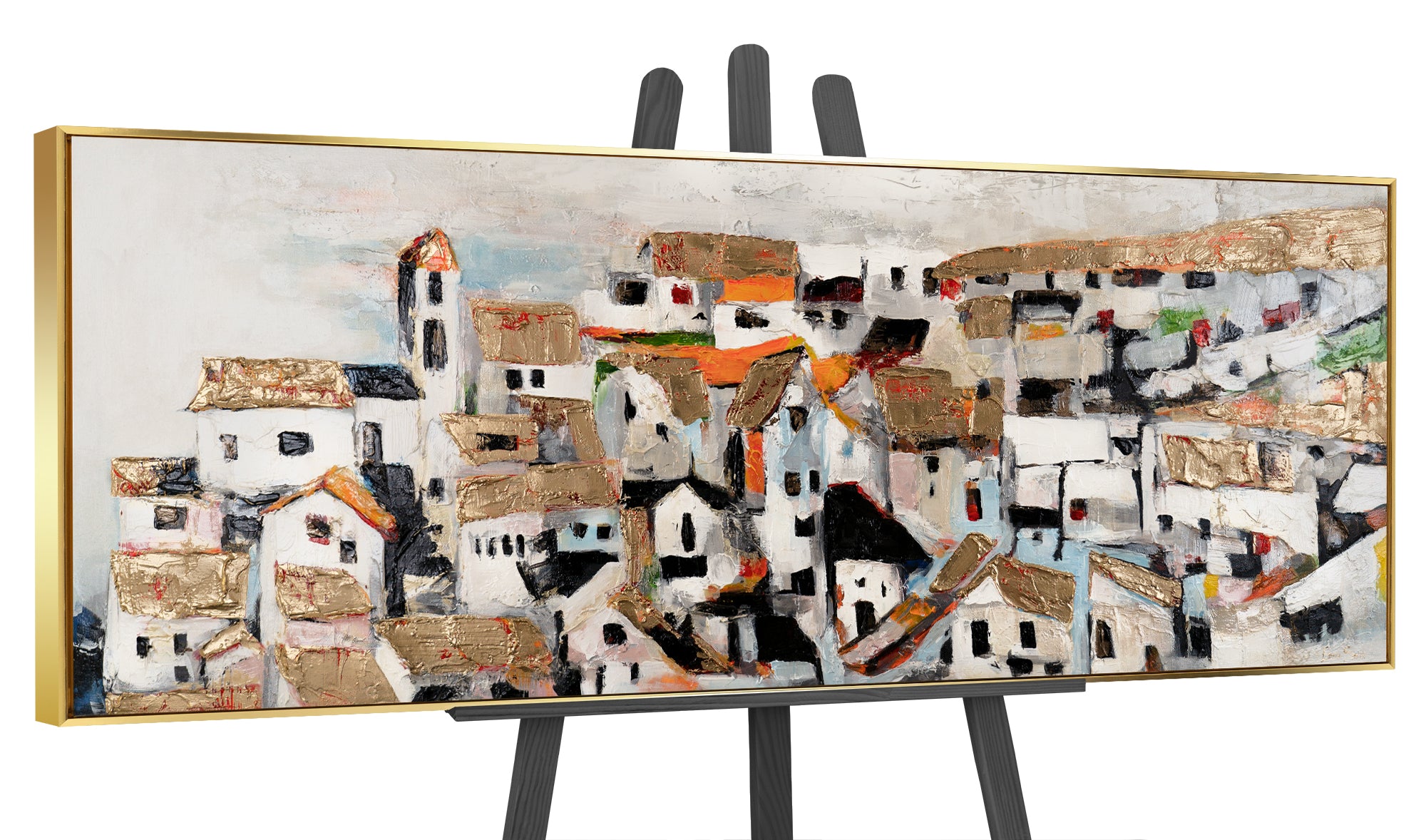 Dieses handgemalte Leinwandbild „Sonnenhäuser“ fängt mit seiner abstrakten Darstellung eine bezaubernde Stadtszene ein. Warme Weiß- und Goldtöne verschmelzen zu einer lebendigen Komposition, die durch ihre reich strukturierte Oberfläche eine besondere Tiefe erhält. Die goldenen Akzente verleihen dem Kunstwerk eine edle Ausstrahlung, die dem Raum Wärme und Eleganz schenkt.