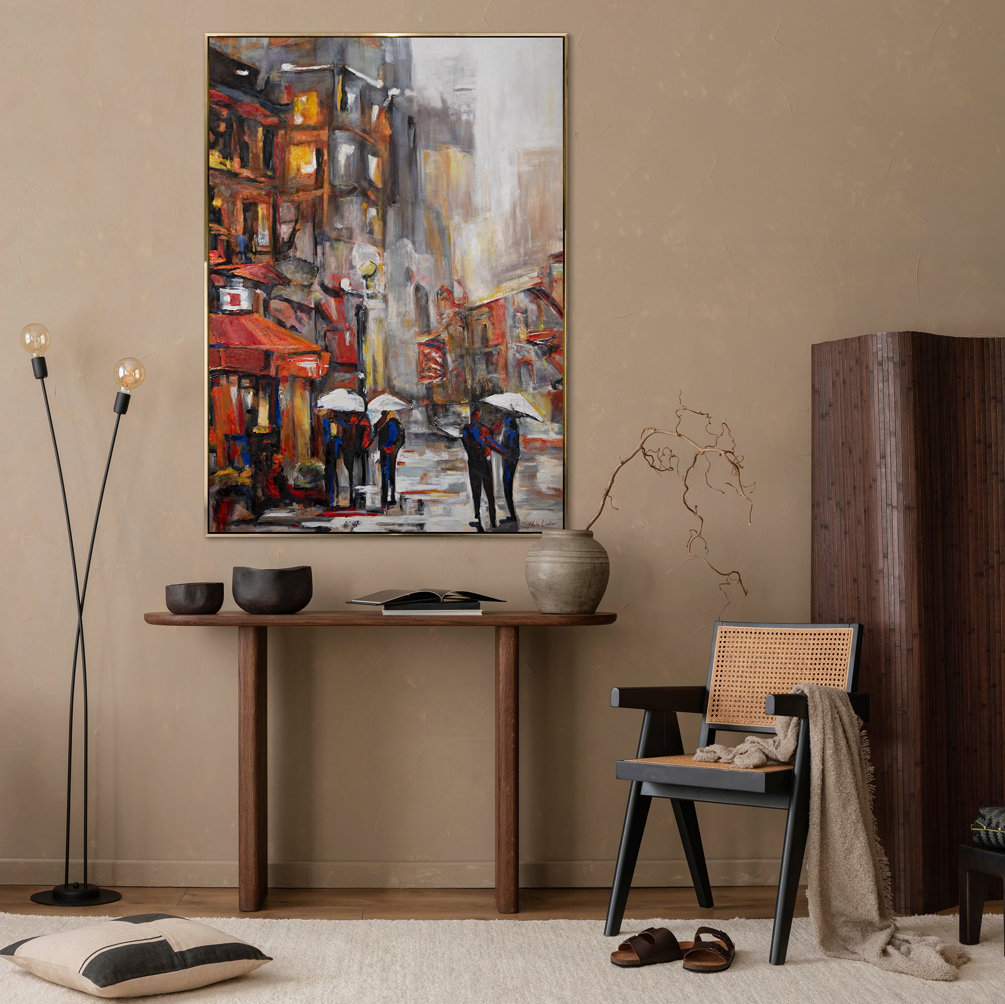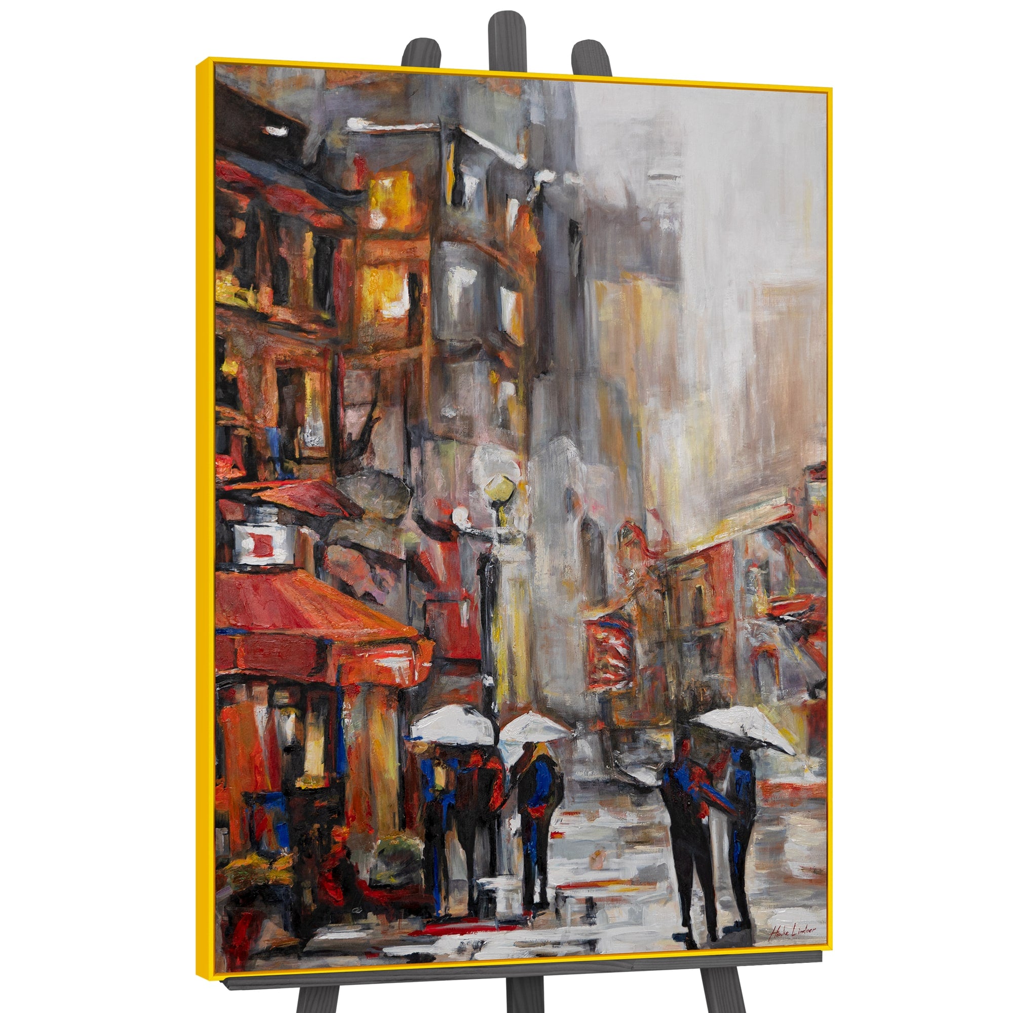 Dieses handgemalte, abstrakte Acrylbild auf Leinwand zeigt eine lebhafte Stadtlandschaft mit eindrucksvollen Pinselstrichen und Farbnuancen. Jede Nuance fängt die Dynamik und Atmosphäre der Stadt ein, während Figuren unter Regenschirmen die Szene beleben. Das Bild ist vollständig handgefertigt und bietet Ihnen die Möglichkeit, die Rahmenfarbe nach Ihren individuellen Vorlieben zu wählen. Egal, ob Sie einen modernen oder klassischen Stil bevorzugen, dieser Rahmen wird perfekt in Ihr Ambiente passen.