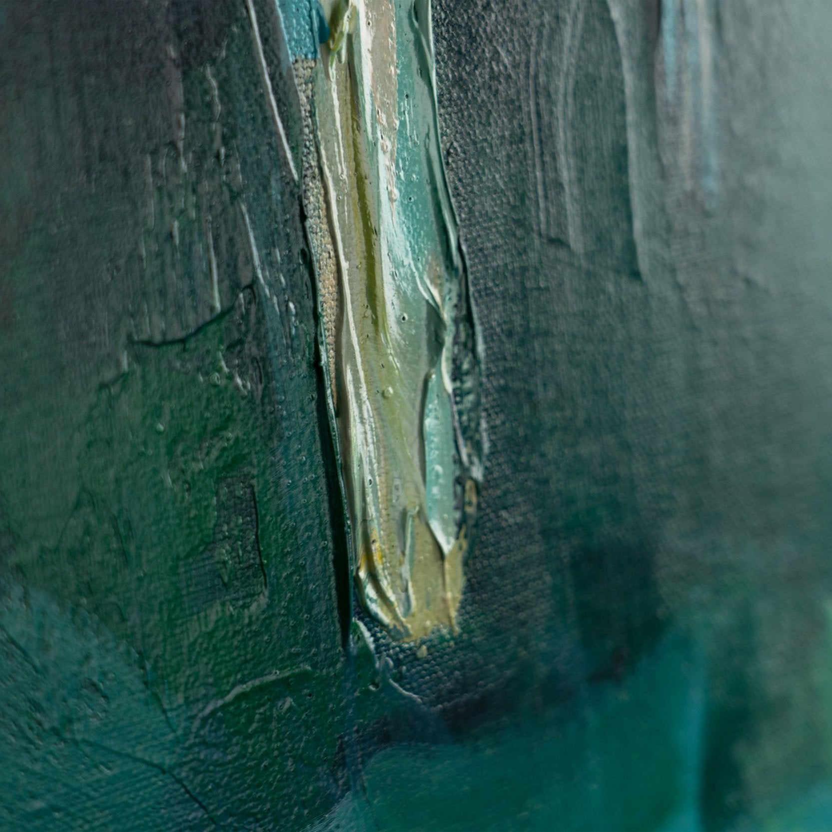 Dieses moderne, handgemalte Gemälde fängt die mystische Atmosphäre eines Waldes mit tiefen Grüntönen und eleganten Baumstrukturen ein. Das Zusammenspiel von Licht und Schatten sowie die abstrahierte Darstellung der Bäume schaffen eine beruhigende und zugleich faszinierende Wirkung.