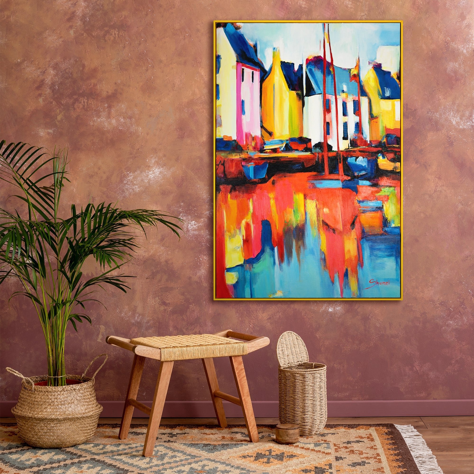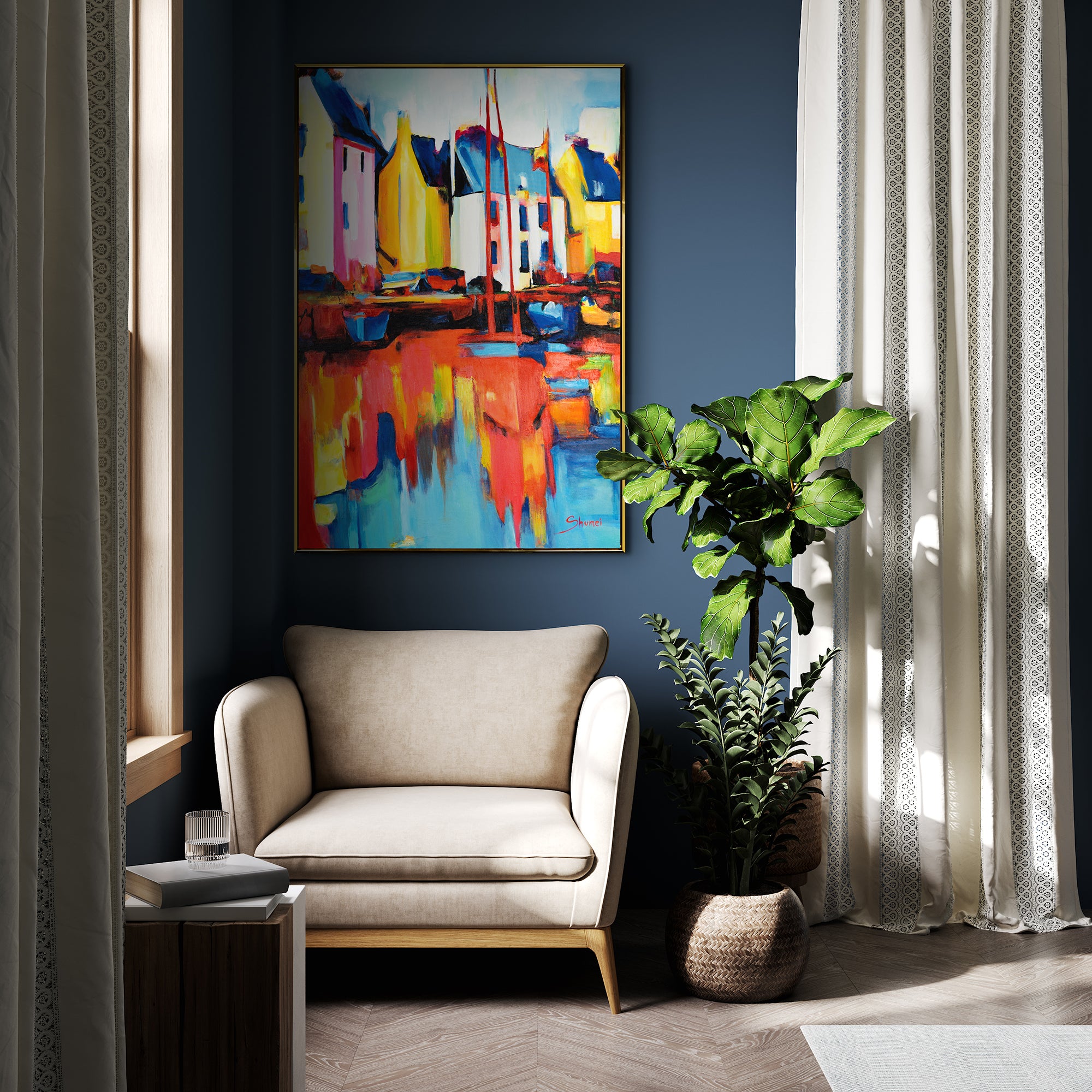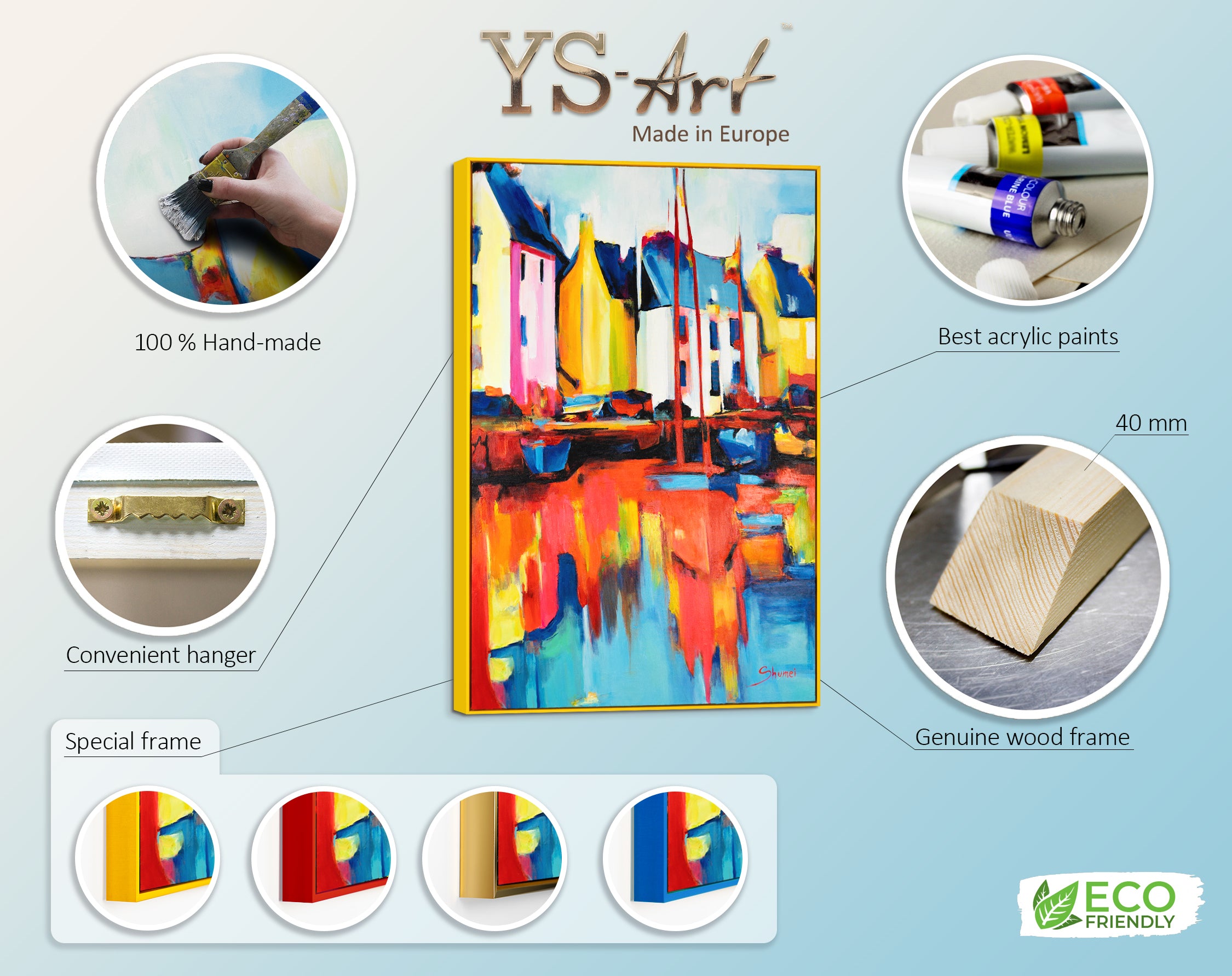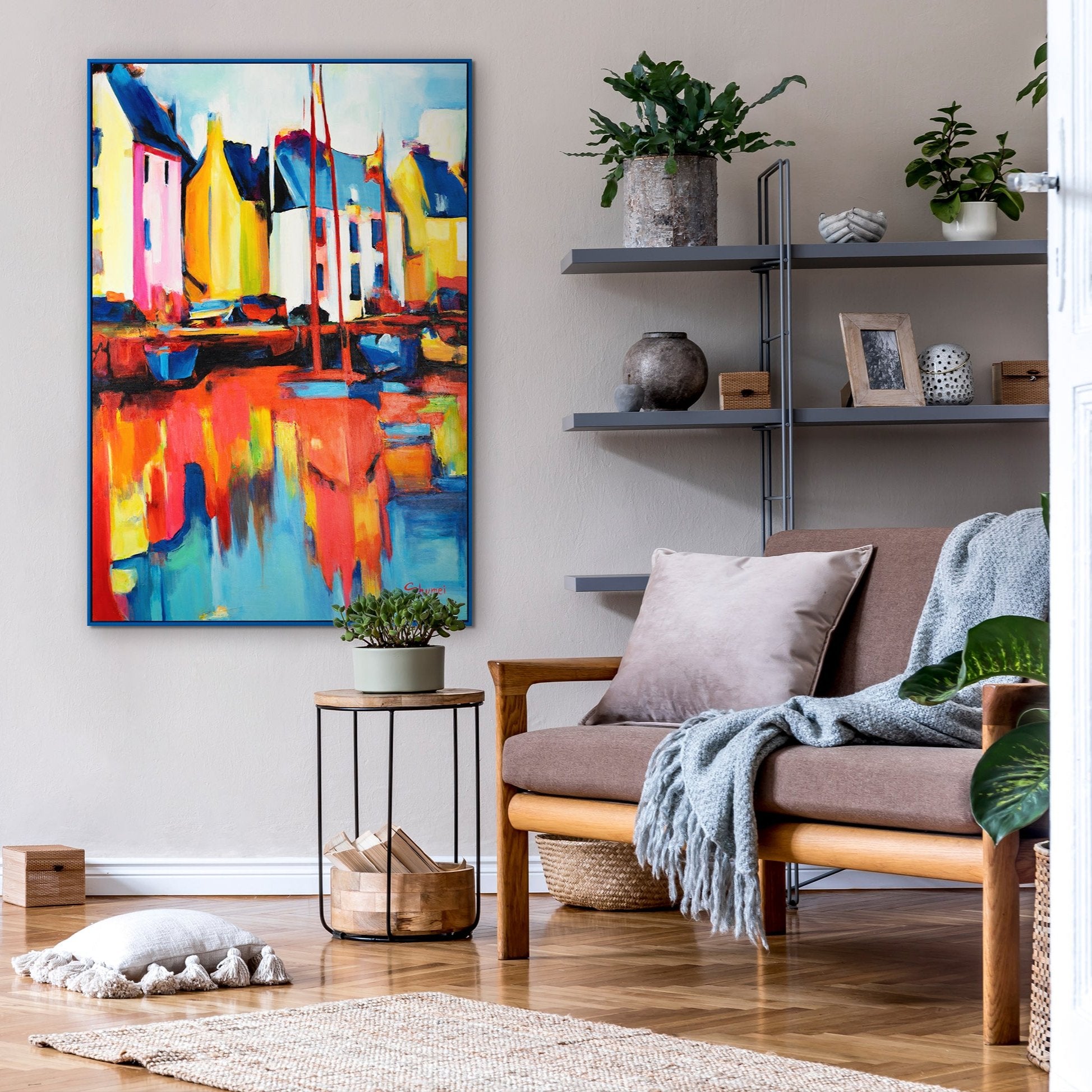 • Farbenfrohe Hafenansicht mit Rahmen Yachten und Hafen