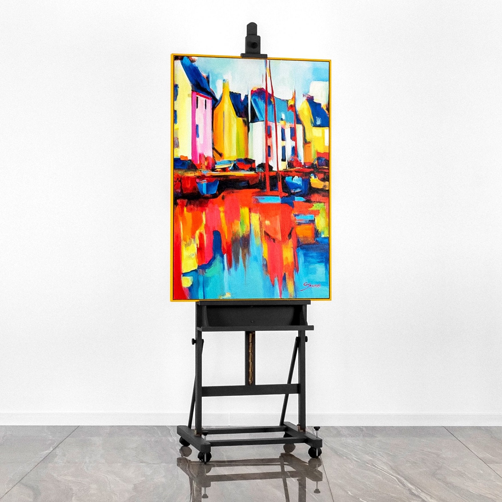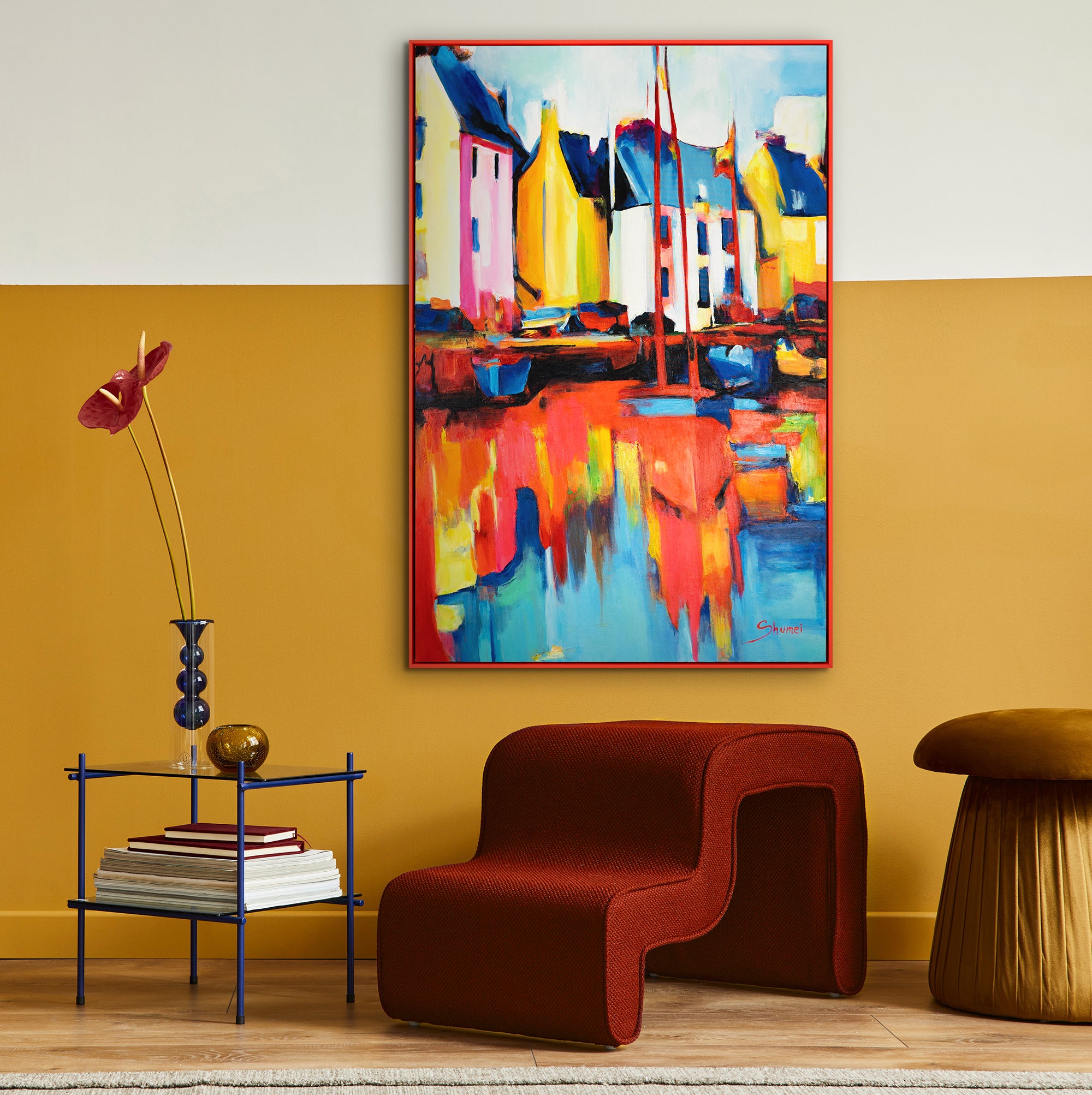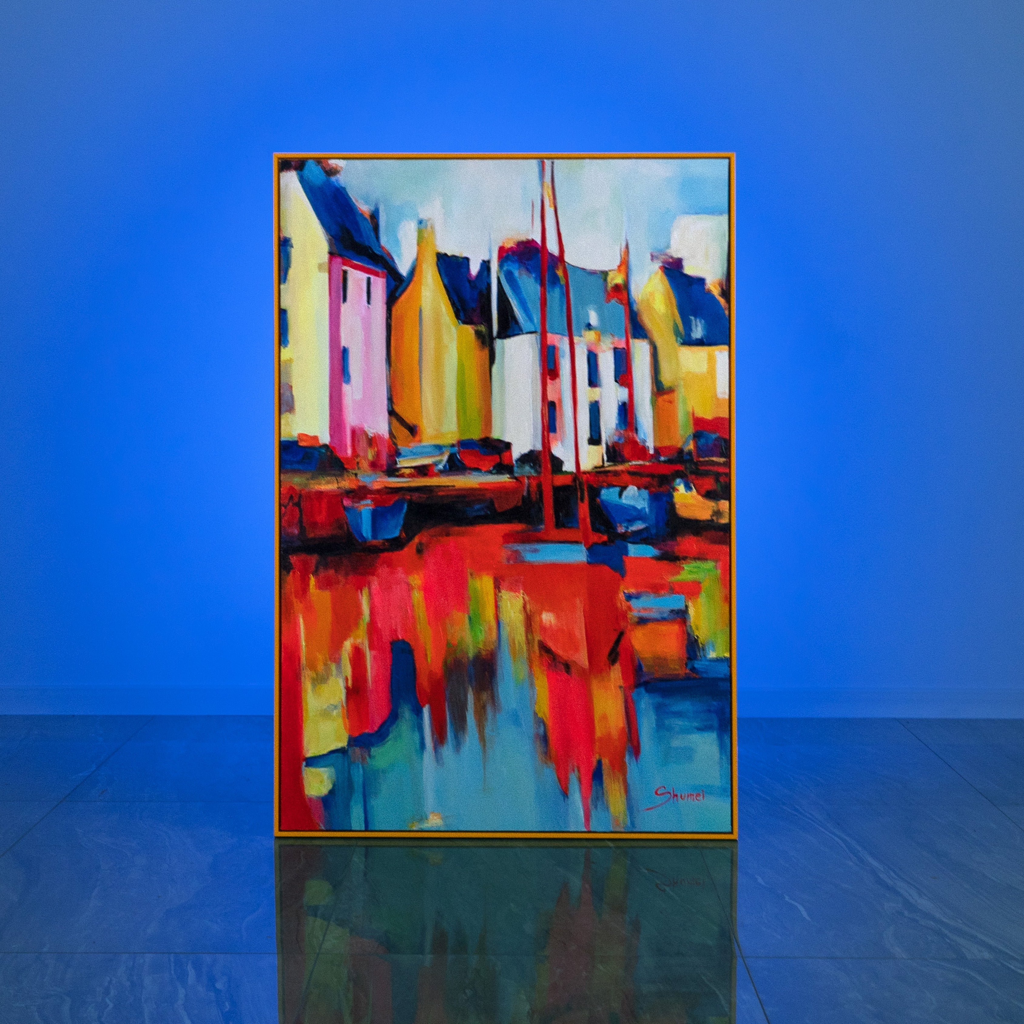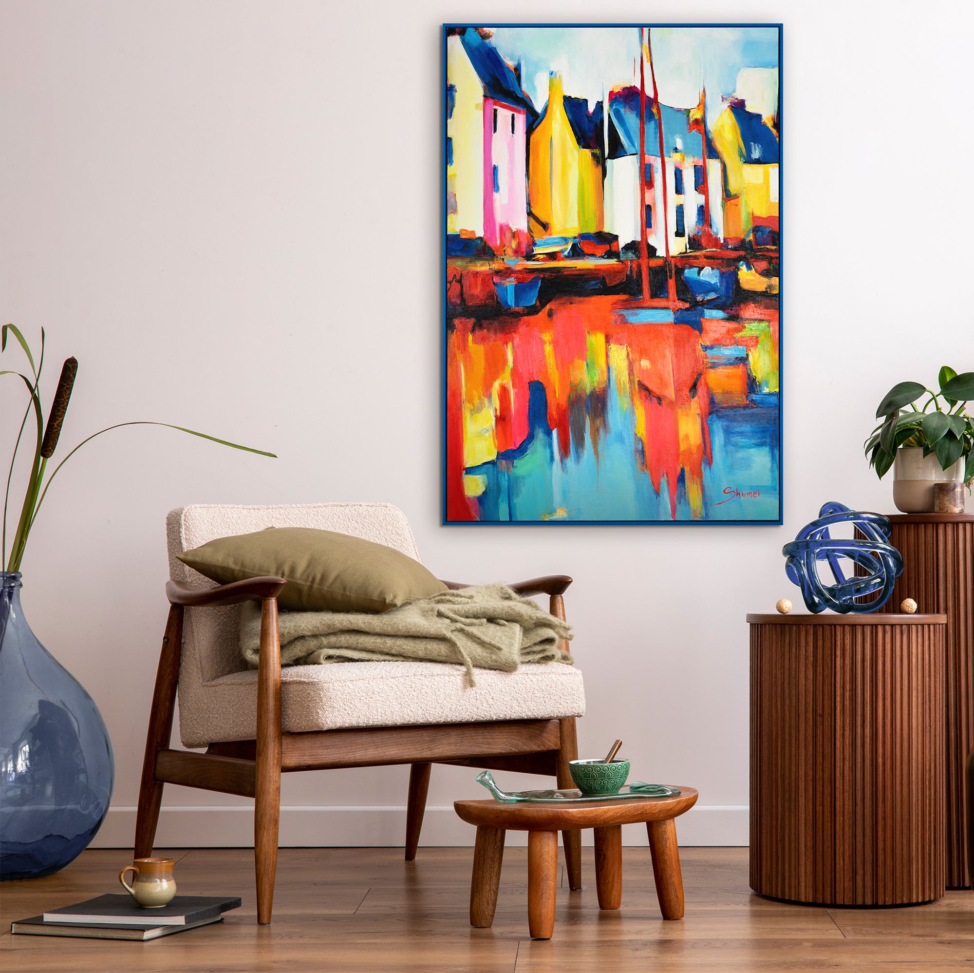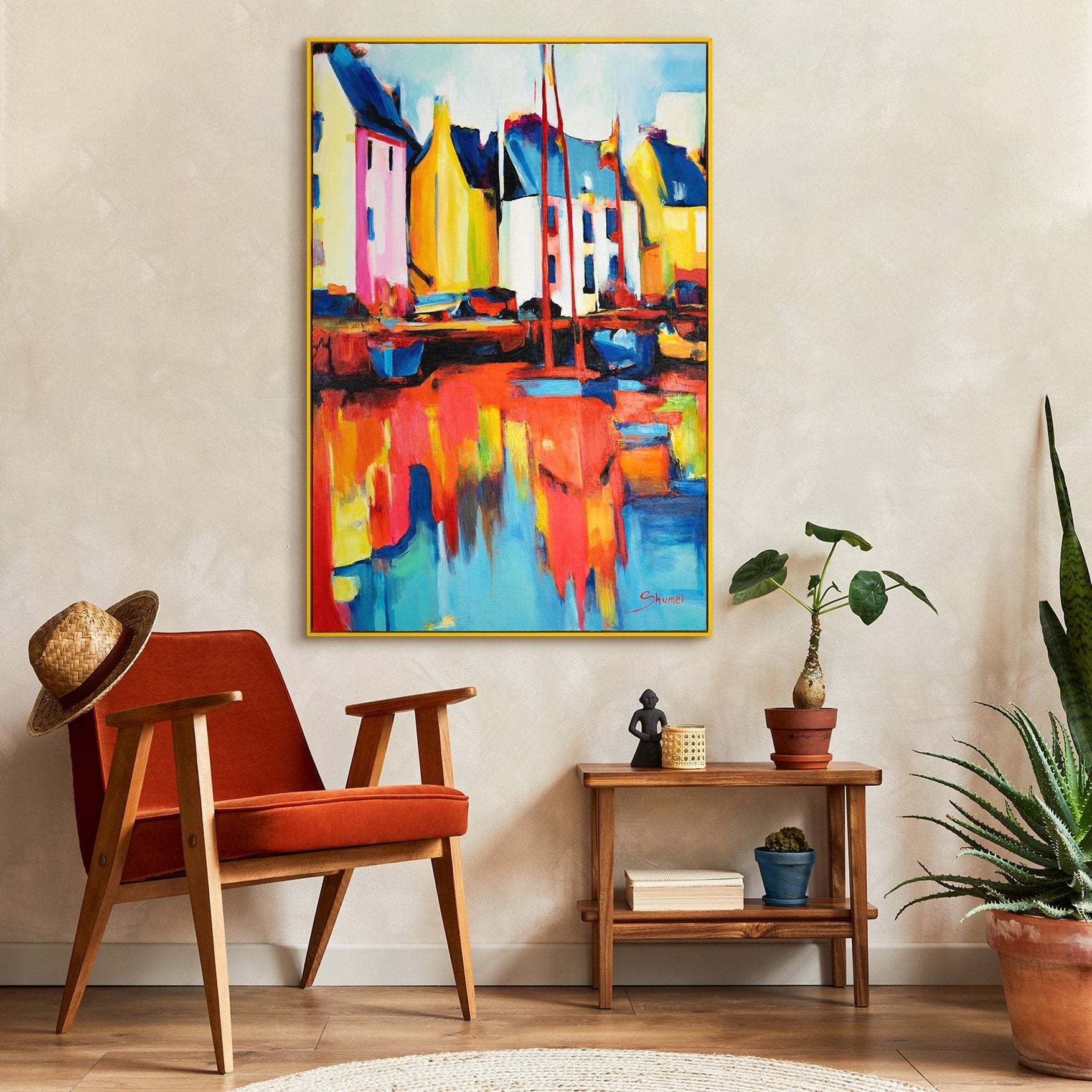 • Farbenfrohe Hafenansicht mit Rahmen Yachten und Hafen