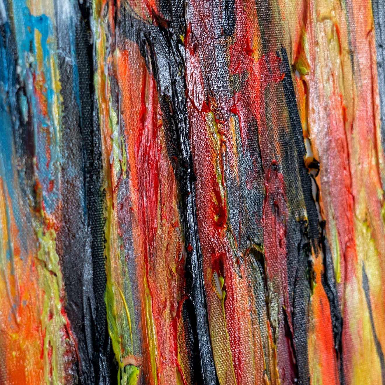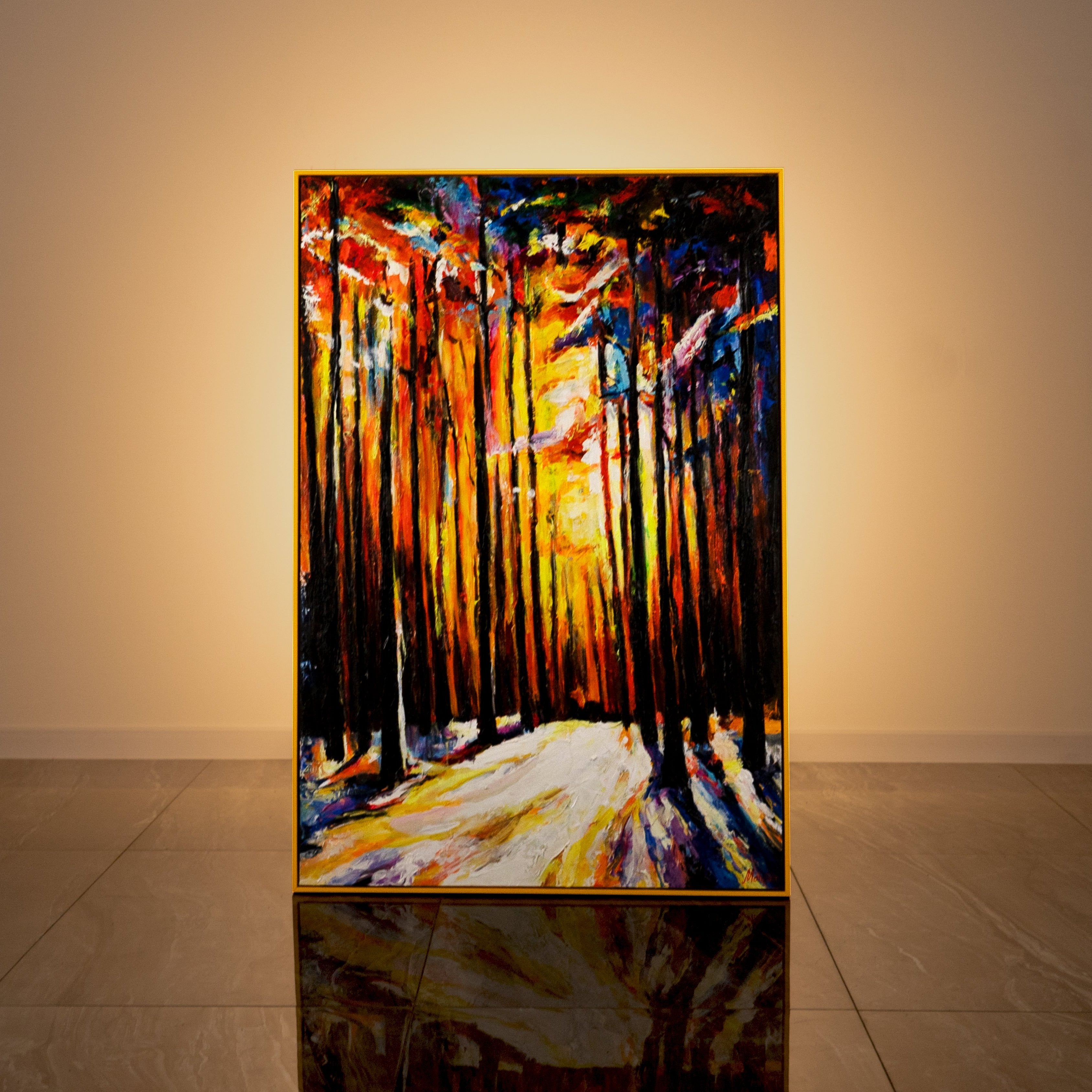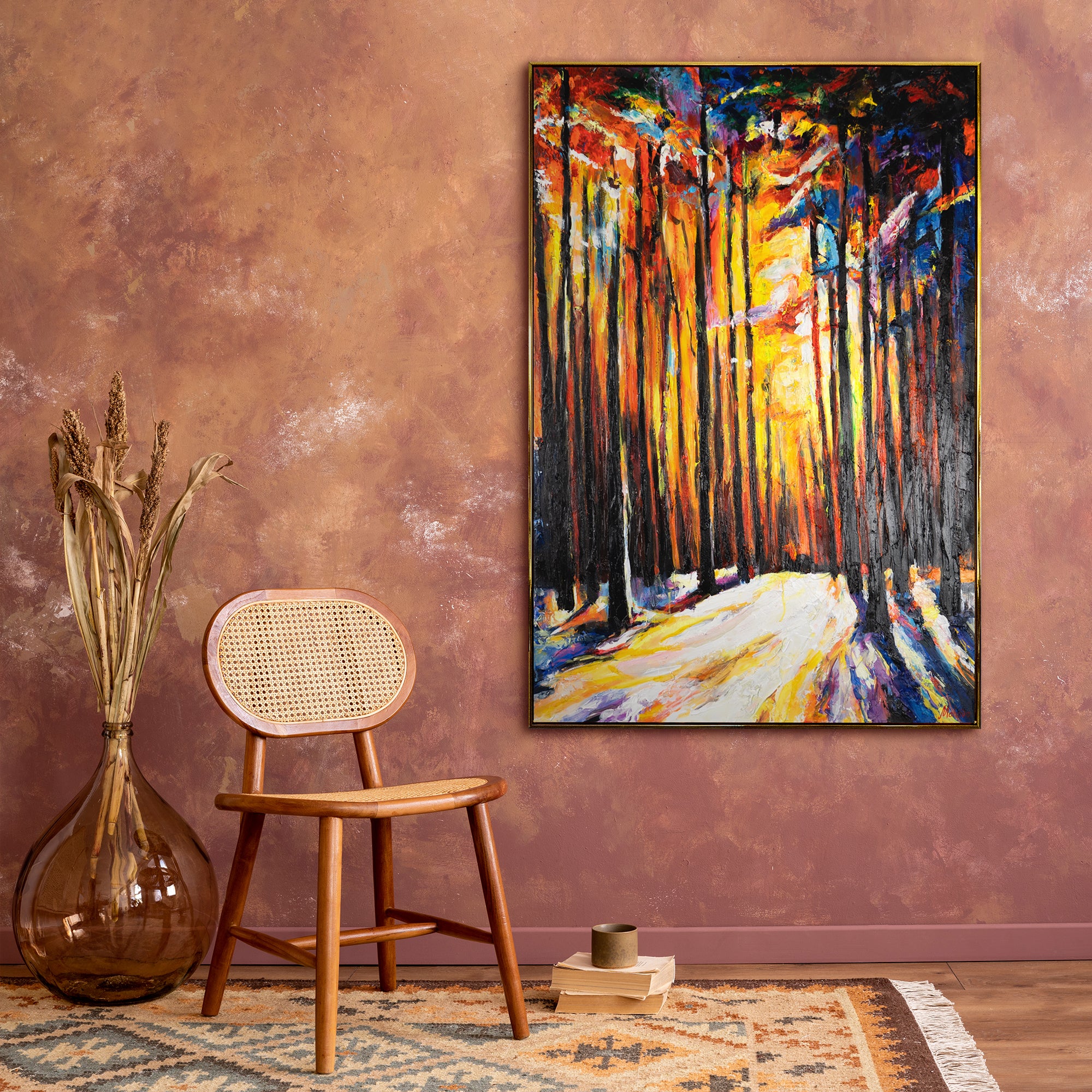 Dieses eindrucksvolle Gemälde mit dem Titel 'Lichtdurchfluteter Waldweg' verleiht jedem Raum eine lebendige und farbenfrohe Atmosphäre. Es handelt sich um ein handgemaltes Acrylbild, das den Zauber eines Waldes in einer abstrakten Darstellung einfängt.