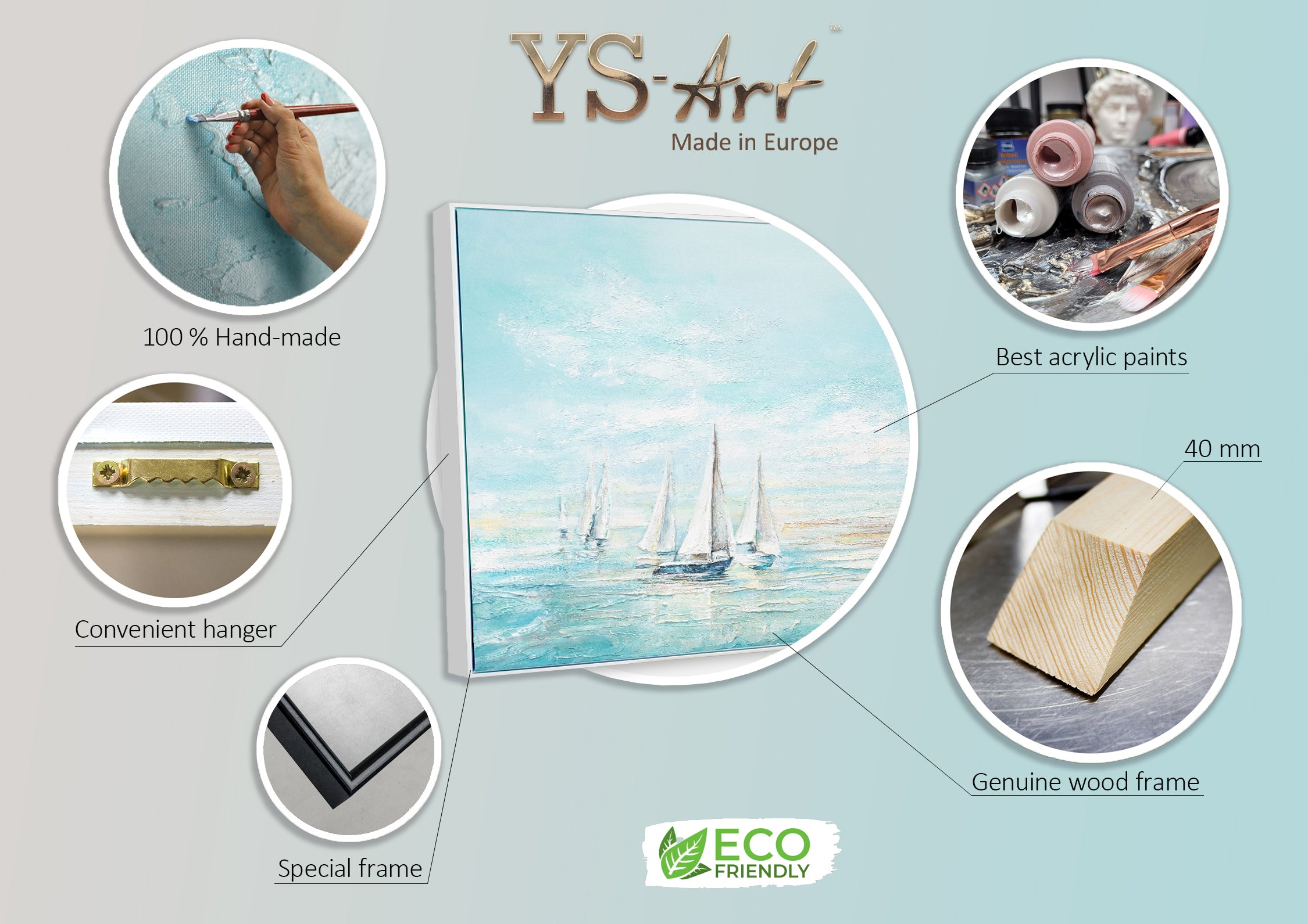 • Wir malen alle unsere Gemälde mit hochwertigen Acrylfarben, dabei sind die Farben gesundheitlich unbedenklich und vor allem umweltfreundlich. Wir spannen die Leinwand auf einen Naturholz-Keilrahmen. Damit die Acrylfarben auf dem Gemälde viele Jahre gesättigt bleiben, veredeln wir die Oberfläche mit Acryl Klarlack auf Wasserbasis.