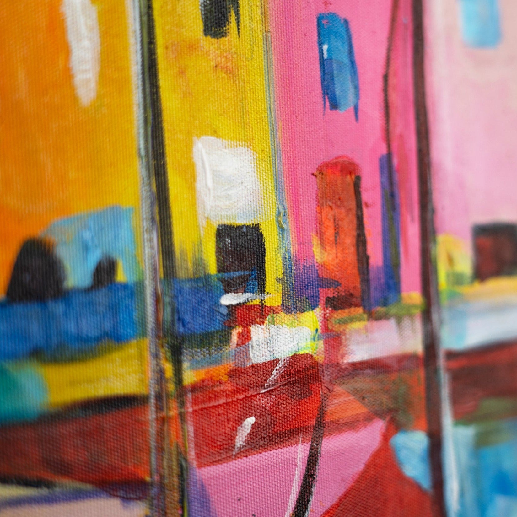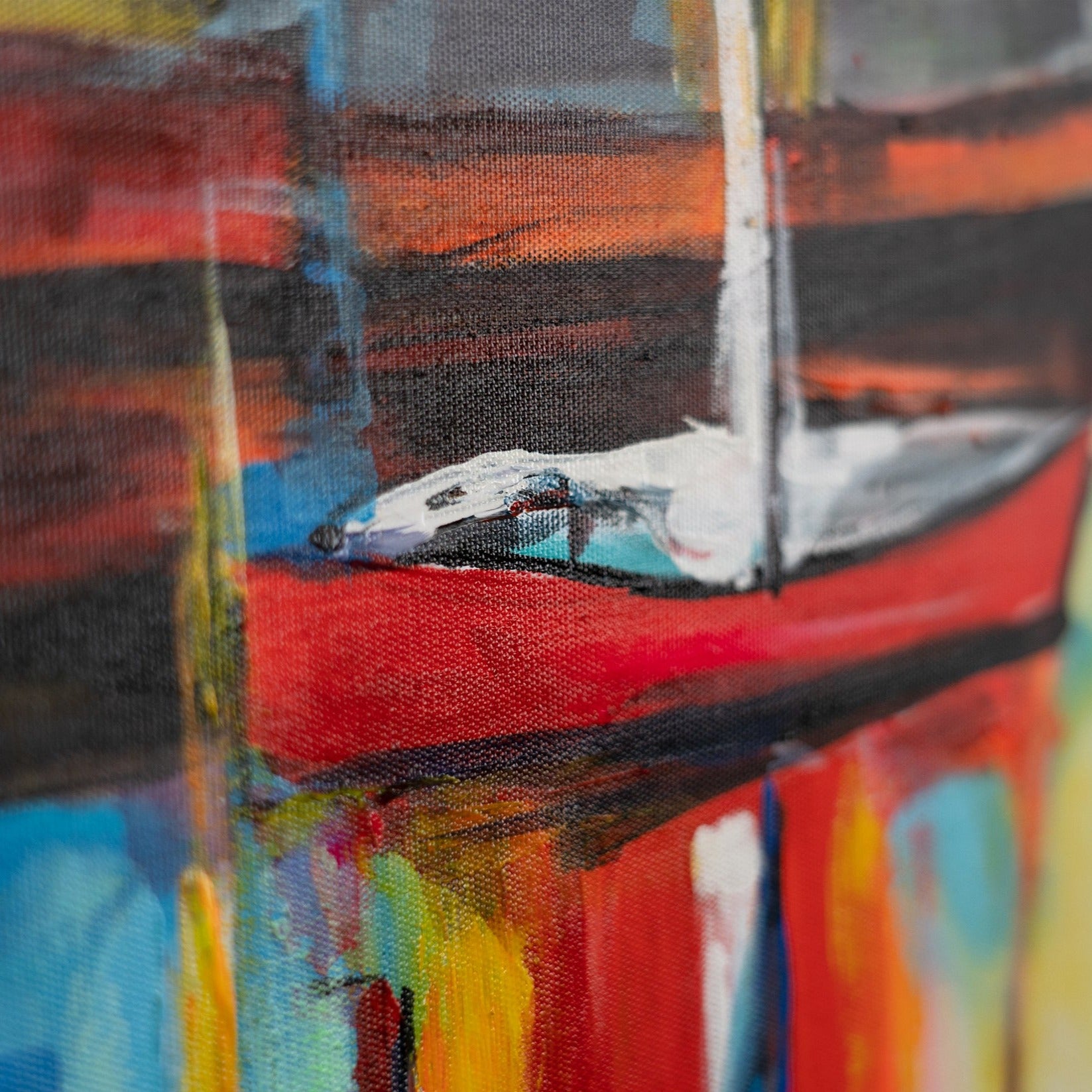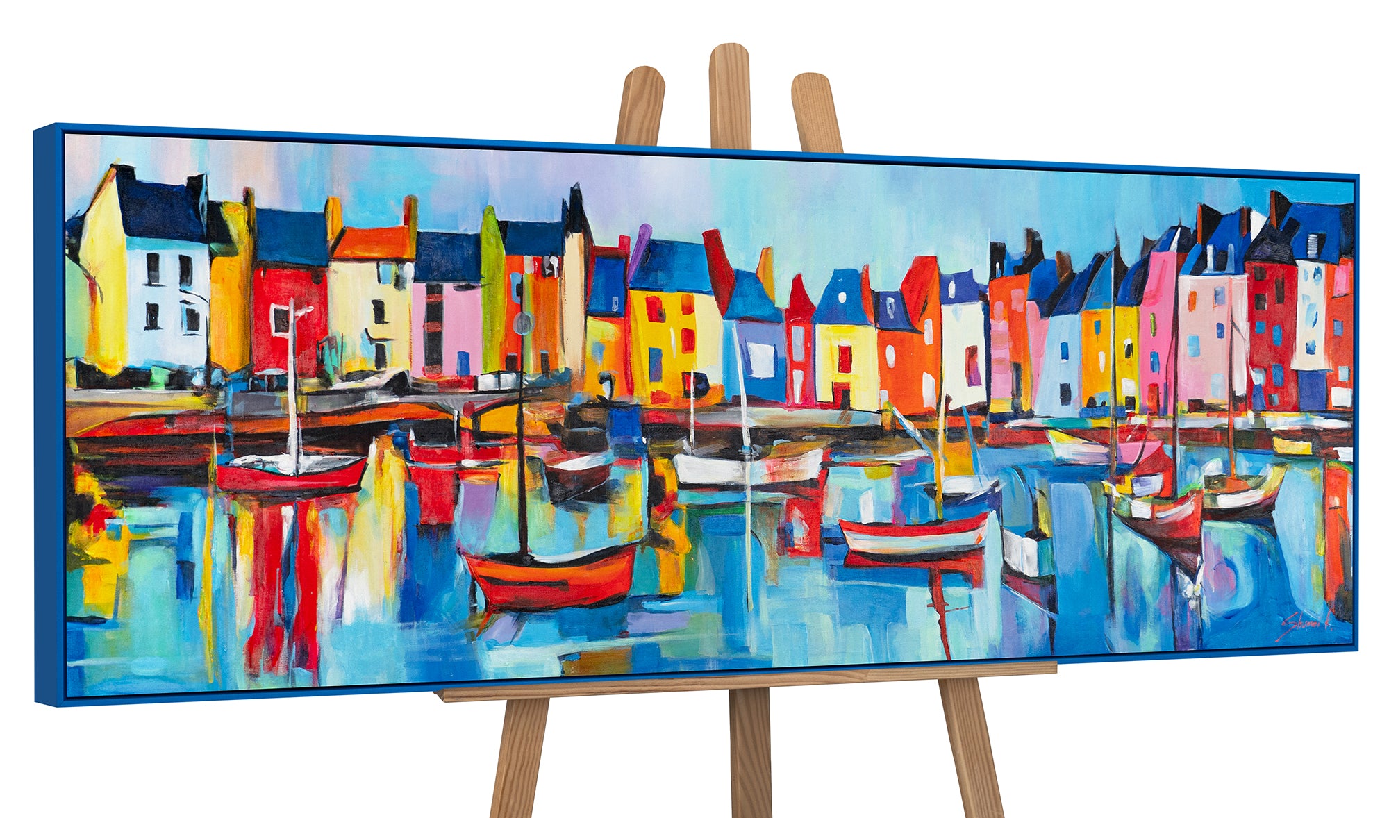Bereichern Sie Ihr Zuhause oder Büro mit diesem farbenfrohen, abstrakten Kunstwerk, das durch lebhafte Farben eine malerische Hafenszene darstellt. Das Bild besticht durch kräftige Kontraste und ausdrucksstarke Pinselstriche. Es ist 100% handgemalt und wird durch einen eleganten blauen Rahmen hervorgehoben.