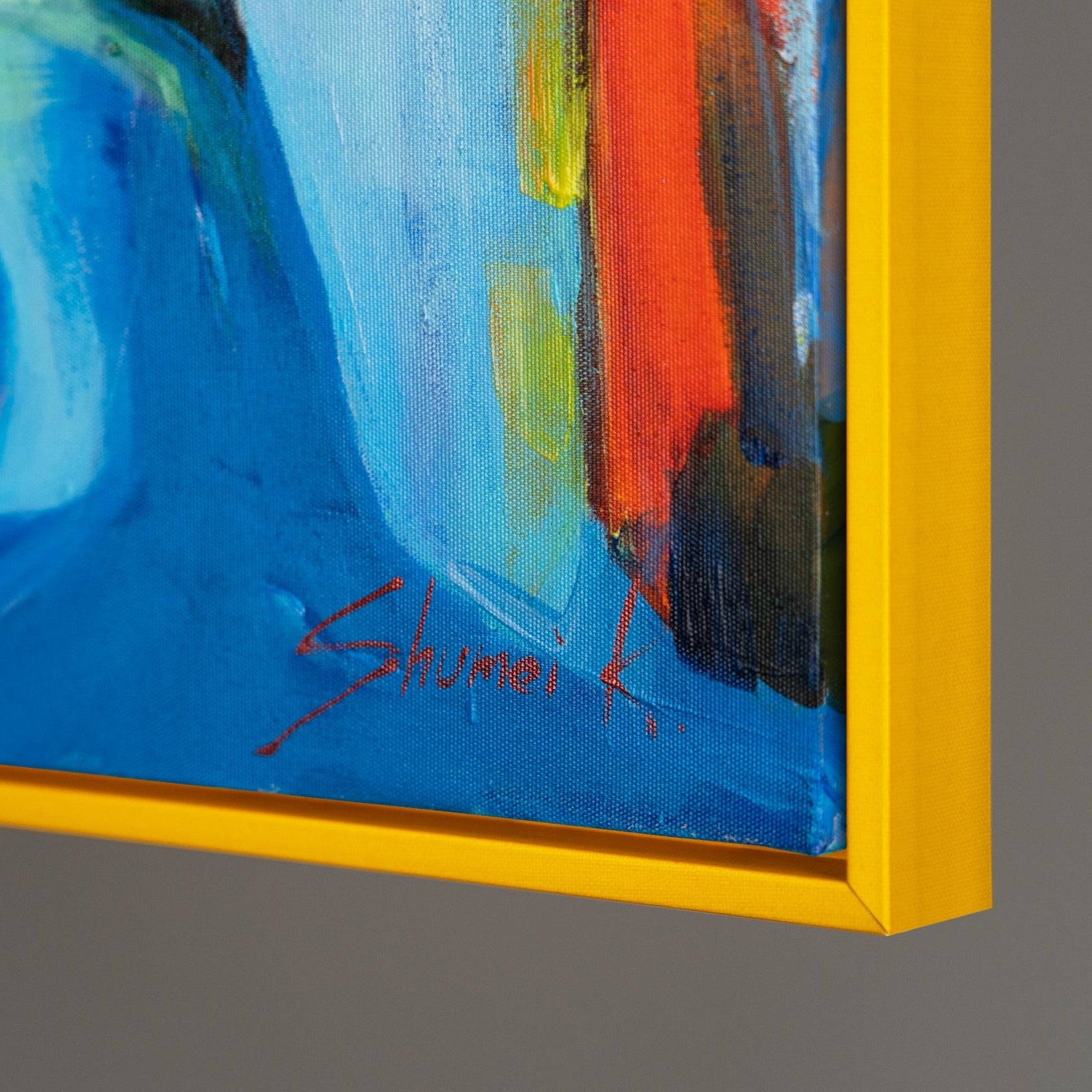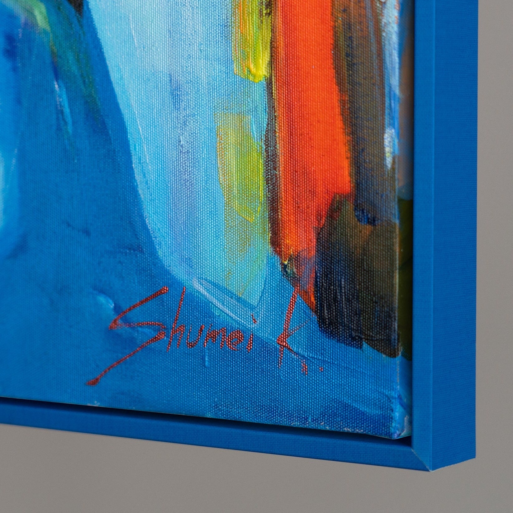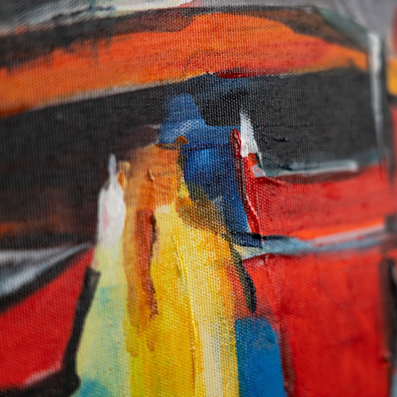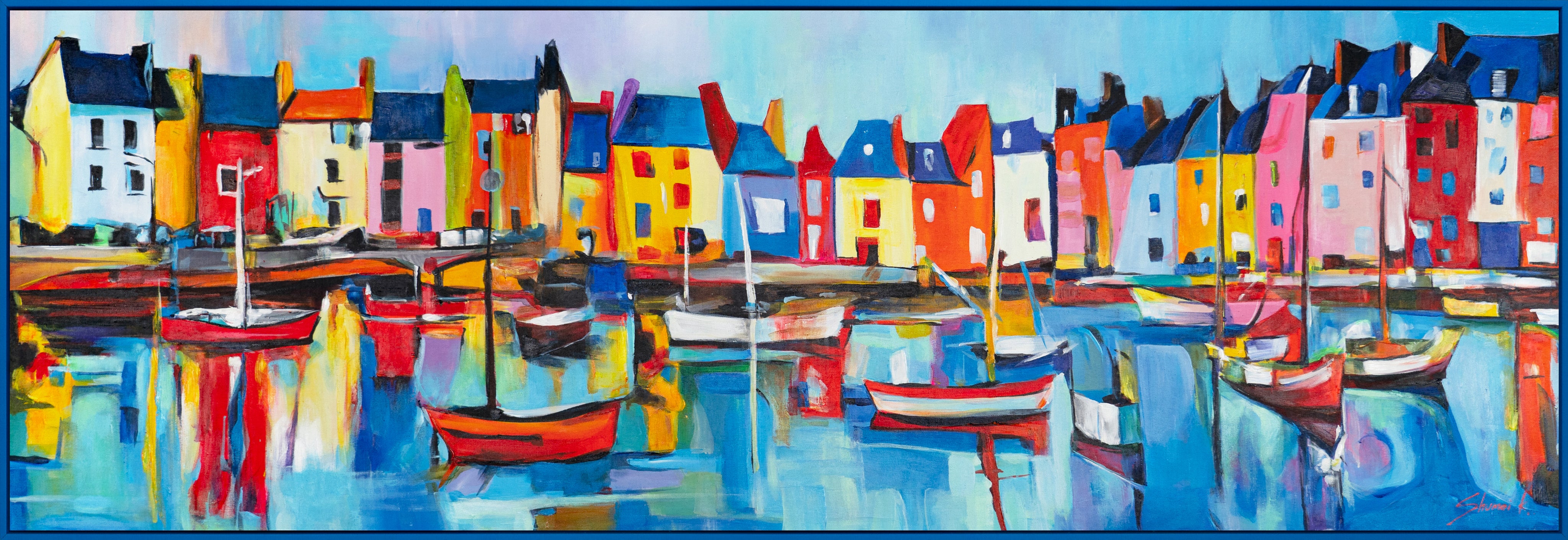 Bereichern Sie Ihr Zuhause oder Büro mit diesem farbenfrohen, abstrakten Kunstwerk, das durch lebhafte Farben eine malerische Hafenszene darstellt. Das Bild besticht durch kräftige Kontraste und ausdrucksstarke Pinselstriche. Es ist 100% handgemalt und wird durch einen eleganten blauen Rahmen hervorgehoben.