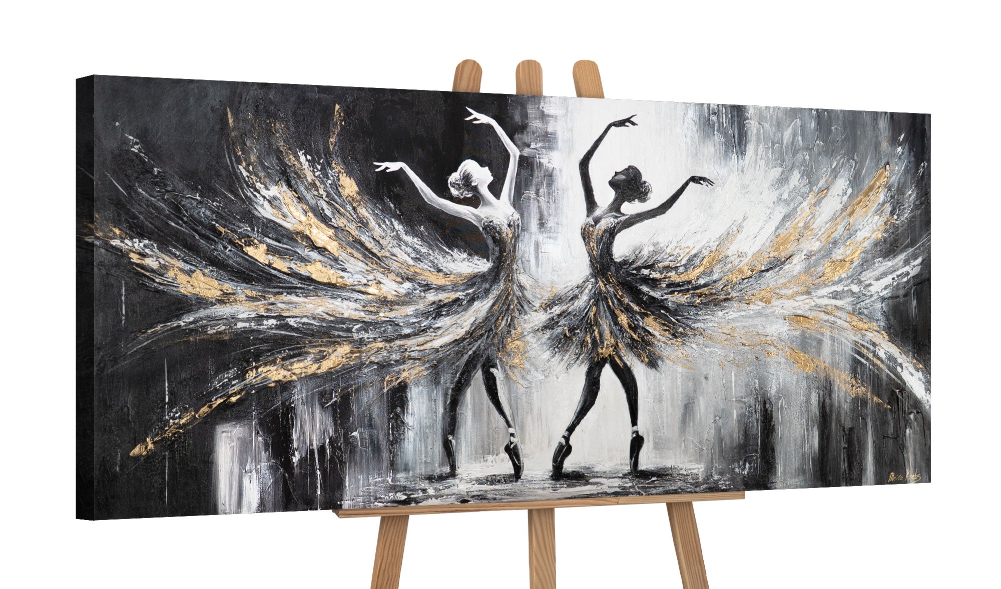 „Die Brillanz des Balletts“ ist ein handgemaltes Acrylbild, das zwei tanzende Diven in dynamischer Bewegung zeigt. Schwungvolle Pinselstriche in Schwarz, Weiß, Grau und Gold erzeugen eine abstrakte Komposition, die Anmut und Energie vereint.