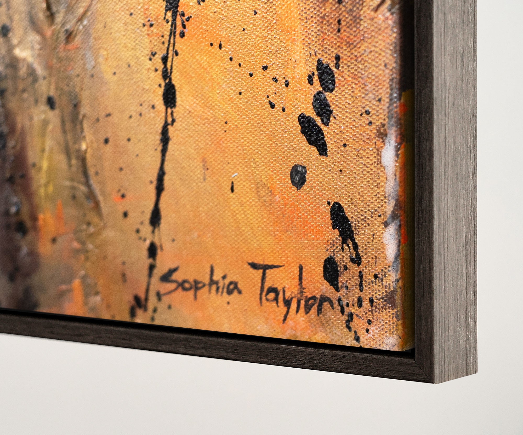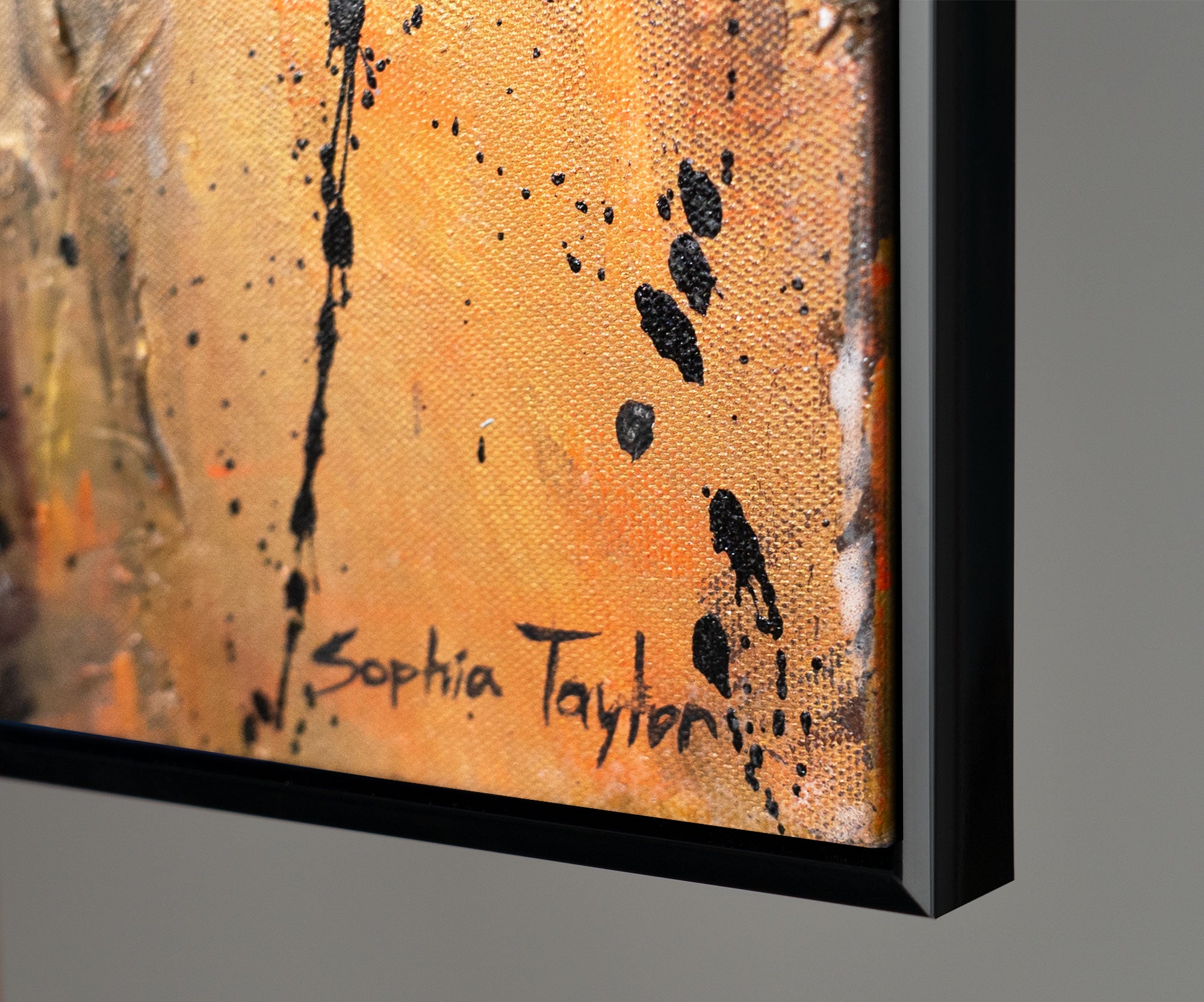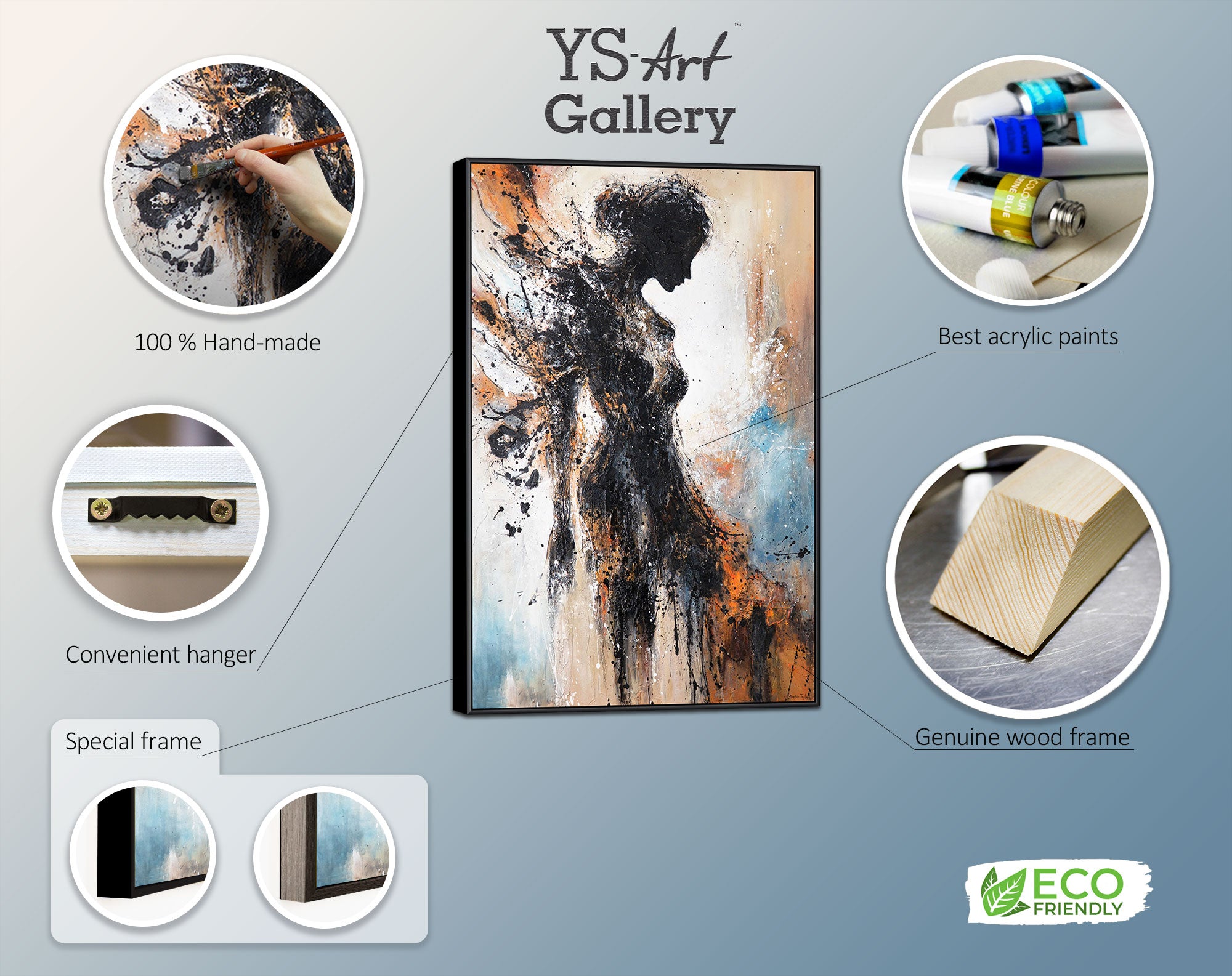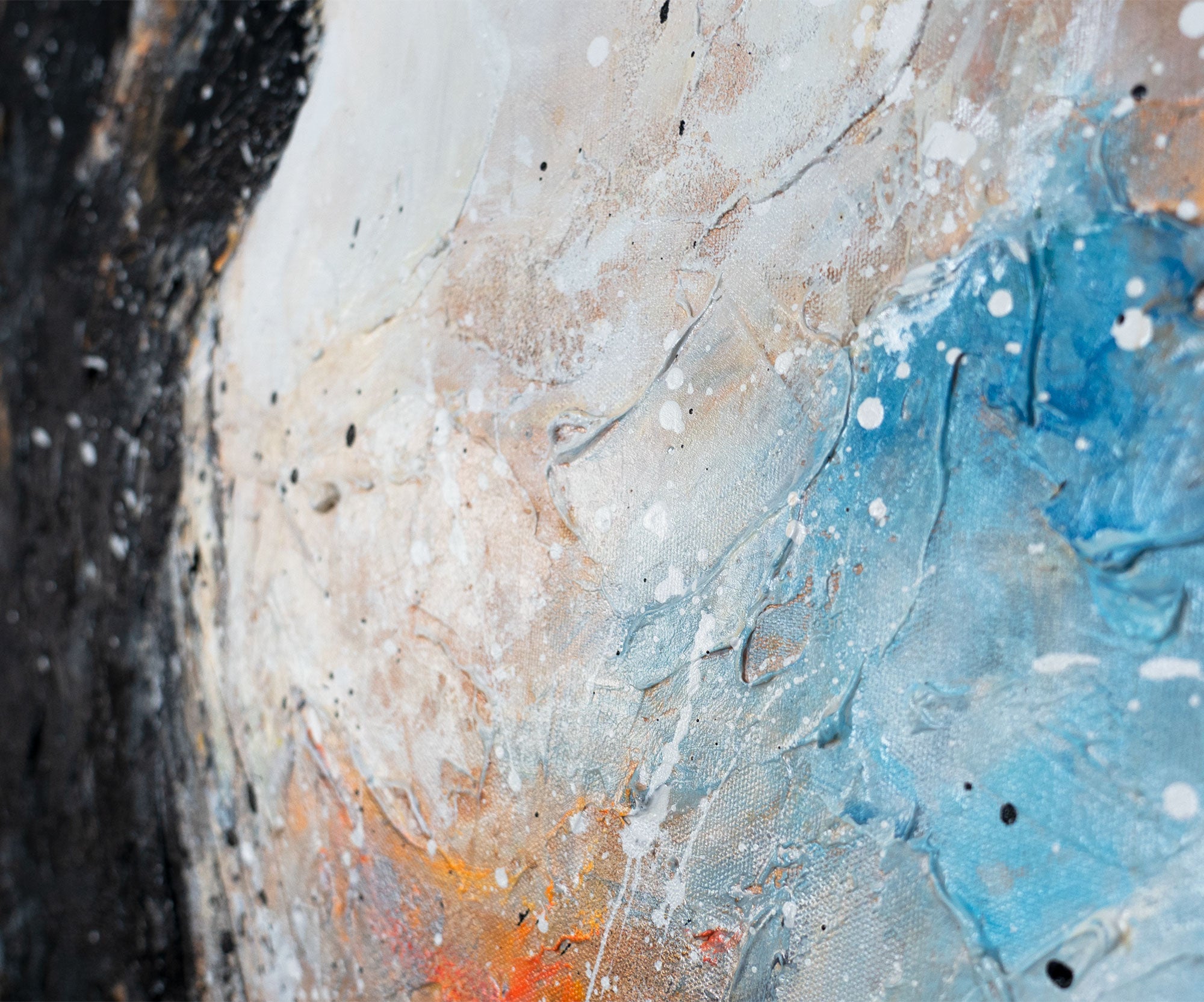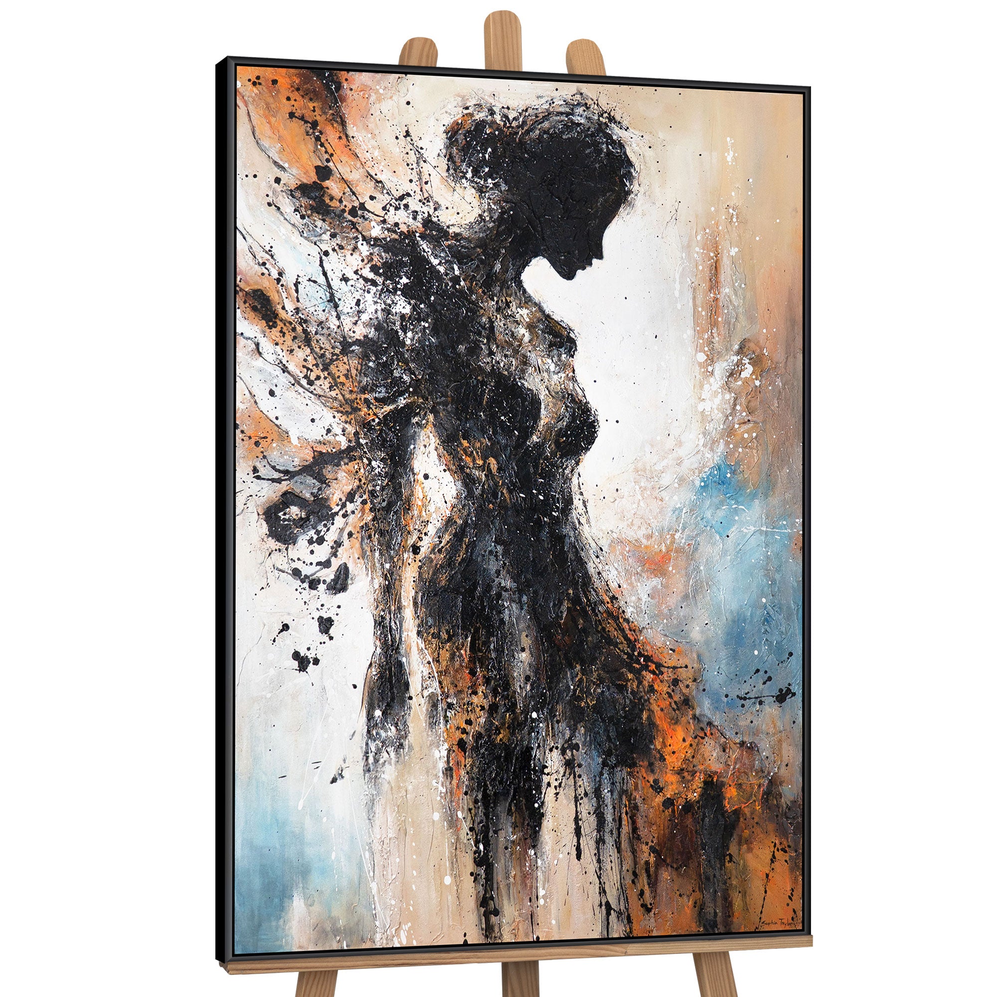 Das handgemalte Acrylbild „Feurige Silhouette“ auf Leinwand zeigt eine dynamische Figur, umgeben von intensiven Farbspritzern in Schwarz, Orange und Blau. Die kraftvolle Komposition verbindet Textur und Farbe zu einem ausdrucksstarken Kunstwerk voller Energie und Tiefe.