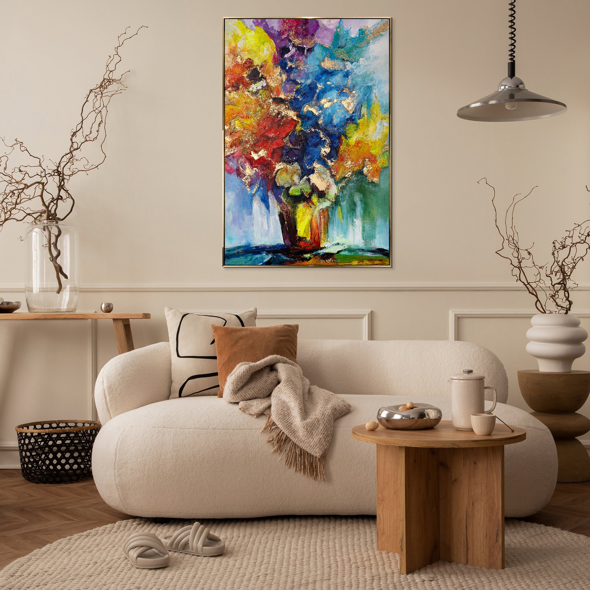 Bereichern Sie Ihr Zuhause mit diesem farbenfrohen, abstrakten Kunstwerk, das die Schönheit der Natur in lebendigen Farben darstellt. Das Bild besticht durch intensive Farbtöne und ausdrucksstarke Pinselstriche. Es ist 100% handgemalt und wird durch einen eleganten Rahmen hervorgehoben.