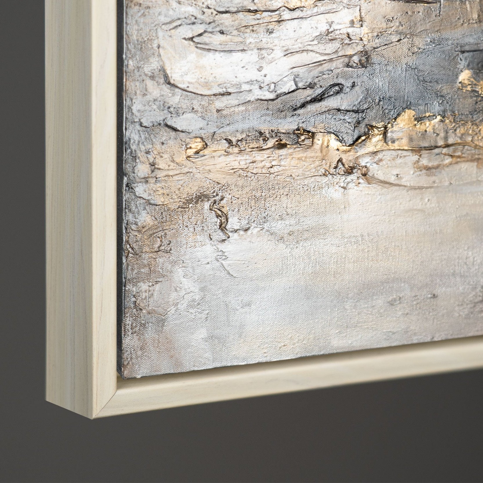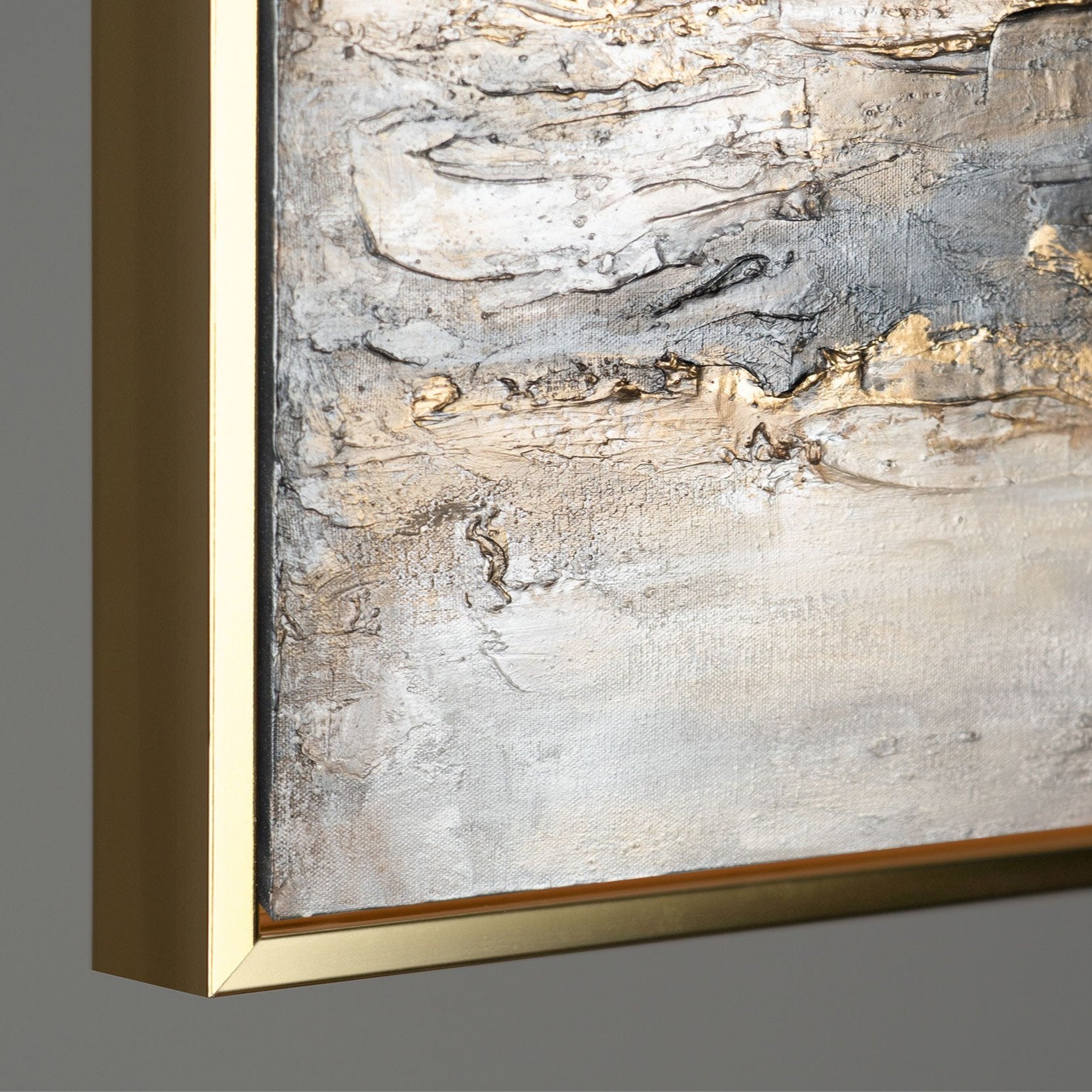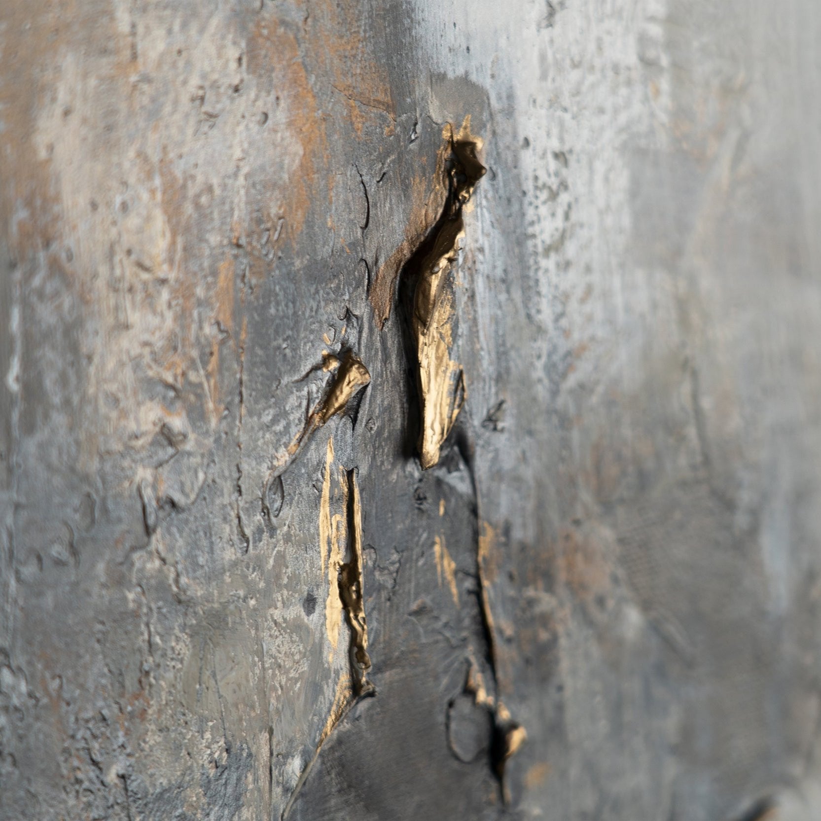 • Nahaufnahme eines handgemalten abstrakten Kunstwerks mit goldenen und grauen Texturen, moderne Wanddekoration