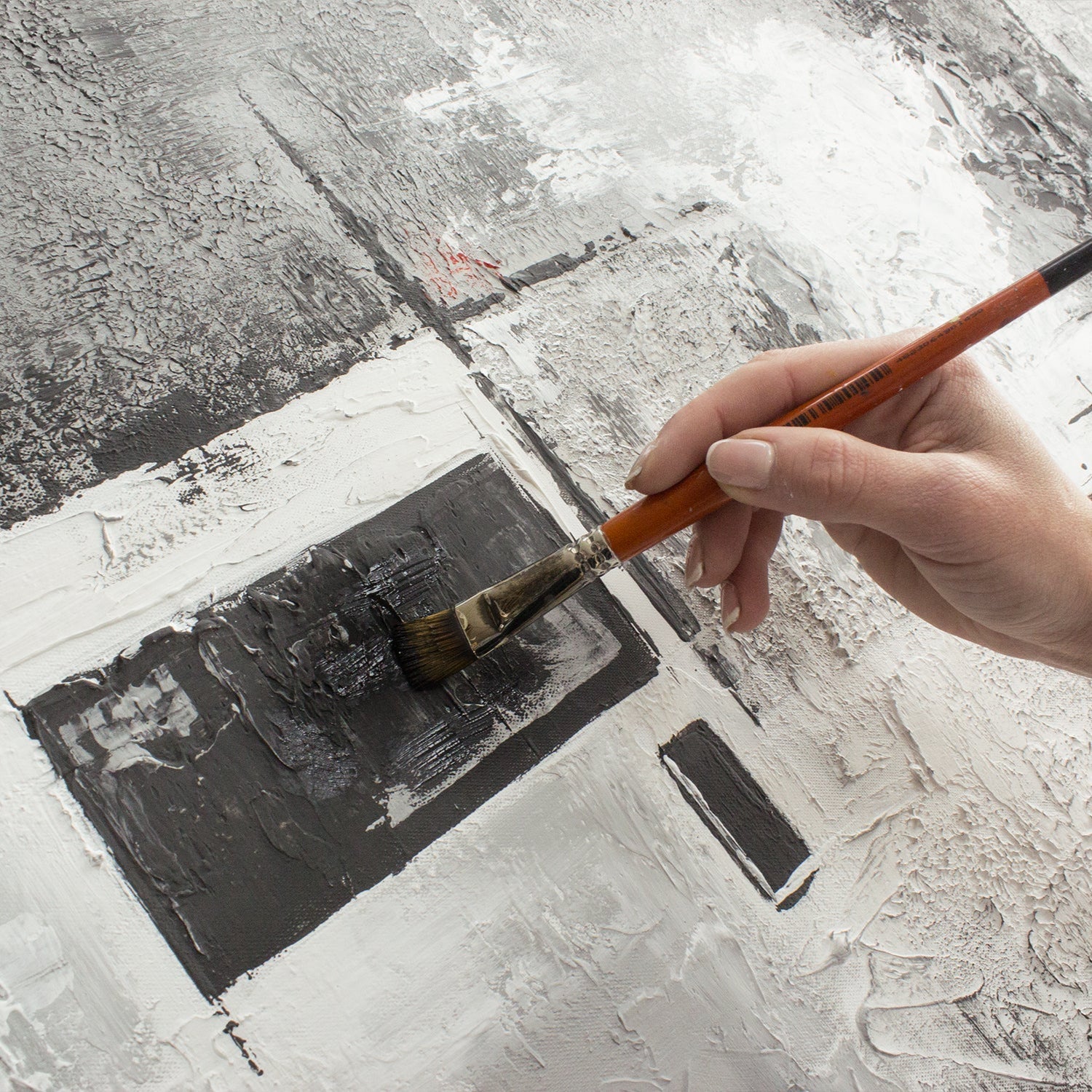 Dynamisch, kantig, kompromisslos – das abstrakte Leinwandbild „Courage“ ist ein visuelles Statement. Die Komposition aus Schwarz, Grau und Weiß wird durch leuchtend rote Linien und Farbspritzer aufgebrochen, die wie emotionale Ausbrüche über die Fläche tanzen. Geometrische Flächen treffen auf expressive Spontaneität, feine Linien auf raue Textur – ein kontrastreiches Spiel, das Spannung und Kraft ausstrahlt.