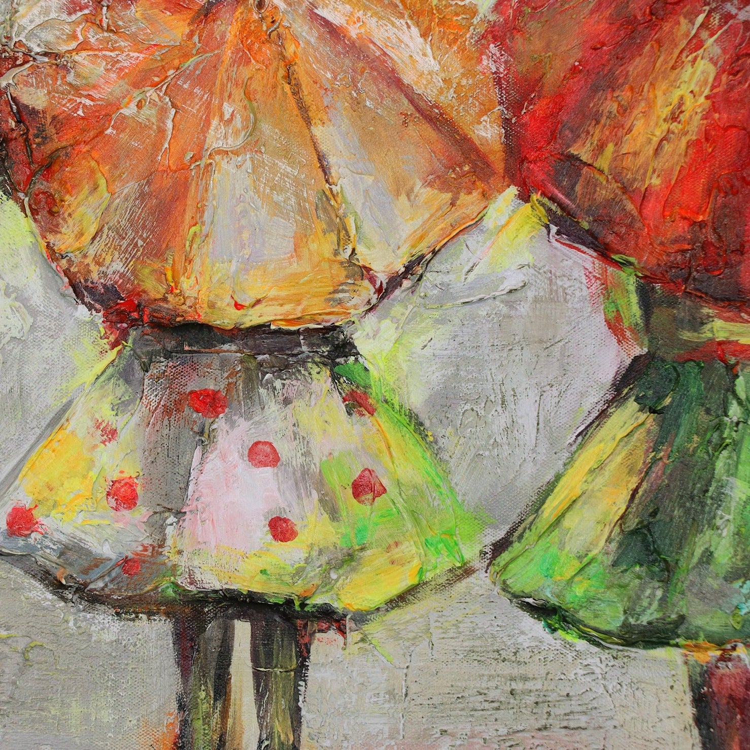 Was verbinden die meisten Menschen mit Sommerregen? Mit Frische, Kühle an einem heißen Sommertag oder Gemütlichkeit und etwas melancholischer Stimmung im Herbst. Dieses Bild vermittelt perfekt die Stimmung einer regnerischen, aber gemütlichen und leicht frischen Atmosphäre. Das Positive im keilrahmenbilder groß wird durch diese drei hellen kleinen Regenschirme hinzugefügt.