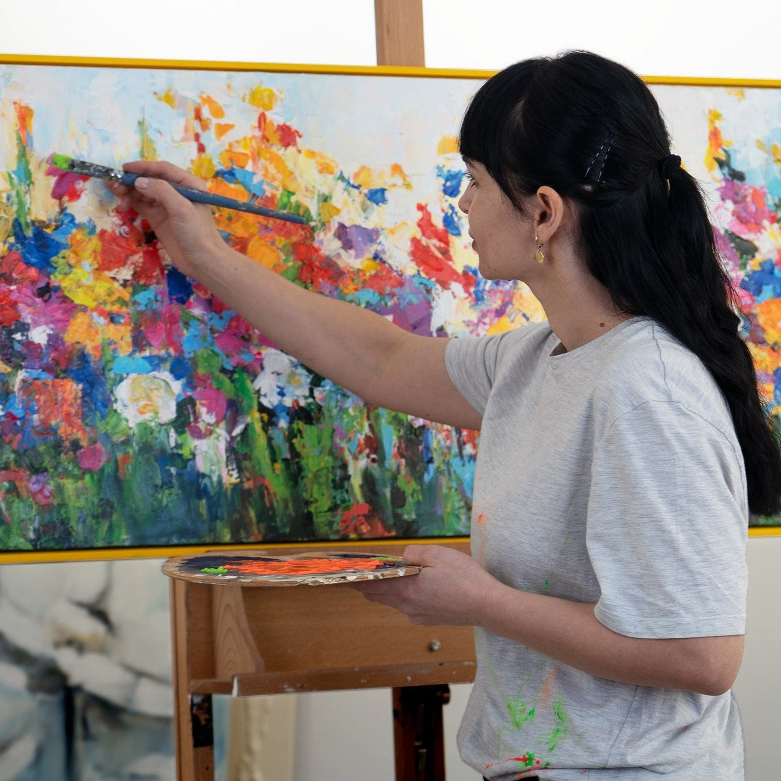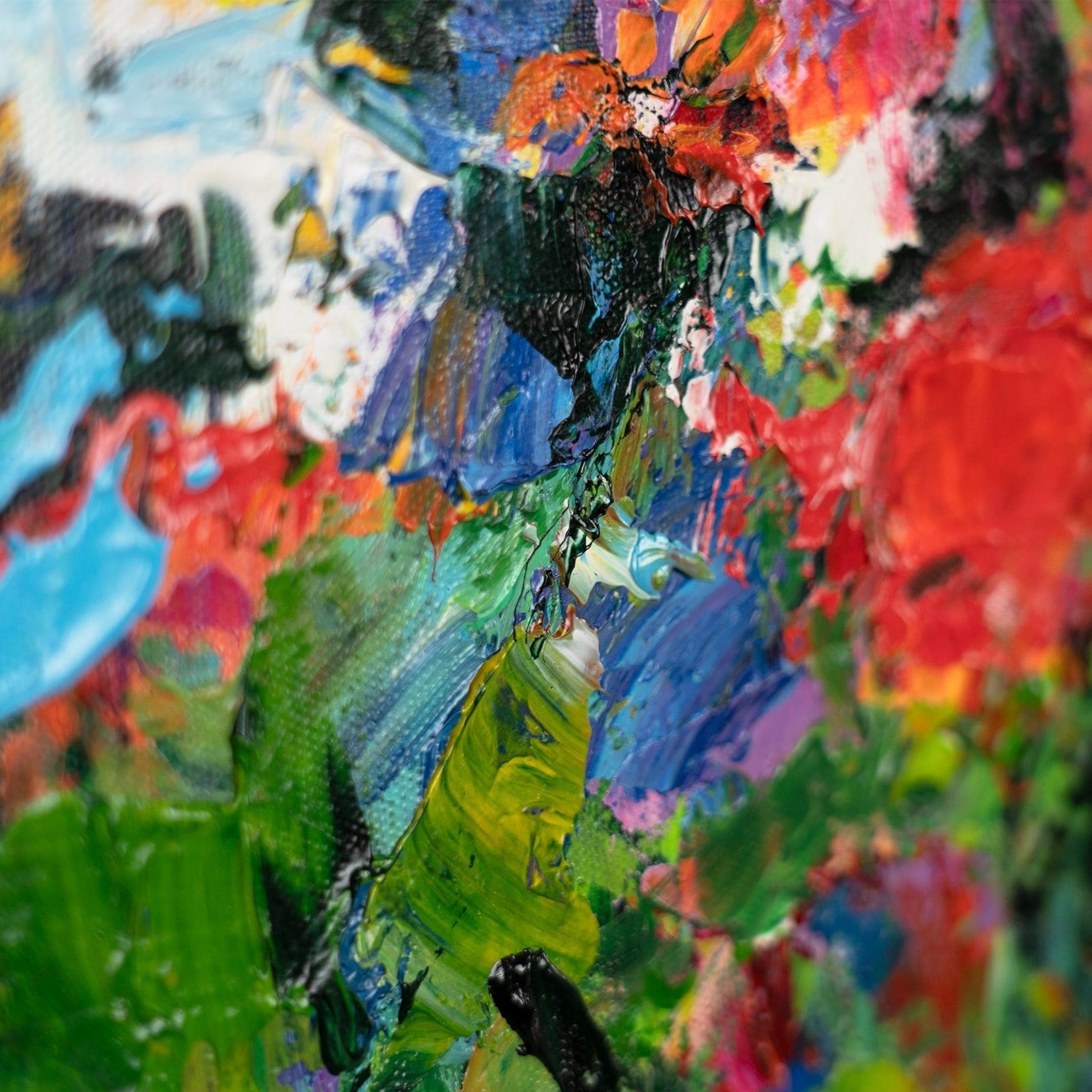 Bereichern Sie Ihr Zuhause oder Büro mit diesem farbenfrohen, abstrakten Kunstwerk, das einen lebhaften Wirbelwind aus Feldblumen in bunten Farben darstellt. Das Bild besticht durch kräftige Farbtöne und ausdrucksstarke Pinselstriche. Es ist 100% handgemalt und wird durch einen eleganten Rahmen hervorgehoben.
