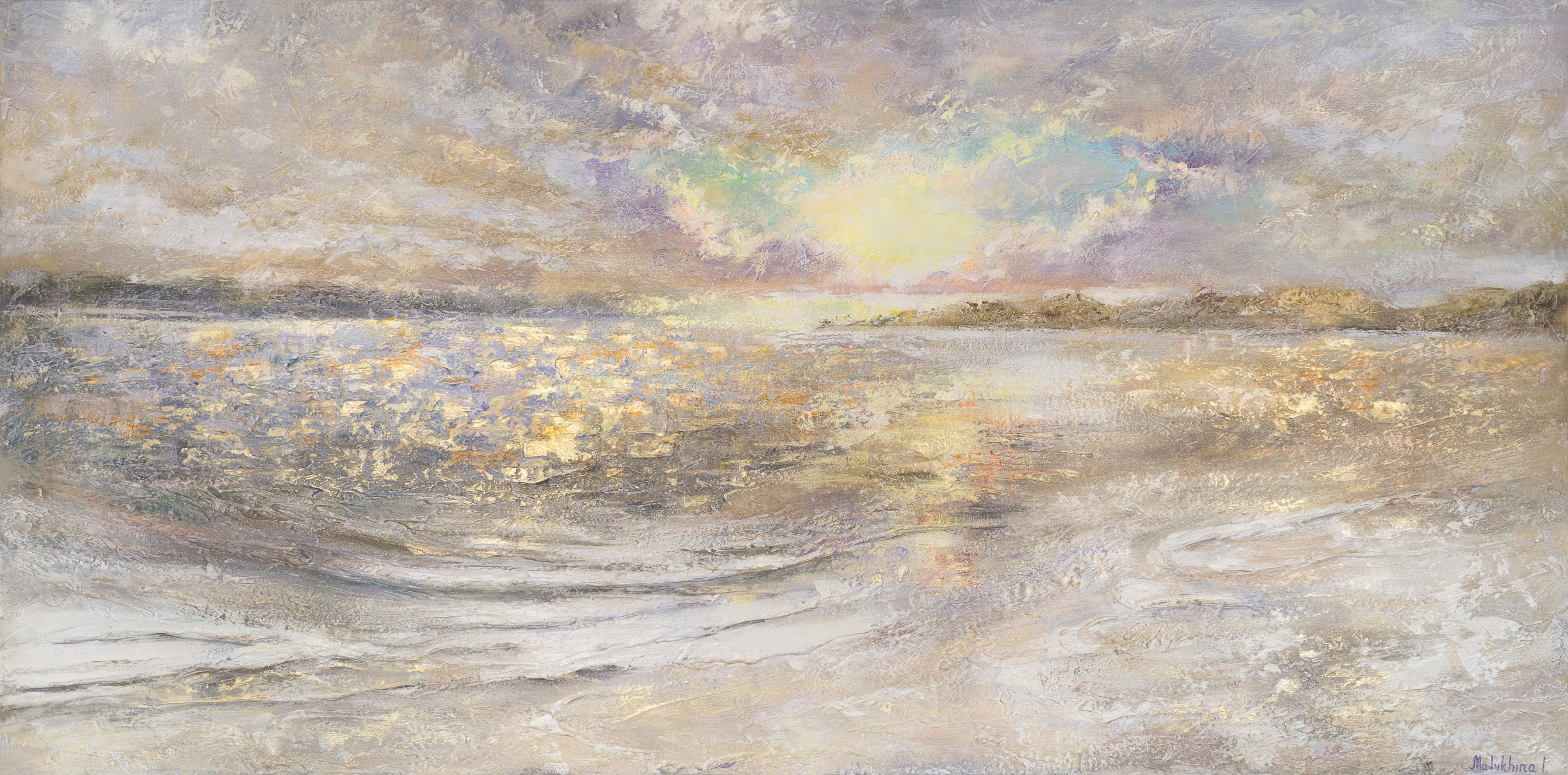 Das handgemalte Acrylbild „Meer Dämmerung“ fängt die ruhige und sanfte Stimmung einer Meeresküste bei Dämmerung ein. Die helle, pastellige Farbpalette mit zarten Goldakzenten erzeugt eine harmonische Atmosphäre, die den Raum mit Ruhe und Eleganz erfüllt. Die strukturierte Oberfläche des Leinwandbildes verleiht der Komposition Tiefe und Lebendigkeit, die das Meer zum Leben erweckt.