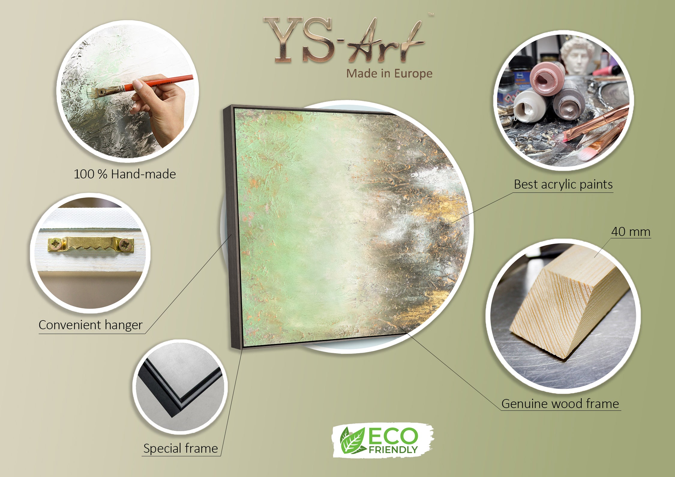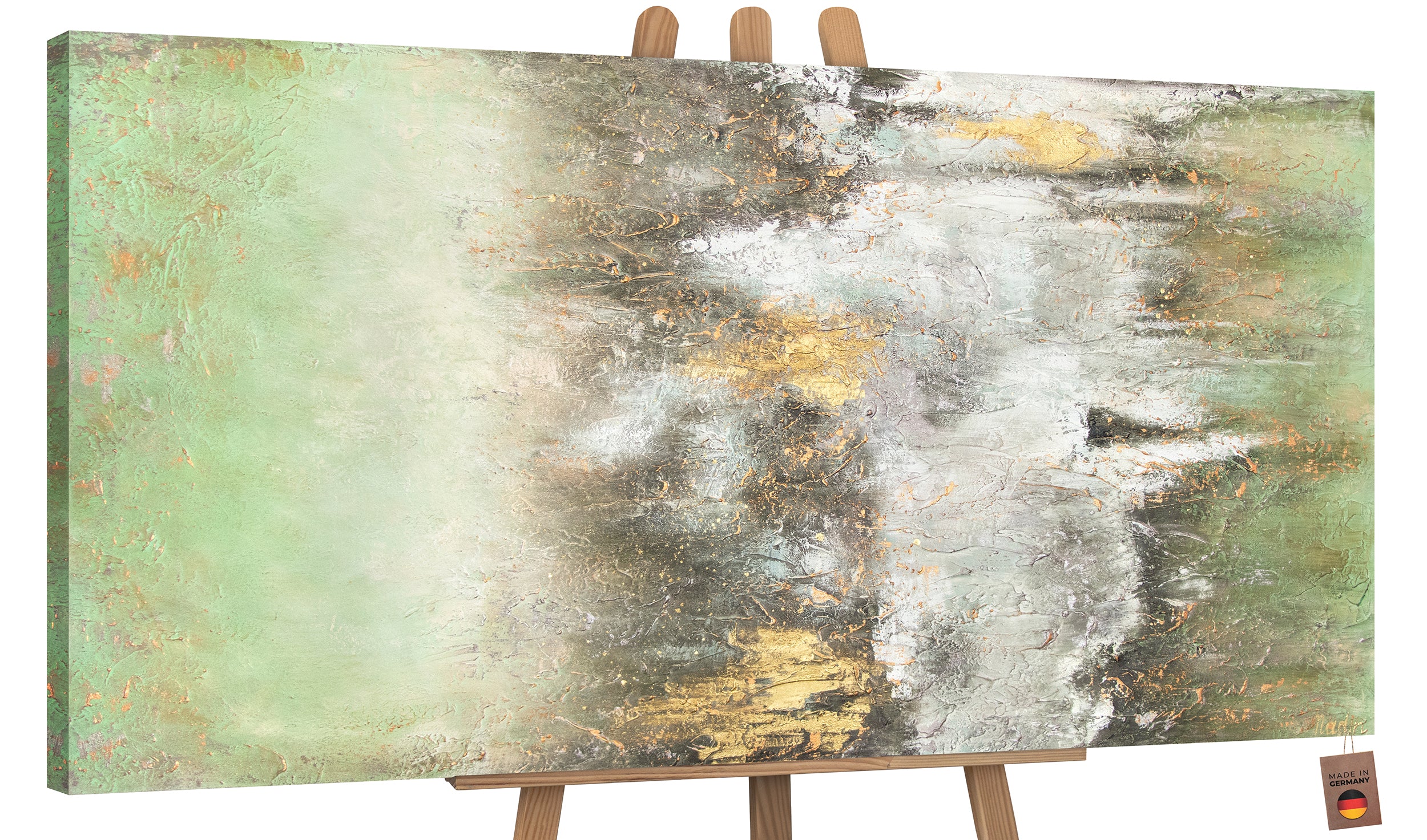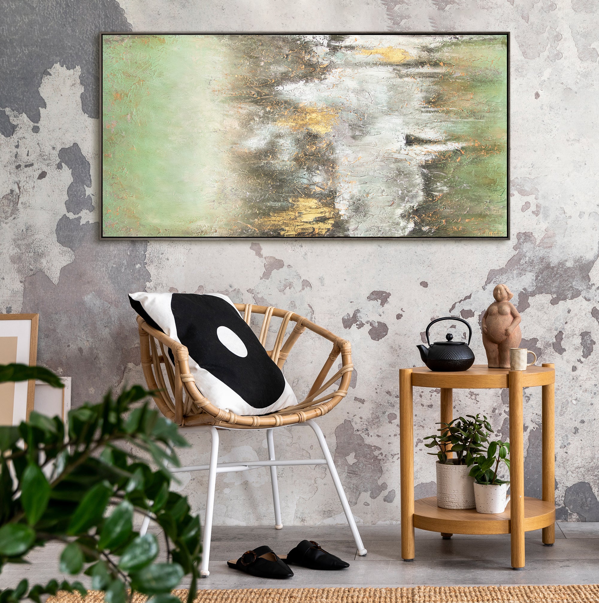 Gemälde im Stile der Abstraktion in einem grünen Farbton ist eine gute Ergänzung des Interieurs im Minimalismus oder aber auch Loft- oder Klassikstil. Aufgrund des angenehmen Farbschemas sieht das Gemälde auch im Büro gut aus. Die Grüne Farbe fördert dabei die Konzentration und die Abstraktion fördert die Kreativität.