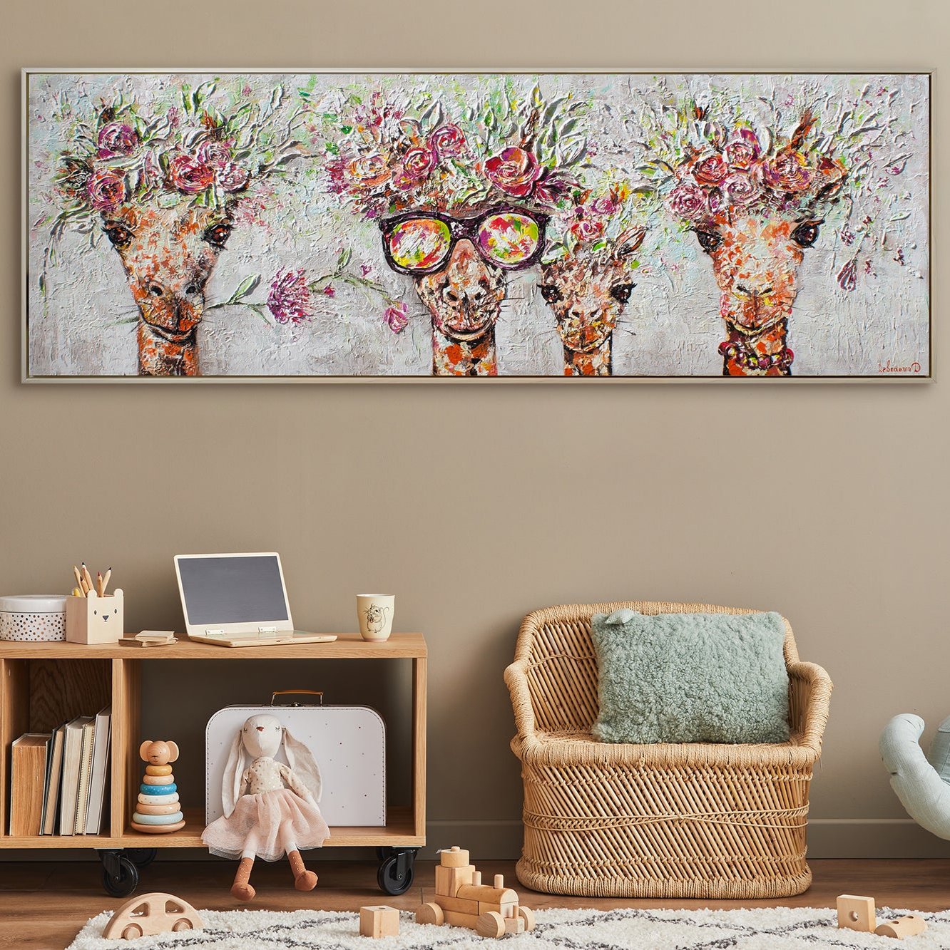 Dieses handgemalte Acrylbild auf Leinwand bringt eine fröhliche und farbenfrohe Atmosphäre in Ihr Zuhause. Drei Giraffen mit Blumenkränzen und eine davon mit Sonnenbrille verleihen diesem modernen Kunstwerk einen einzigartigen Charme. Die lebendigen Farben und die kreative Gestaltung machen dieses Gemälde zu einem echten Blickfang in jedem Raum.