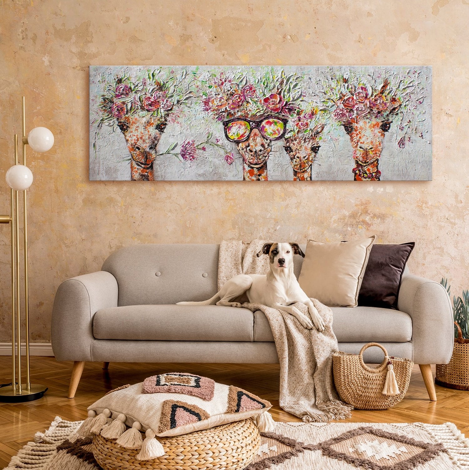• Acrylbilder Tiere – Moderne Kunstwerke auf Leinwand, Handgemalte Giraffen mit Blumenkränzen