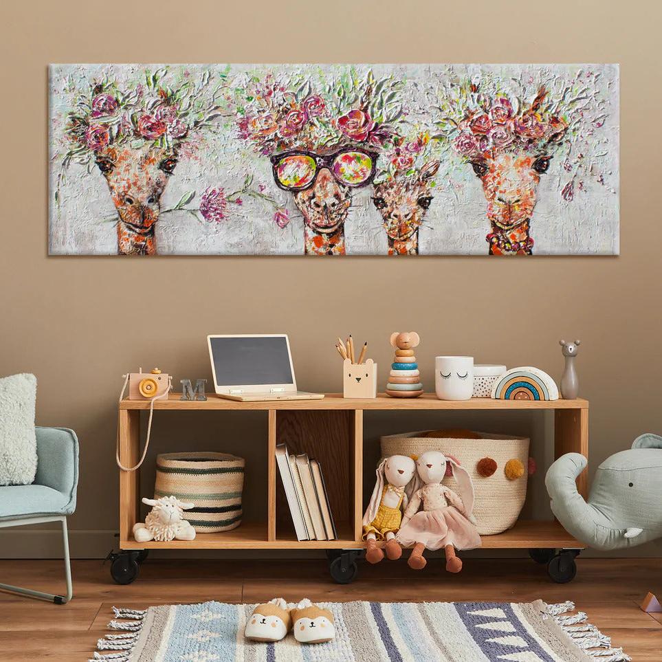 Acrylbilder Tiere – Moderne Kunstwerke auf Leinwand, Handgemalte Giraffen mit Blumenkränzen