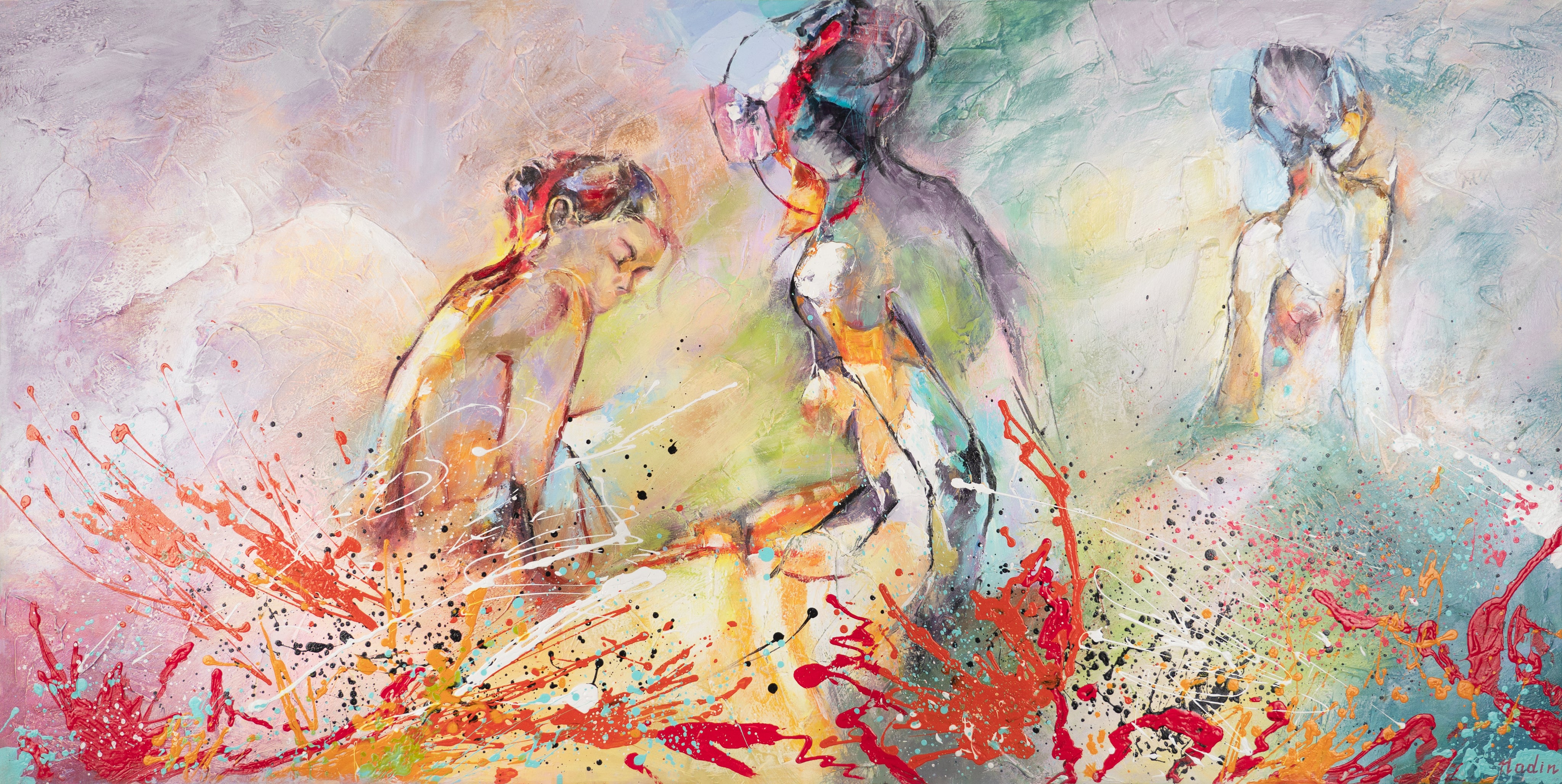 Dieses handgemalte Acrylbild auf Leinwand bringt pure Energie und sommerliche Hitze an Ihre Wand. Drei feminine Silhouetten – flüchtig, sinnlich und zugleich kraftvoll – tauchen aus einem farbintensiven Hintergrund auf. Leuchtendes Rot, sattes Orange und kühles Lila treffen in dynamischen Pinselbewegungen aufeinander, während lebendige Spritztechniken die expressive Komposition betonen. Die Komposition lebt vom Wechselspiel aus fließenden Linien und impulsiven Farbausbrüchen, die an emotionale Momentaufnahmen erinnern.