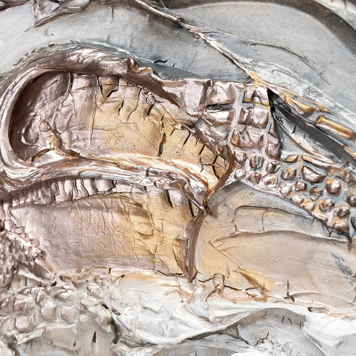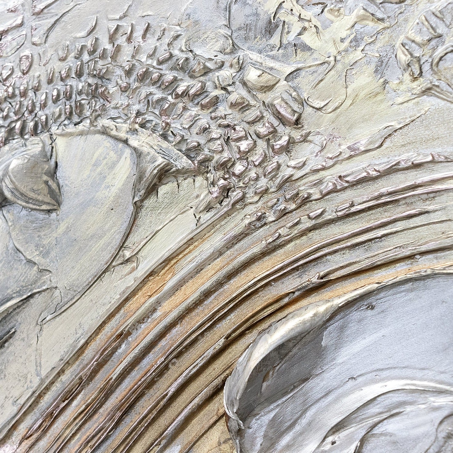 Ein strukturiertes Gemälde mit einer außergewöhnlichen Abstraktion wird genau die richtige Ergänzung zu Ihrem Interieur sein, die Ihre Individualität unterstreicht. Blattgold und ein schöner dunkler Rahmen unterstreicht die Feinheit und Eleganz dieses Kunstwerks.