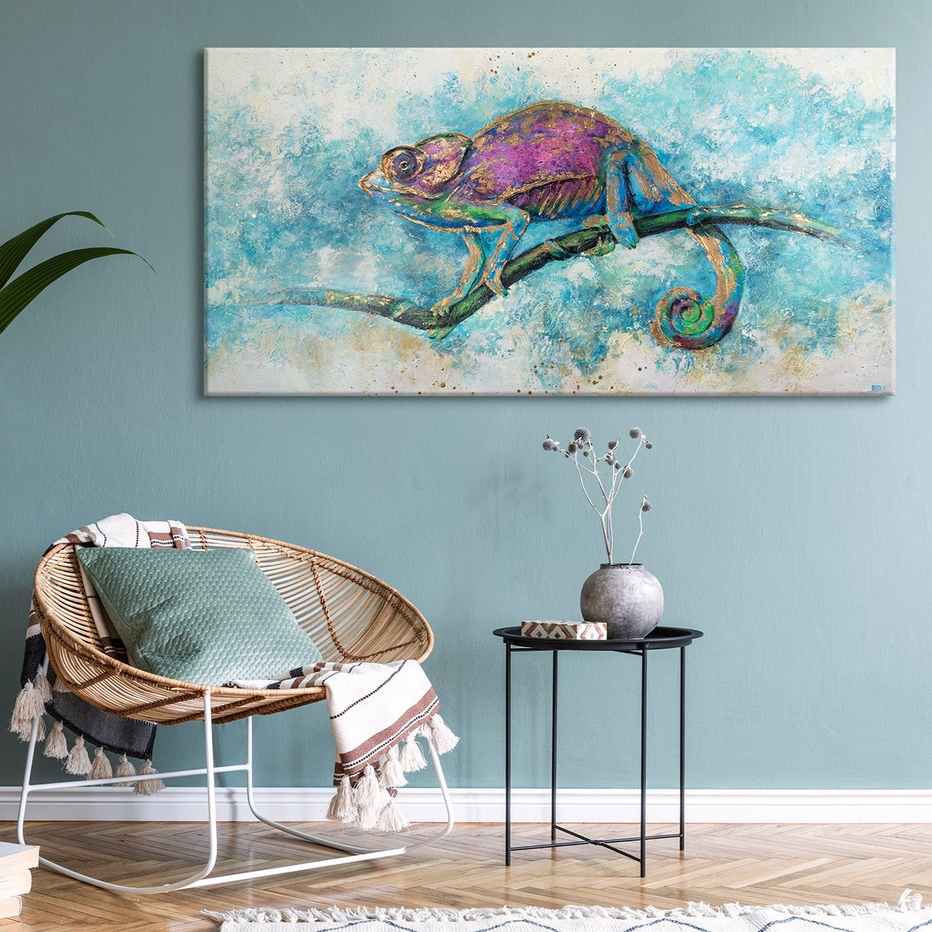 Bereichern Sie Ihre Sammlung mit diesem faszinierenden, handgemalten Chamäleon-Gemälde. Dieses moderne Kunstwerk zeigt ein Chamäleon auf einem Ast, umgeben von einem Hintergrund in blauen und grünen Farbtönen. Die Verwendung von Acrylfarben verleiht dem Bild Tiefe und Textur, wodurch es in jedem Raum zu einem Blickfang wird. Es ist 100% handgemalt und wird durch einen eleganten Rahmen hervorgehoben.