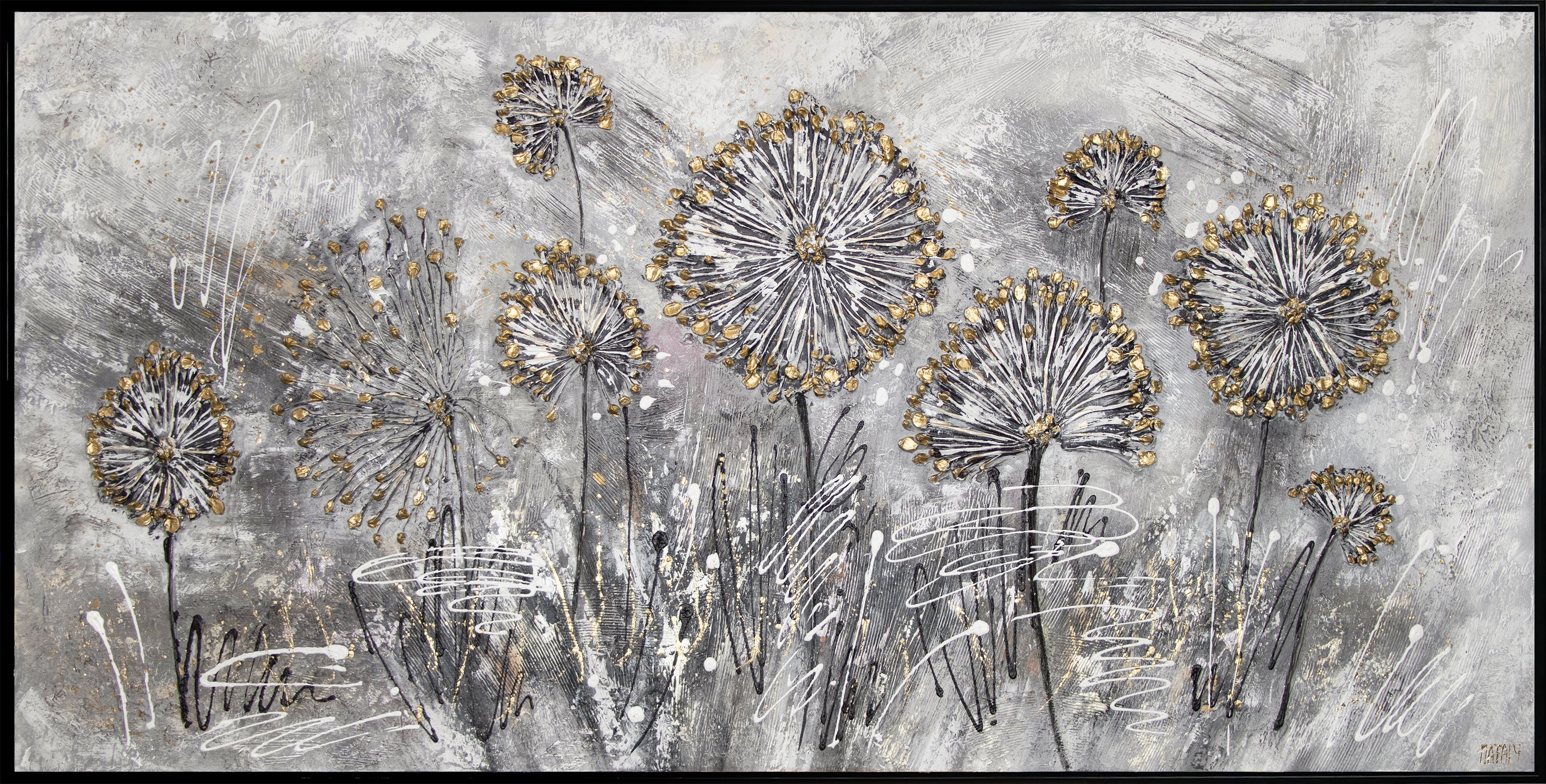 Dieses handgemalte Blumenbild bringt eine stilvolle Eleganz in Ihr Zuhause. Die grauen und goldenen Blüten sind kunstvoll auf die Leinwand gebracht und schaffen eine beruhigende und zugleich beeindruckende Wirkung. Jedes Detail dieses Kunstwerks ist vollständig handgefertigt, wodurch es zu einem echten Unikat wird. Wir bieten Ihnen eine kostenlose Lieferung direkt zu Ihnen nach Hause.