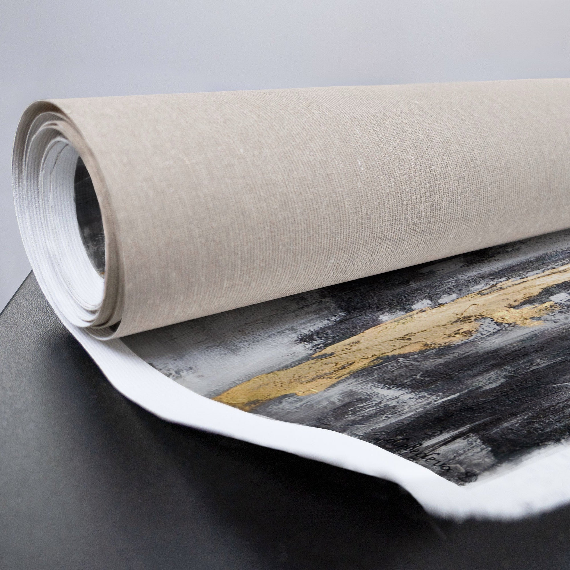 Ein geheimnisvoller Augenblick mitten in der Großstadt – das Leinwandbild „Filmstreifen“ zeigt eine stilvolle Frau mit großem Hut, die durch eine urbane Szenerie schreitet. In monochromer Farbgebung mit Akzenten aus Gold fängt das Motiv eine filmreife Atmosphäre ein. Die handgemalten Pinselstriche schaffen eine strukturierte Oberfläche, die Bewegung und Tiefe suggeriert. Der Kontrast zwischen Schwarz, Weiß und Blattgold verleiht der Szene eine cineastische Anmutung voller Eleganz und Selbstbewusstsein.