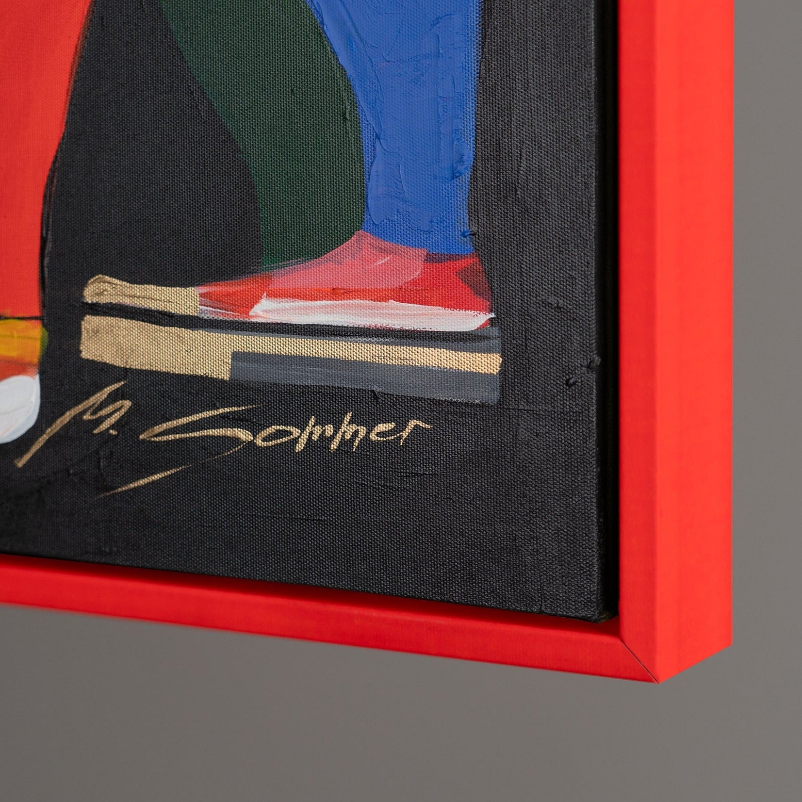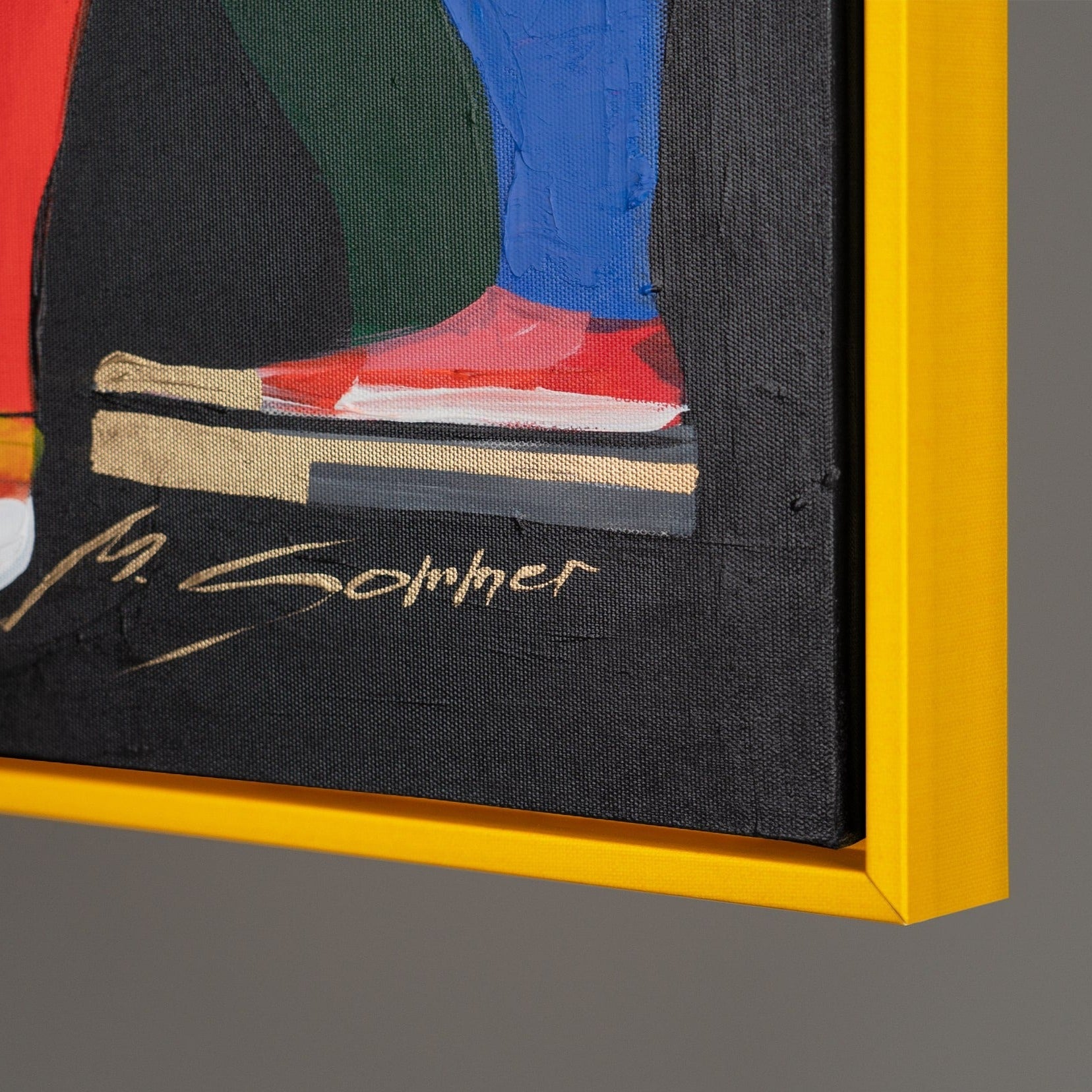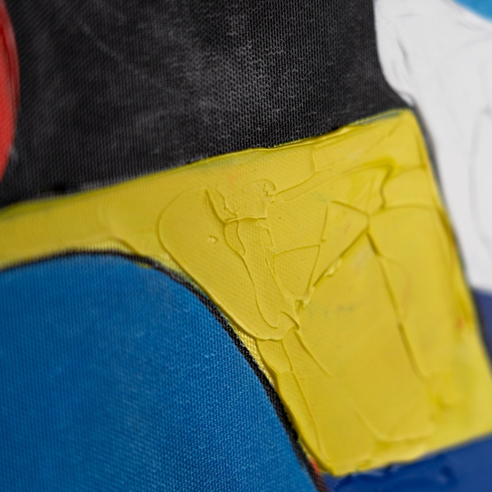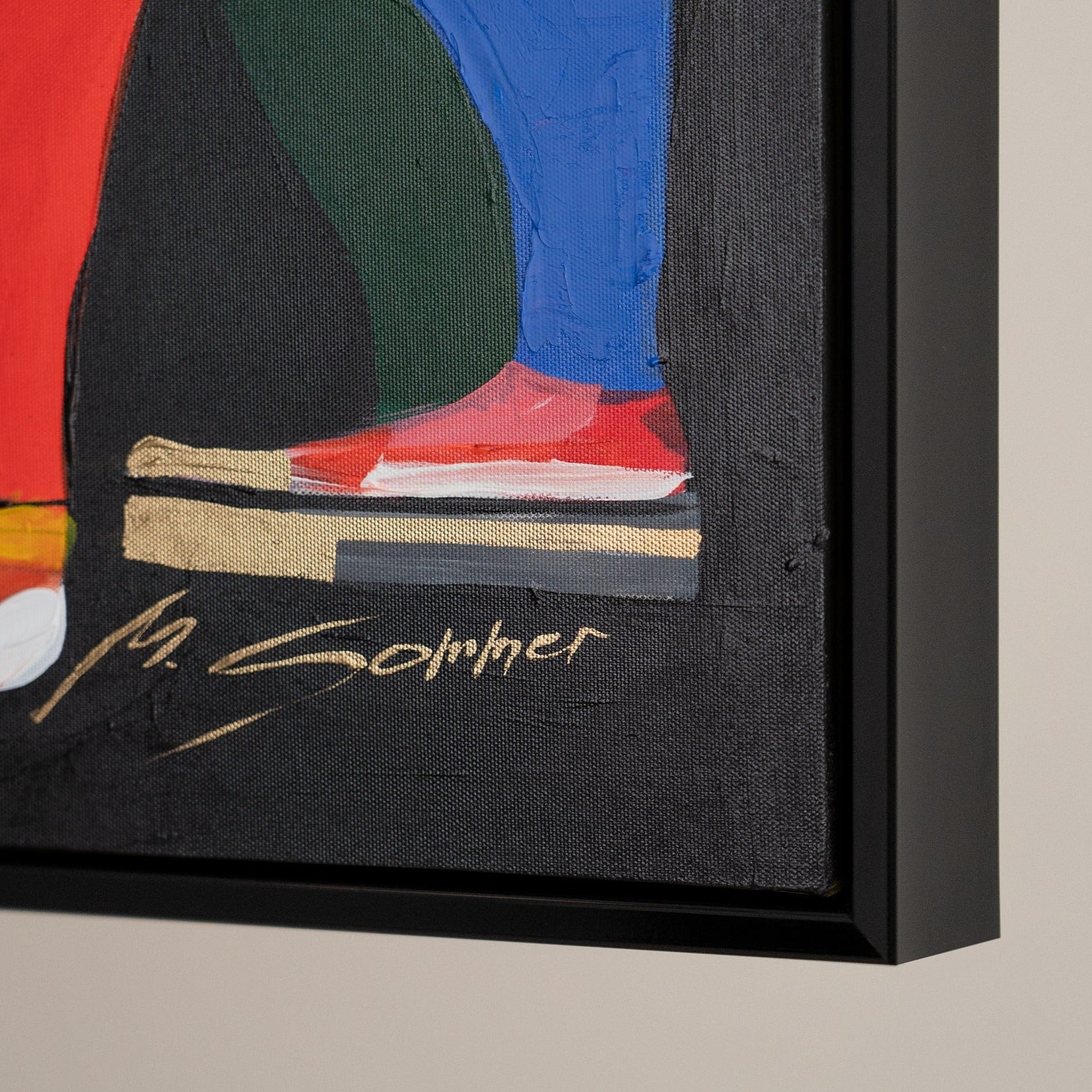 Bereichern Sie Ihr Zuhause oder Büro mit diesem farbenfrohen, abstrakten Kunstwerk, das die Tänze der Farben und Formen in lebhaften Tönen darstellt. Das Bild besticht durch kräftige Farbtöne und ausdrucksstarke Pinselstriche. Es ist 100% handgemalt und wird durch einen eleganten Rahmen hervorgehoben.