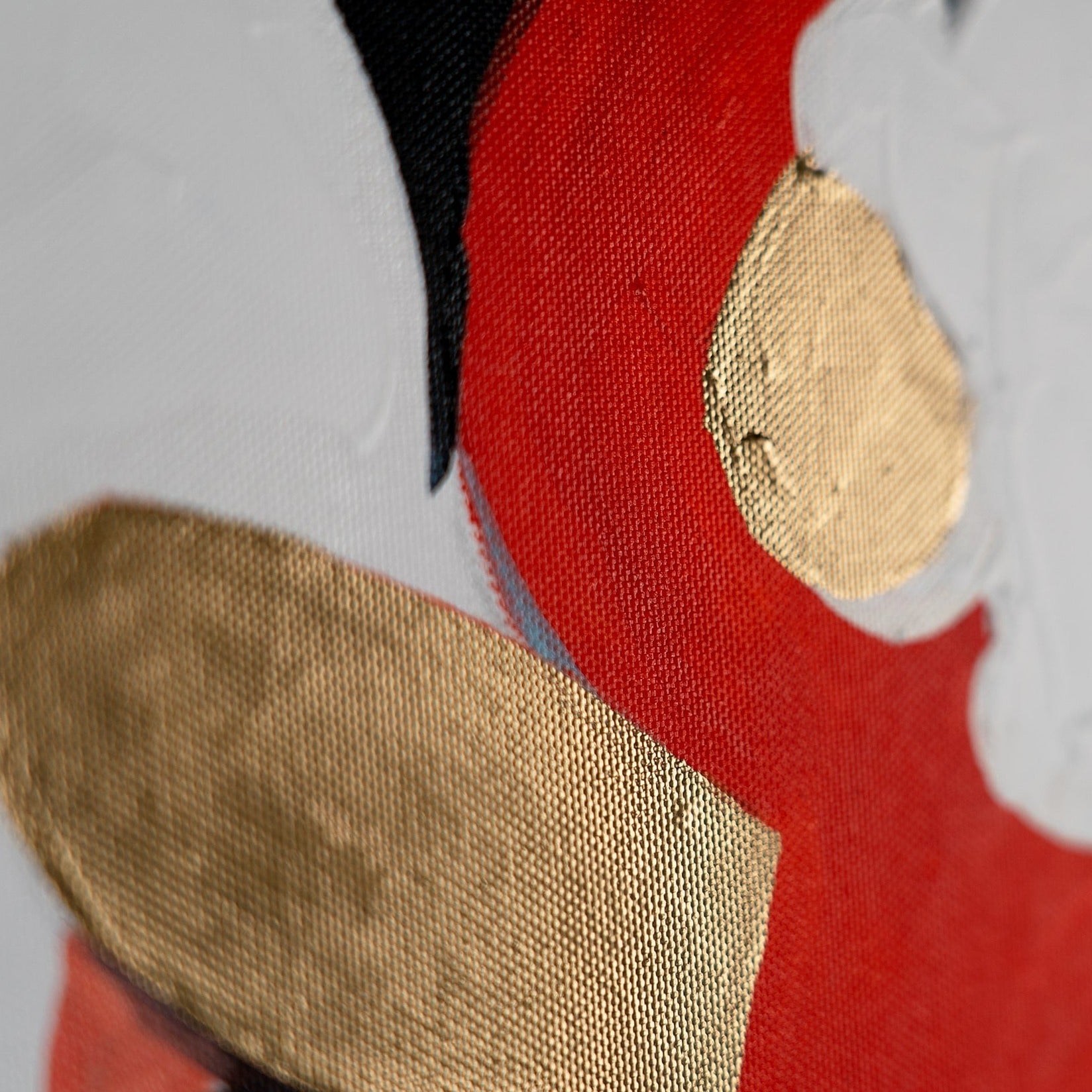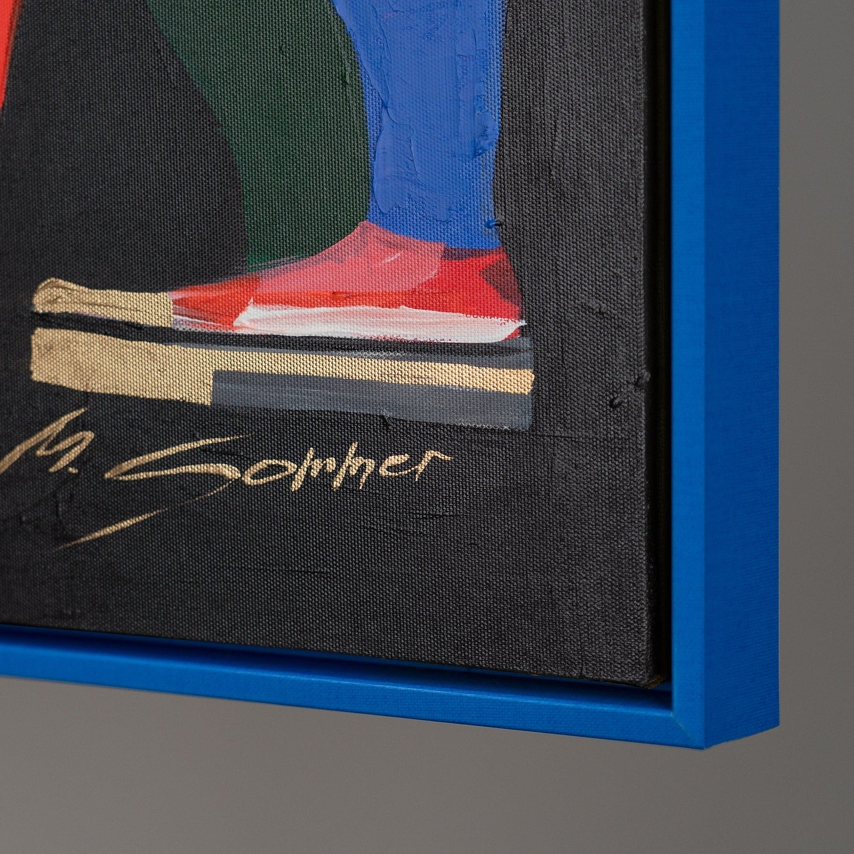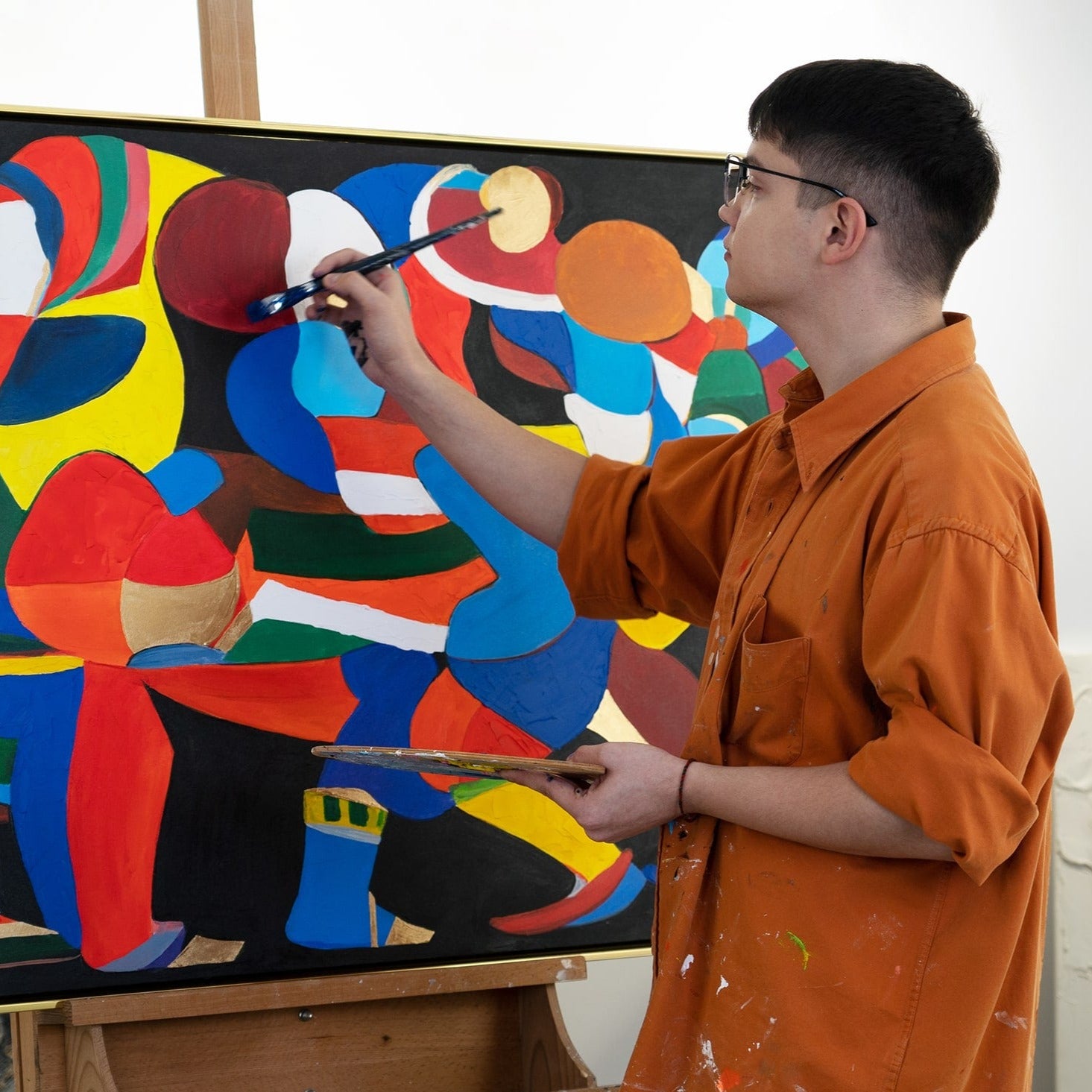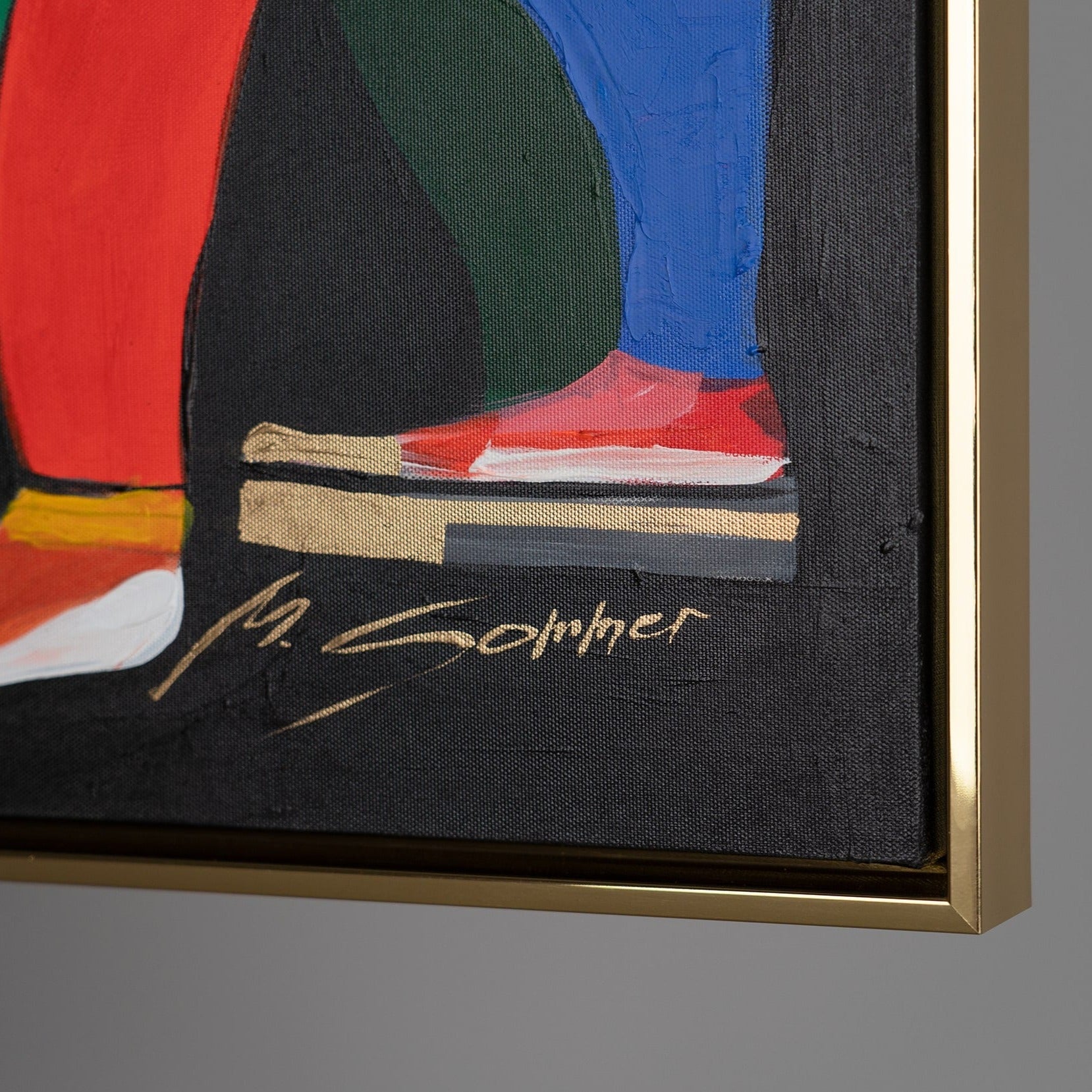 Bereichern Sie Ihr Zuhause oder Büro mit diesem farbenfrohen, abstrakten Kunstwerk, das die Tänze der Farben und Formen in lebhaften Tönen darstellt. Das Bild besticht durch kräftige Farbtöne und ausdrucksstarke Pinselstriche. Es ist 100% handgemalt und wird durch einen eleganten Rahmen hervorgehoben.