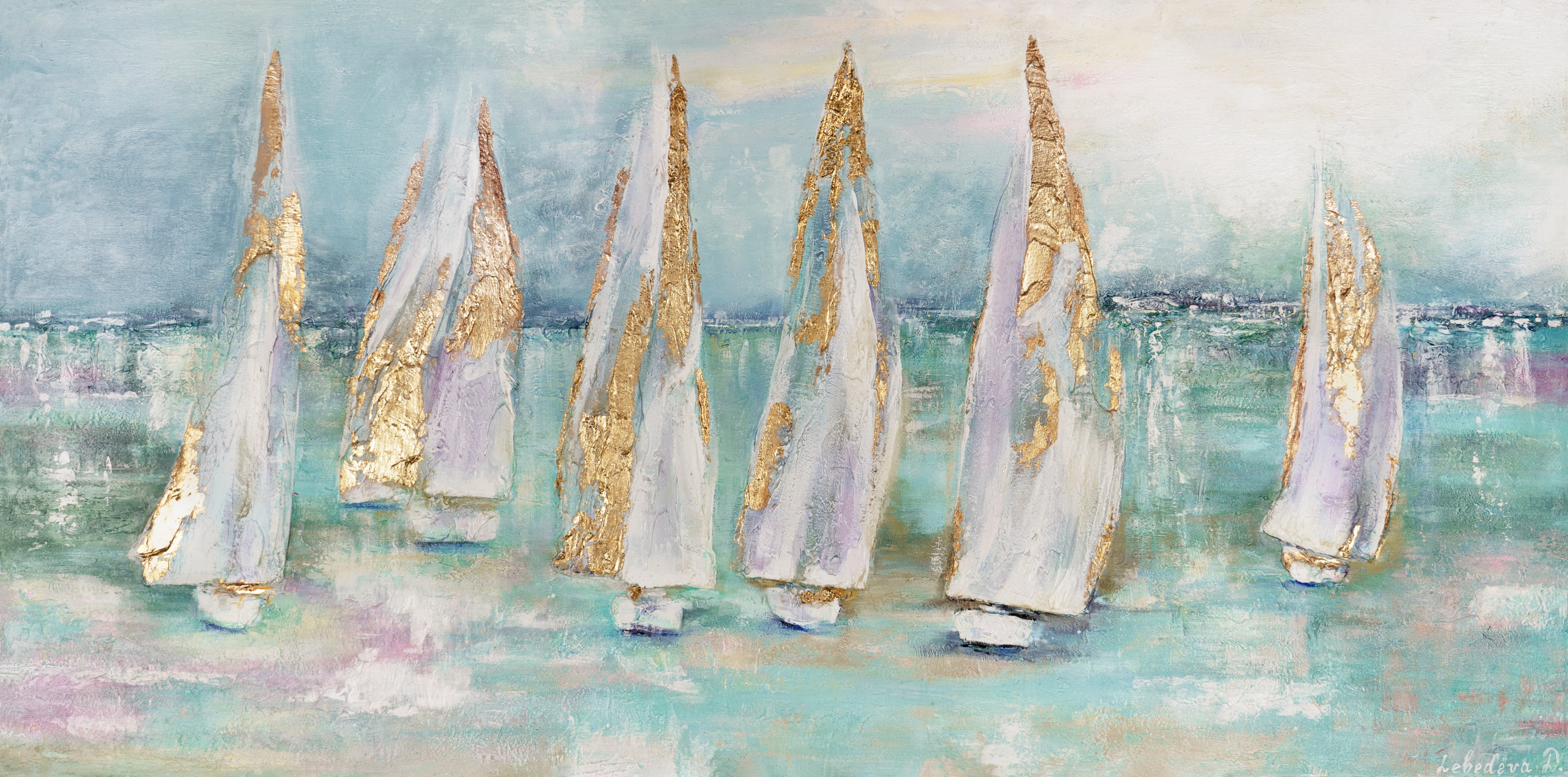 Das handgemalte Acrylbild „Segelboote“ zeigt eine friedliche maritime Szene mit segelnden Booten auf ruhigem Wasser. Die Kombination aus zarten Pastellfarben und goldenen Akzenten erzeugt eine harmonische, beruhigende Atmosphäre. Die lebendige, strukturierte Oberfläche verleiht dem Bild Tiefe und Lebendigkeit, was es zu einem stilvollen Blickfang in jedem Raum macht.