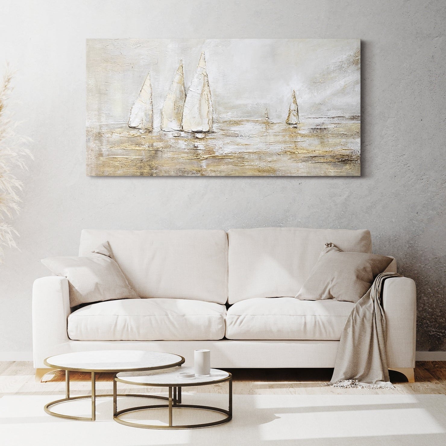 • Acryl Kunstwerk Meer Segelboote Beige Gold Relief