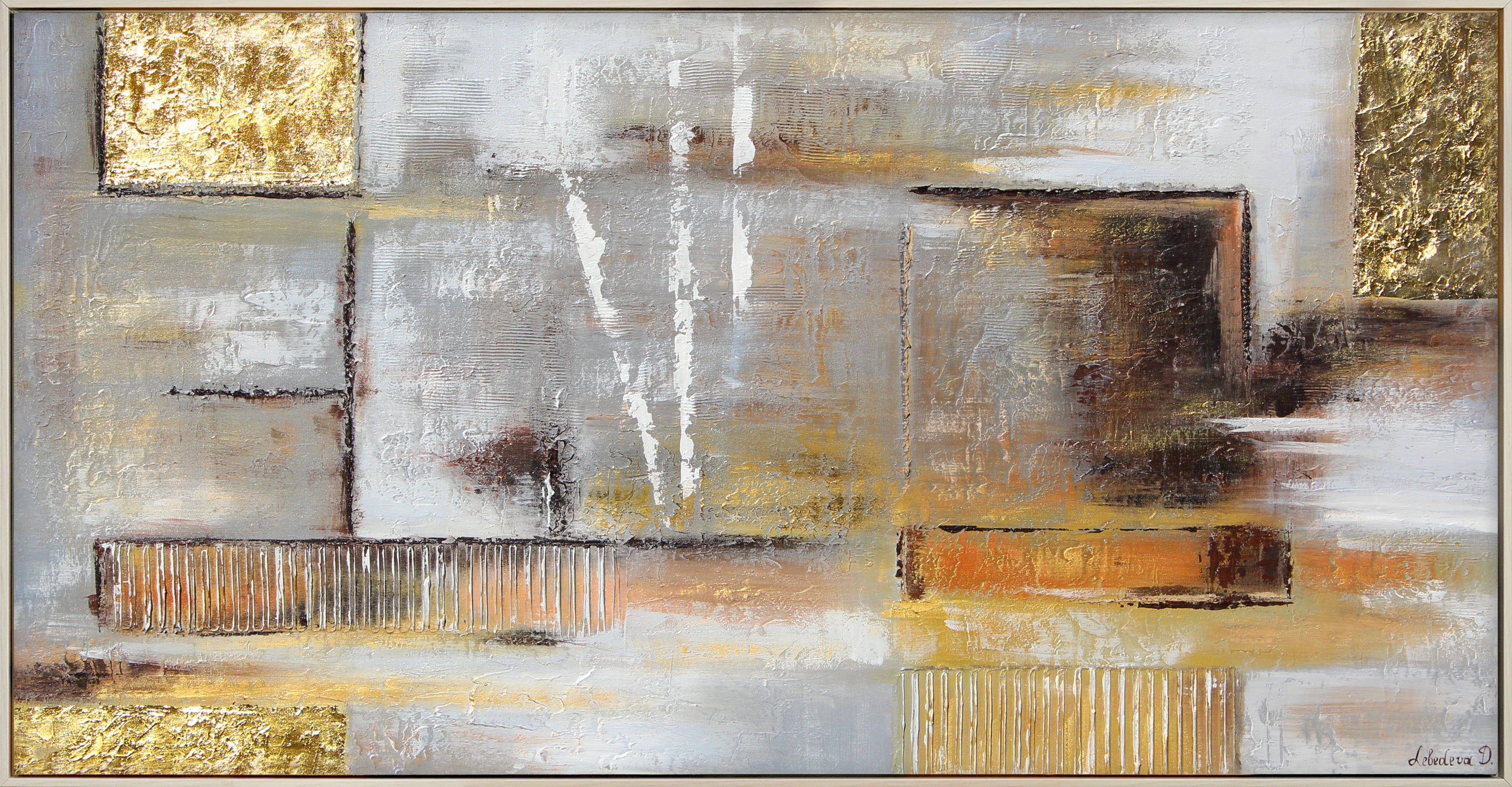 Das Leinwandbild „Goldene Abstraktion“ zeigt eine abstrakte Komposition in Acryl mit fein abgestimmten Grautönen und eleganten Goldakzenten. Die strukturierte Oberfläche verleiht dem Bild Tiefe und Lebendigkeit, die das Bild zu einem stilvollen Blickfang macht. Durch die warme Farbpalette fügt sich das Bild harmonisch in moderne Wohn- und Arbeitsbereiche ein.
