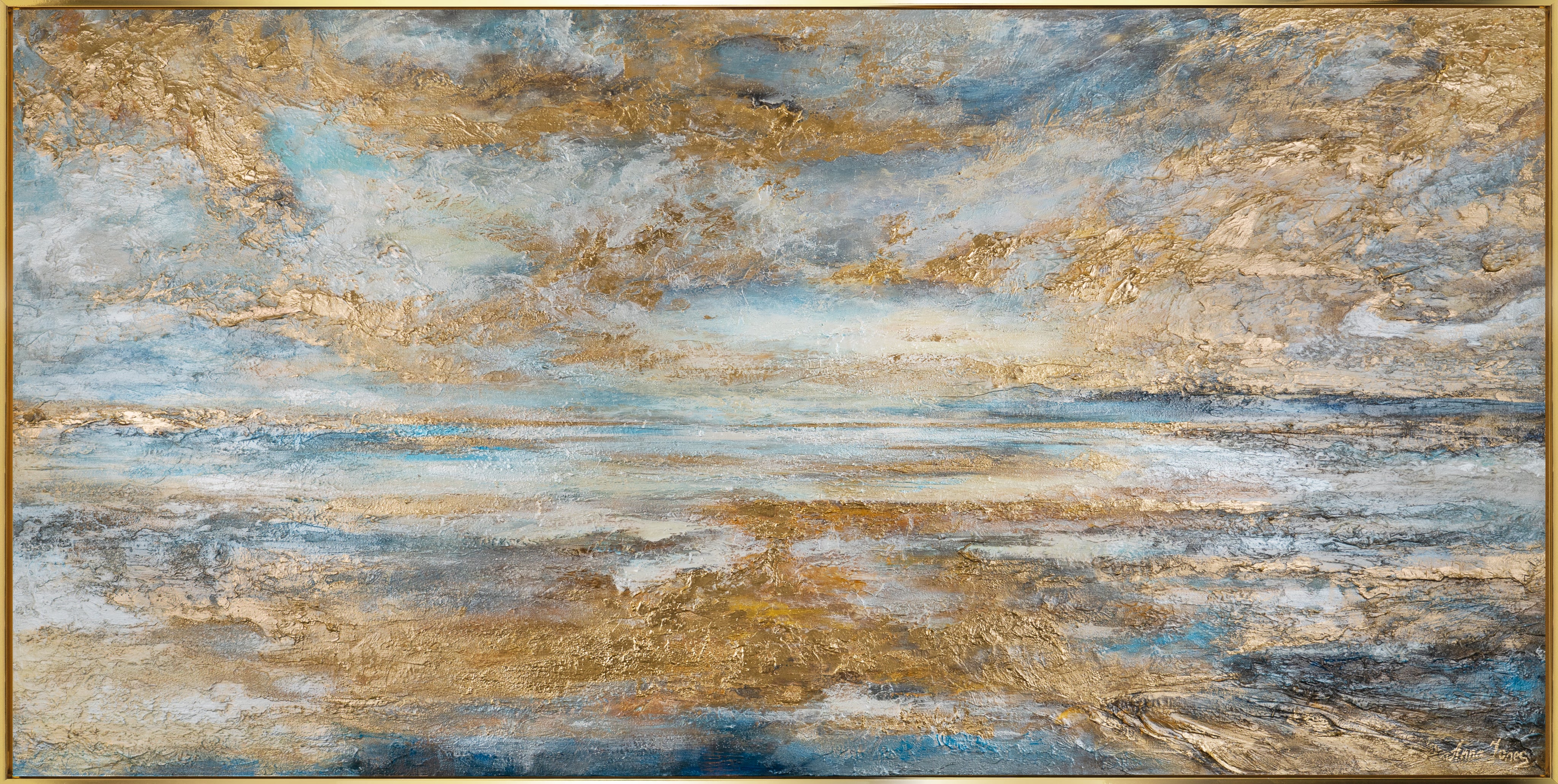 Das handgemalte Leinwandbild „Goldene Bucht“ präsentiert eine faszinierende Komposition aus sanften Blautönen und warmen Goldakzenten, die zusammen eine harmonische maritime Atmosphäre schaffen. Die texturierte Oberfläche mit reliefartigen Goldpartien verleiht dem Kunstwerk eine einzigartige Tiefenwirkung, die den Betrachter in eine ruhige Bucht eintauchen lässt. Die abstrakte Darstellung öffnet Raum für individuelle Interpretationen und bringt zugleich eine elegante Note in jeden Raum.