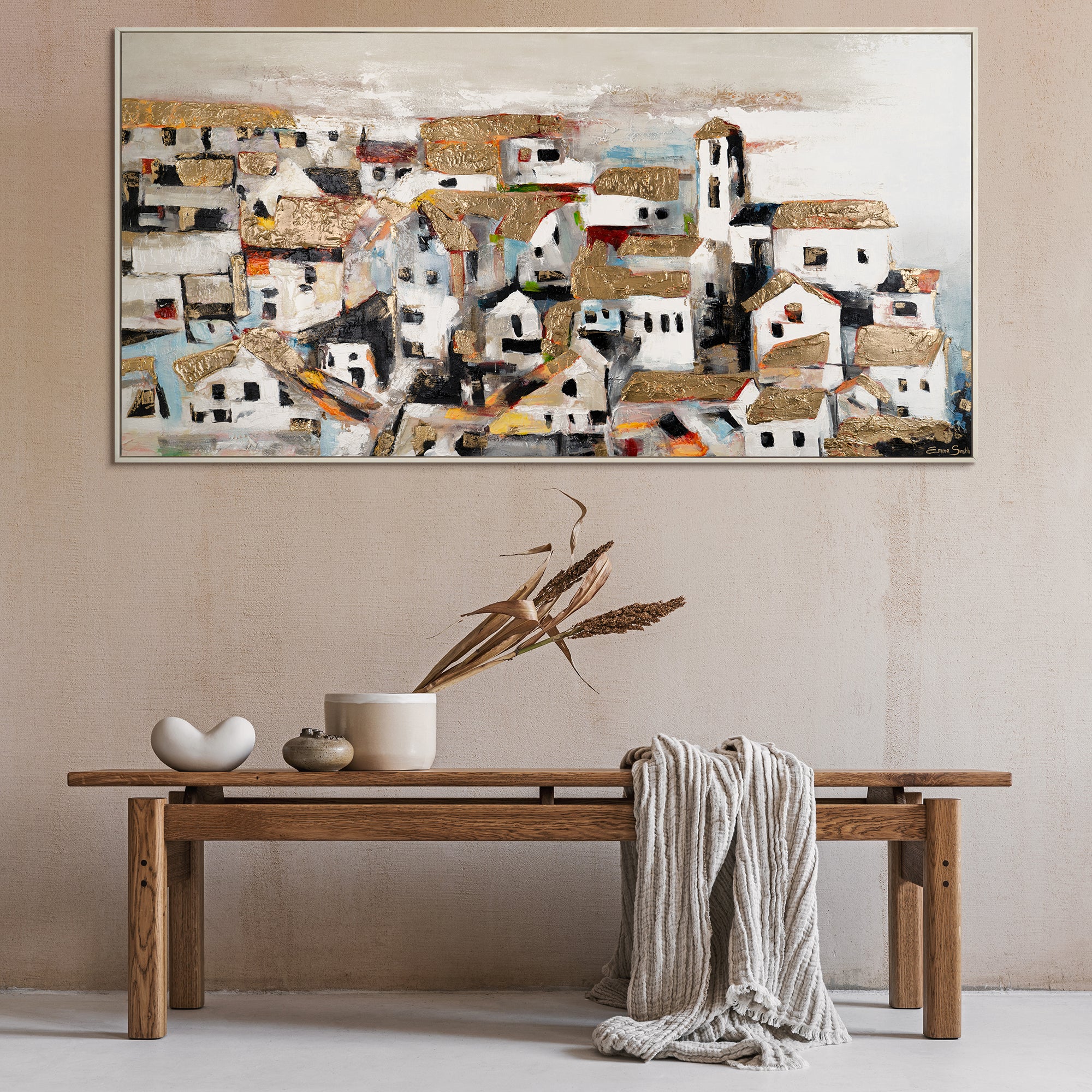 Dieses handgemalte Leinwandbild „Häuschen im Sonnenlicht“ fängt die warmen Farben und die Atmosphäre einer lebhaften Häuserlandschaft ein. Mit ausdrucksstarken Pinselstrichen und einer besonderen goldenen Struktur entsteht ein abstraktes Stadtbild, das sowohl Ruhe als auch Dynamik vermittelt. Die harmonische Komposition aus erdigen und leuchtenden Farbtönen sorgt für ein einzigartiges visuelles Erlebnis, das jeden Raum bereichert.