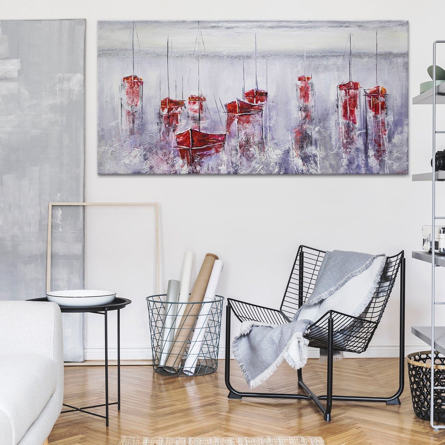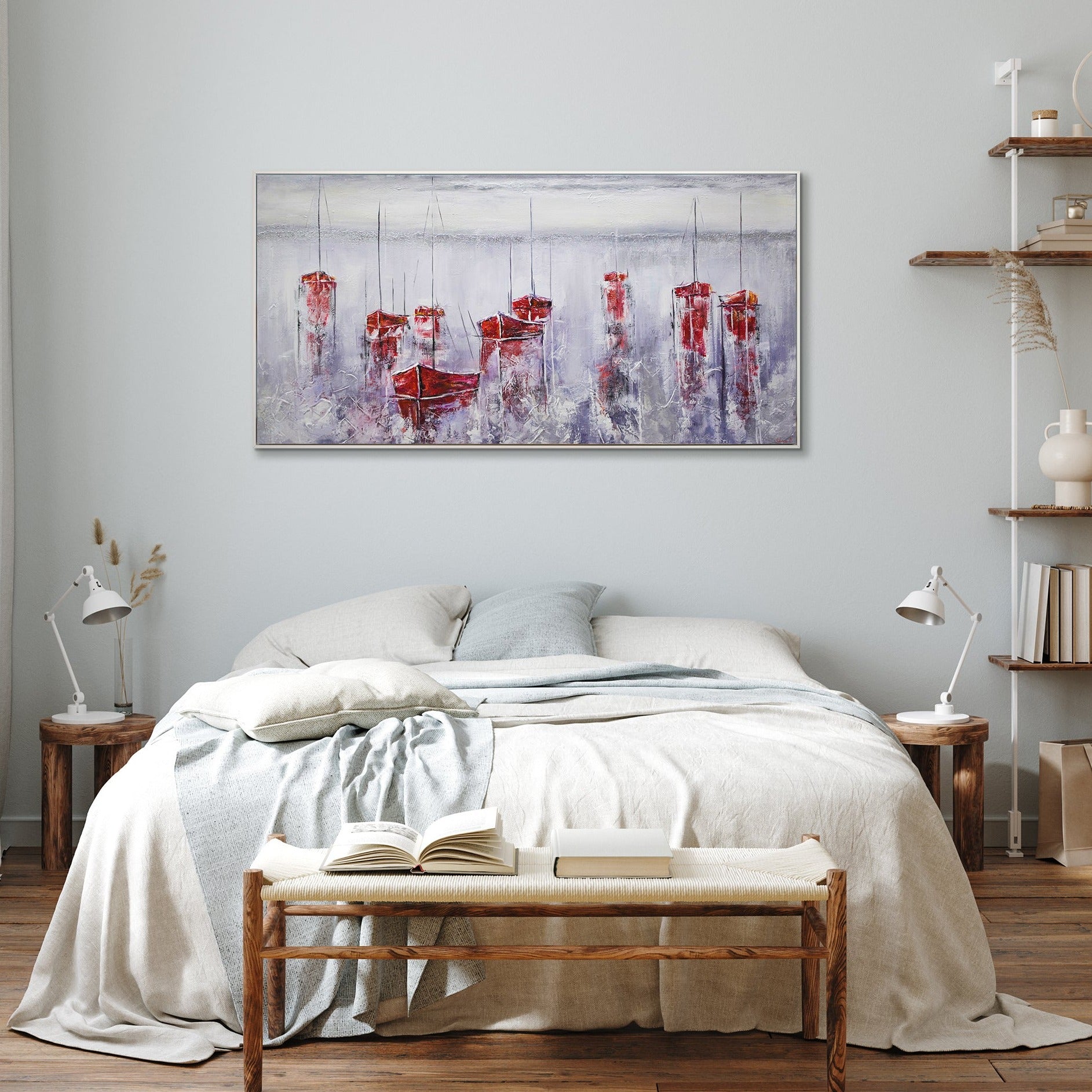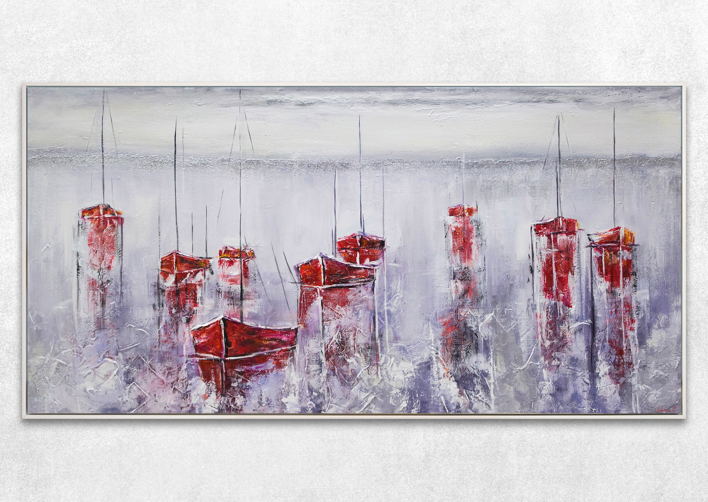 Ein Gemälde in Rottönen, das einen ruhigen Hafen mit Schiffen darstellt, passt ideal in das Innere einer Stadtwohnung oder eines Landhauses, eines Wohnzimmers oder eines Arbeitszimmers. Sie erhalten nicht nur ein Gemälde, sondern ein exklusives und einzigartiges Kunstwerk, das von einem talentierten Künstler gemalt wurde.