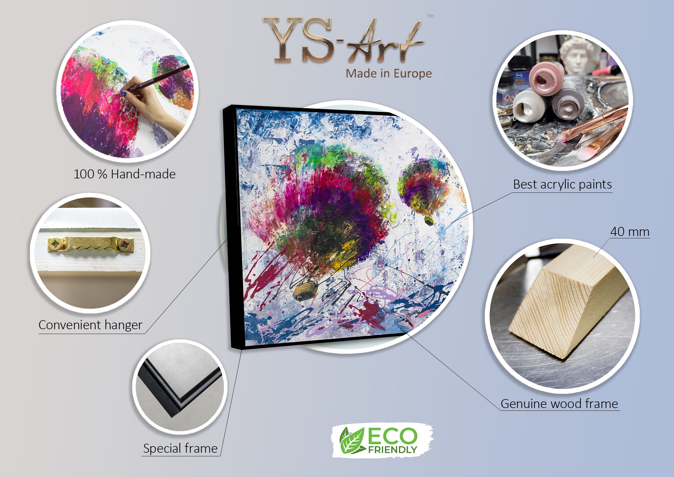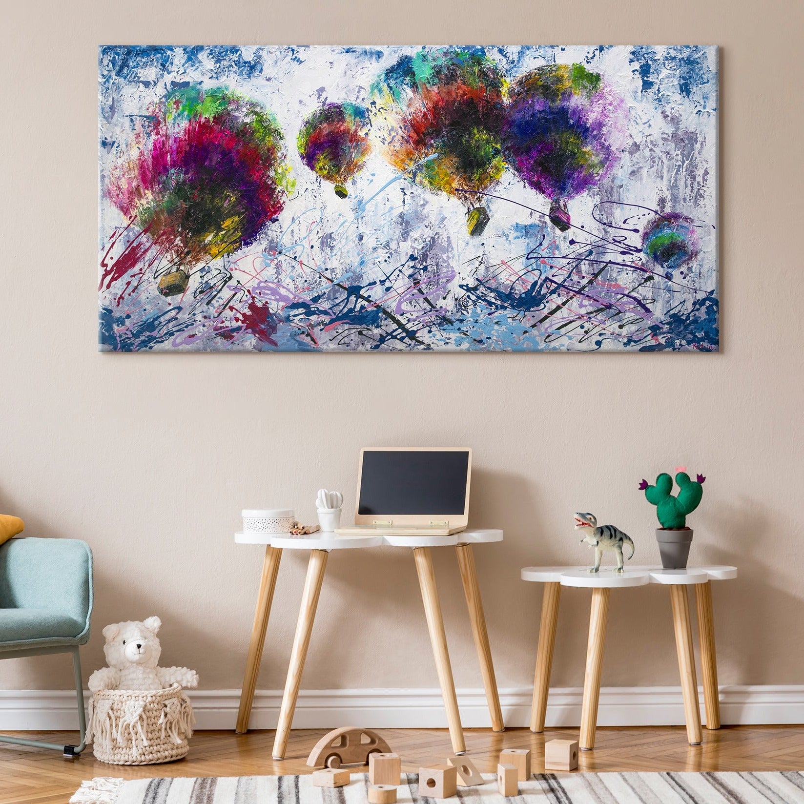 Die bunten Ballons auf diesem Gemälde sehen aus wie echte Heißluftballons - ab und zu scheint es, als würden sie gleich in den Himmel abheben. Dieses mehrfarbige Gemälde ist eine perfekte Ergänzung für das Interieur eines Wohnzimmers, Schlafzimmers, Kinderzimmers oder sogar eines Arbeitszimmers, es wird Ihr Zuhause zu jeder Zeit des Jahres heller und gemütlicher machen.