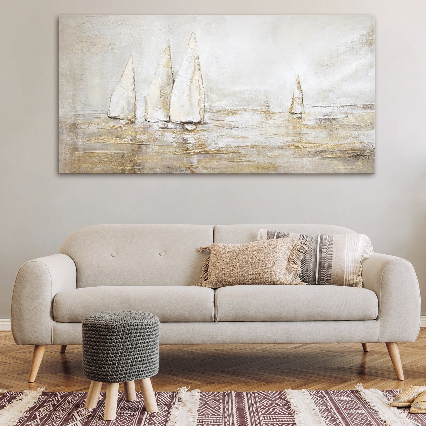 • Acryl Kunstwerk Meer Segelboote Beige Gold Relief