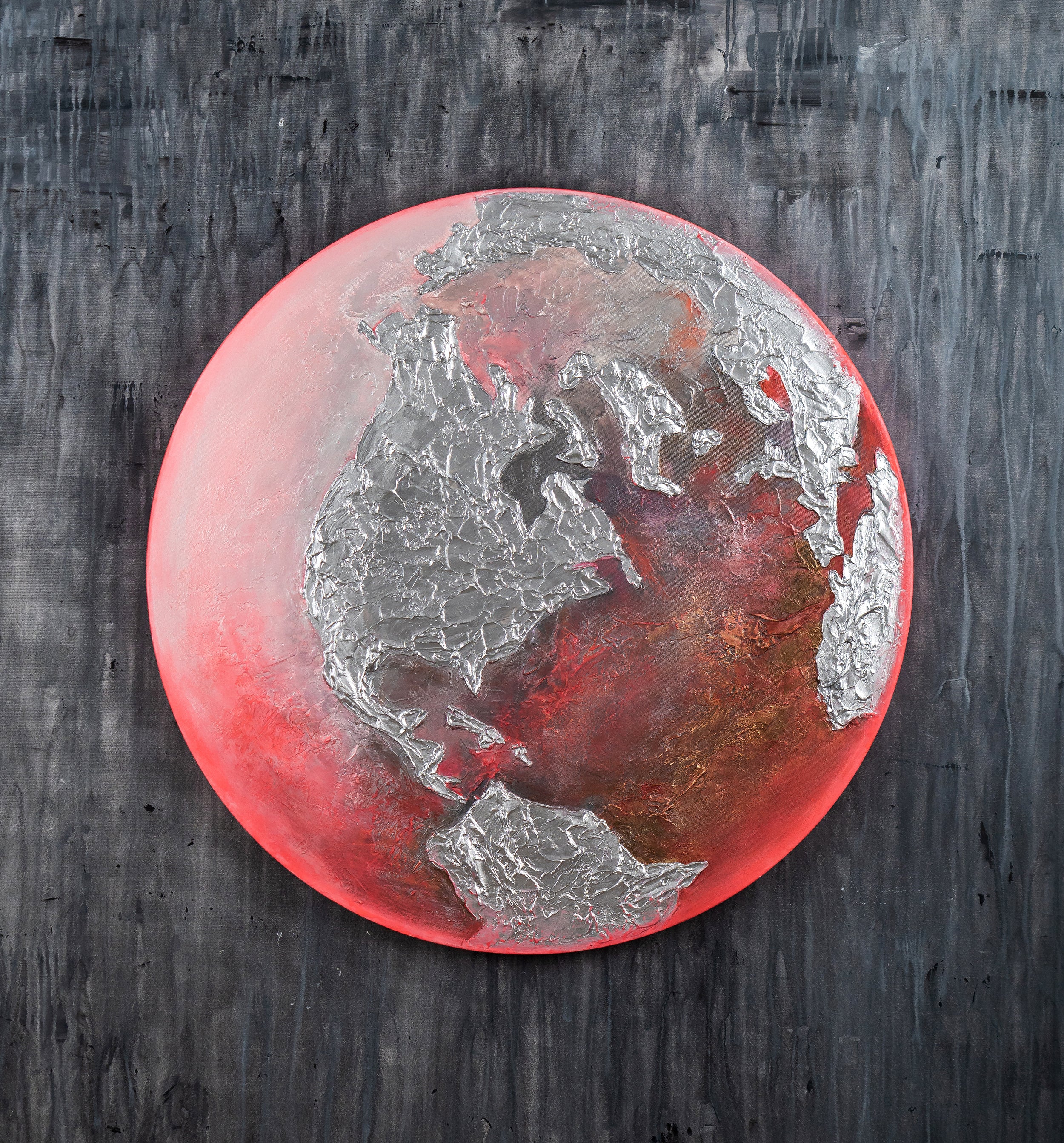 Bereichern Sie Ihr Zuhause oder Büro mit dem eleganten "Erde" - ein rundes Acryl Gemälde in Form eines Planeten, das in der Dunkelheit dank spezieller Leuchtfarbe strahlt. Diese moderne Kunst besticht durch rote Töne und silberne Kontinente, die eine warme und dynamische Atmosphäre schaffen. Das Gemälde ist 100% handgemalt und wird durch einen eleganten Rahmen hervorgehoben.