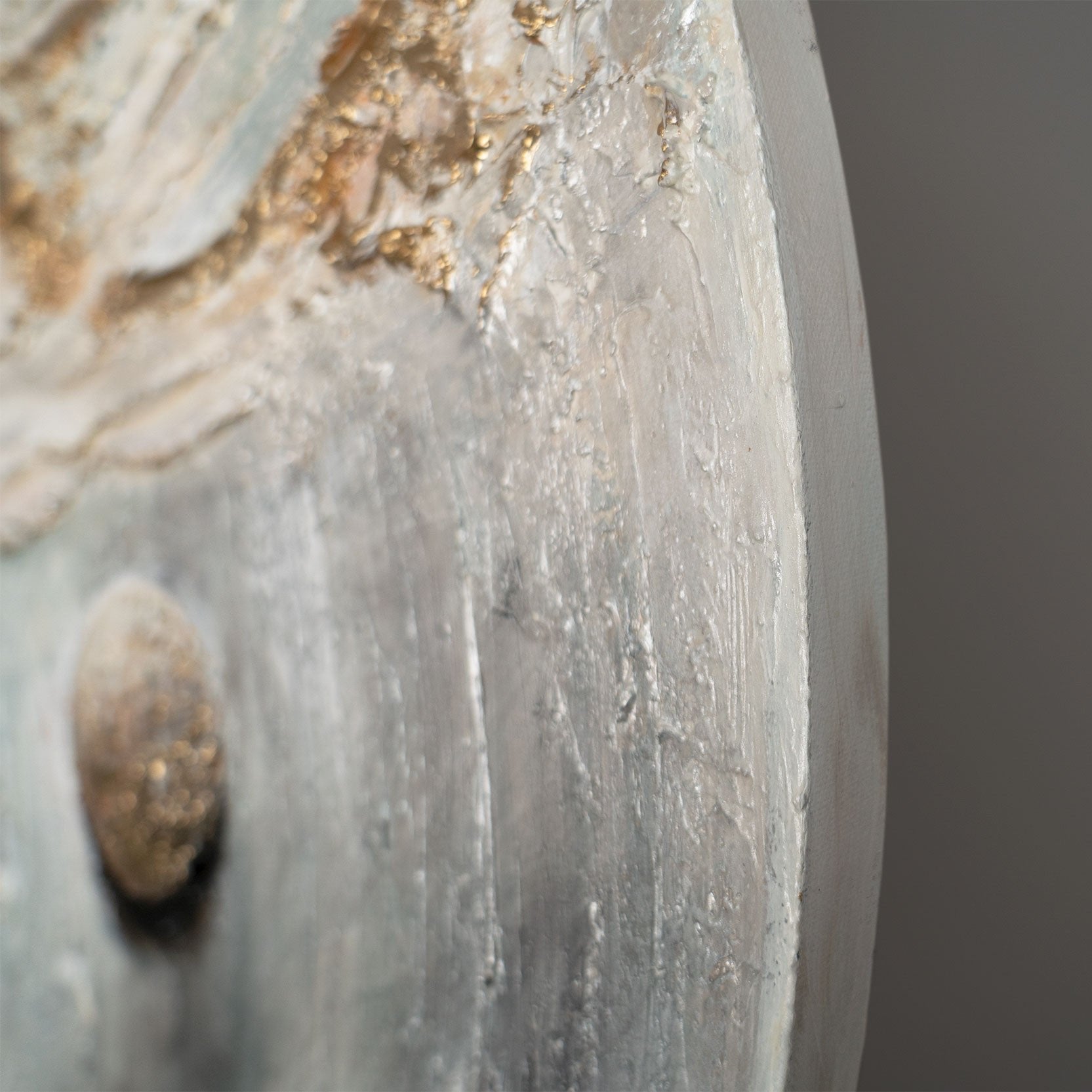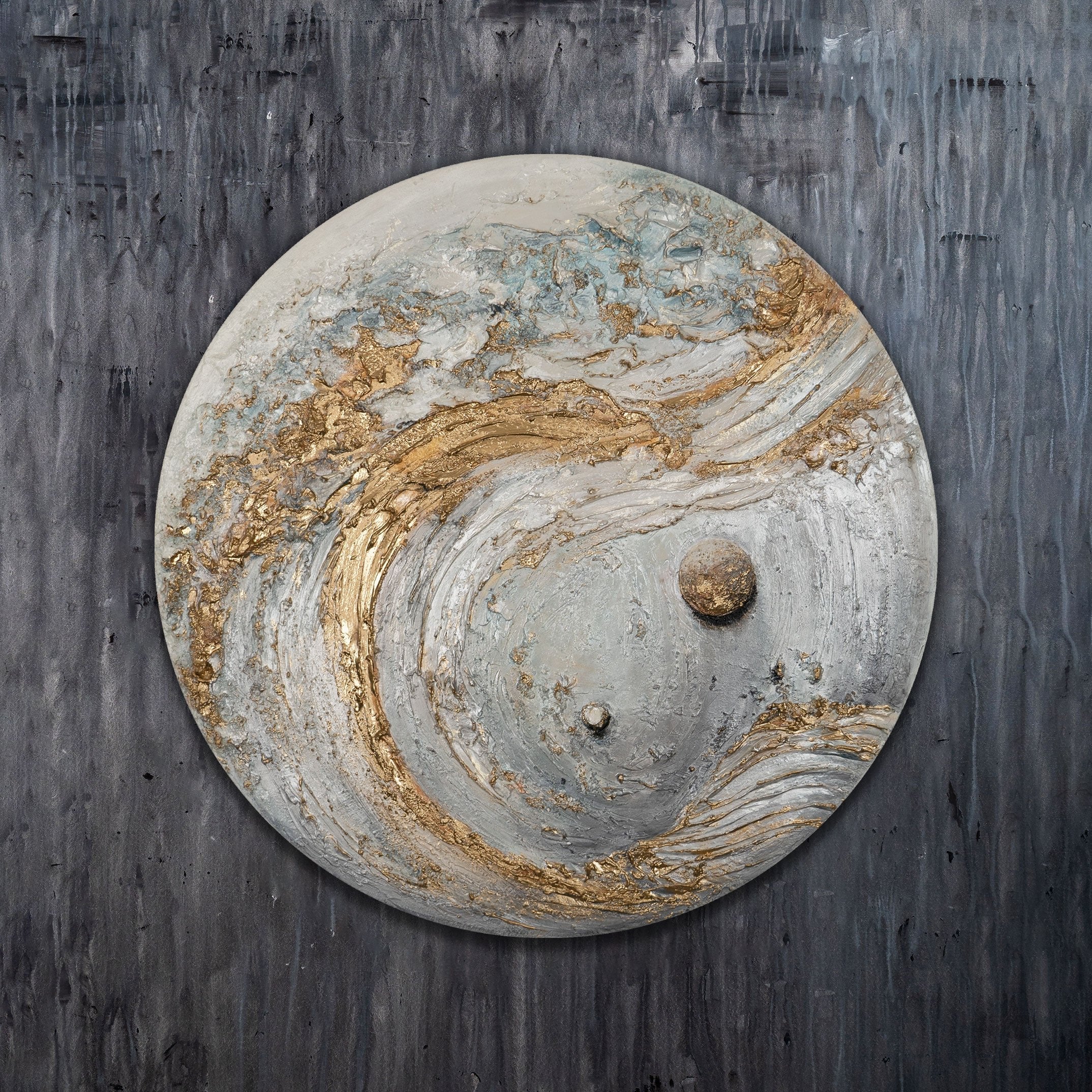 Erhellen Sie Ihren Raum mit dem bezaubernden Kunstwerk „Heliona“. Dieses handgemalte Meisterwerk kombiniert reiche Texturen aus weißen, braunen und goldenen Farben, die im Dunkeln leuchten. Es eignet sich perfekt für Wohn-, Schlaf- oder Büroräume, schafft eine einzigartige Atmosphäre und stellt außergewöhnliche Handwerkskunst zur Schau.