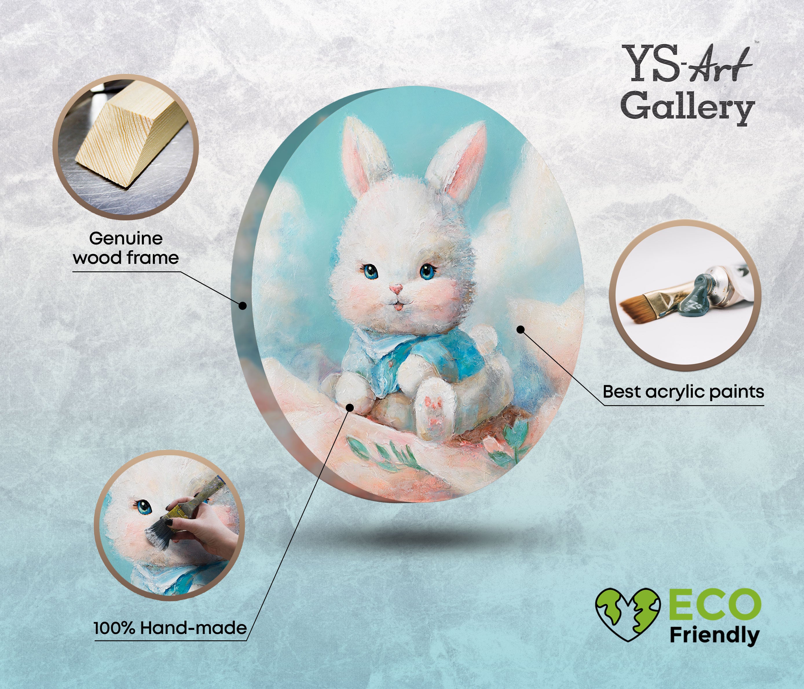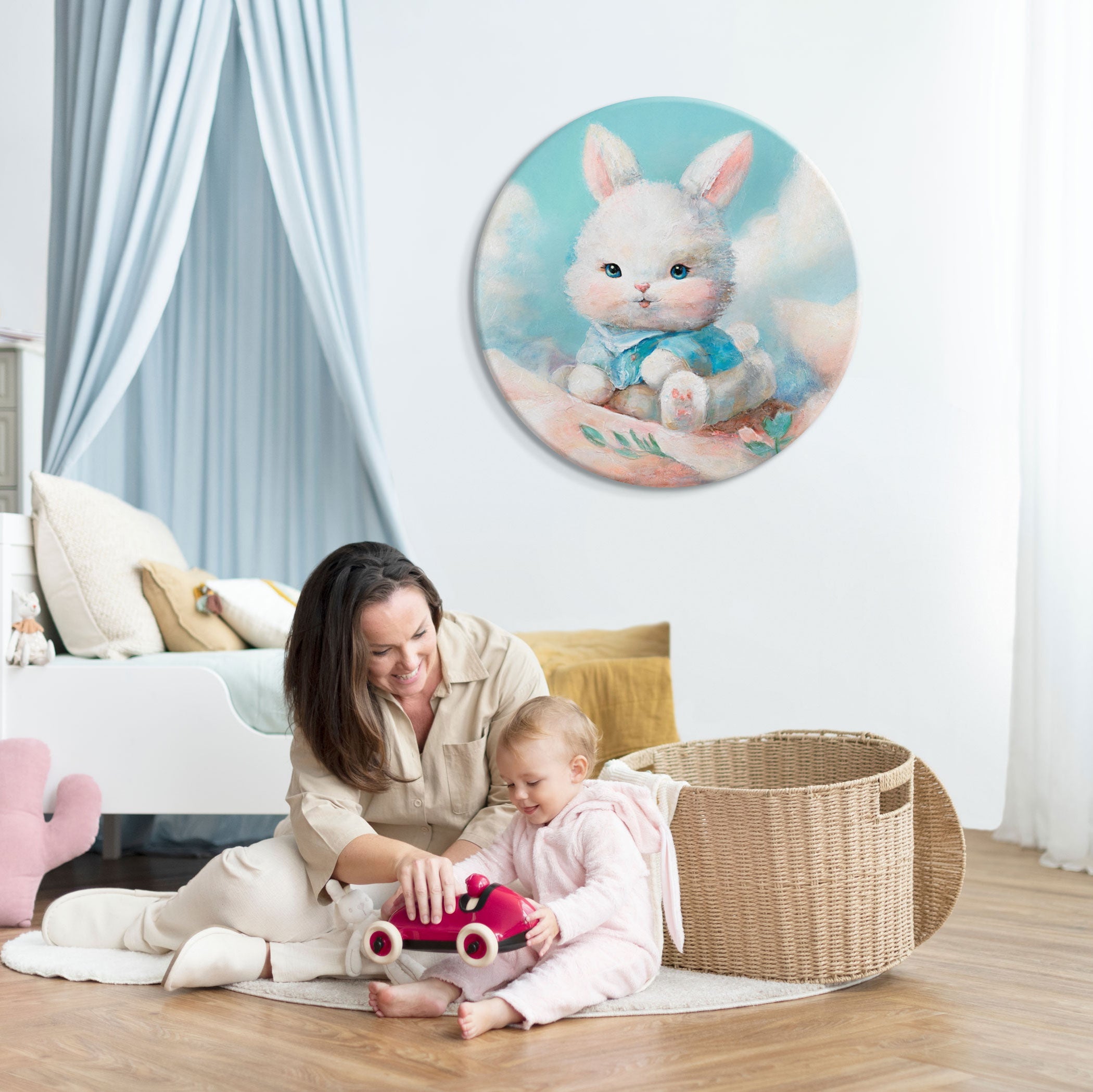 „Bunny“ ist ein rundes Acrylbild auf Leinwand, das einen sitzenden weißen Hasen in zarten Pastellfarben zeigt. Mit seinen großen blauen Augen und dem blauen Pullover vermittelt das Motiv eine freundliche und beruhigende Stimmung – ideal fürs Baby- oder Kinderzimmer.