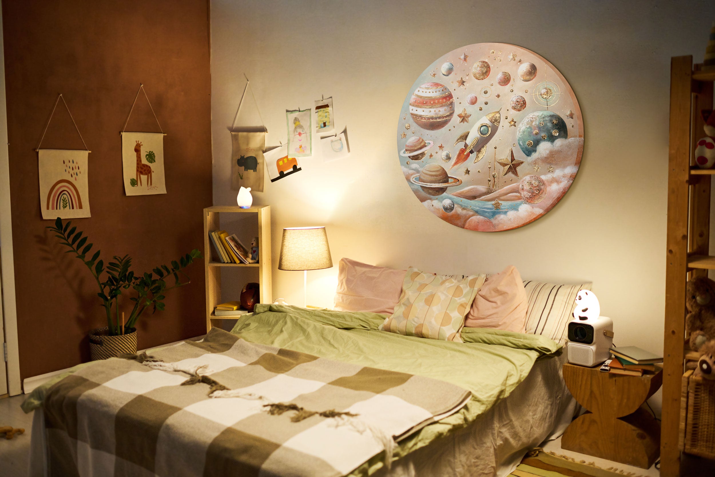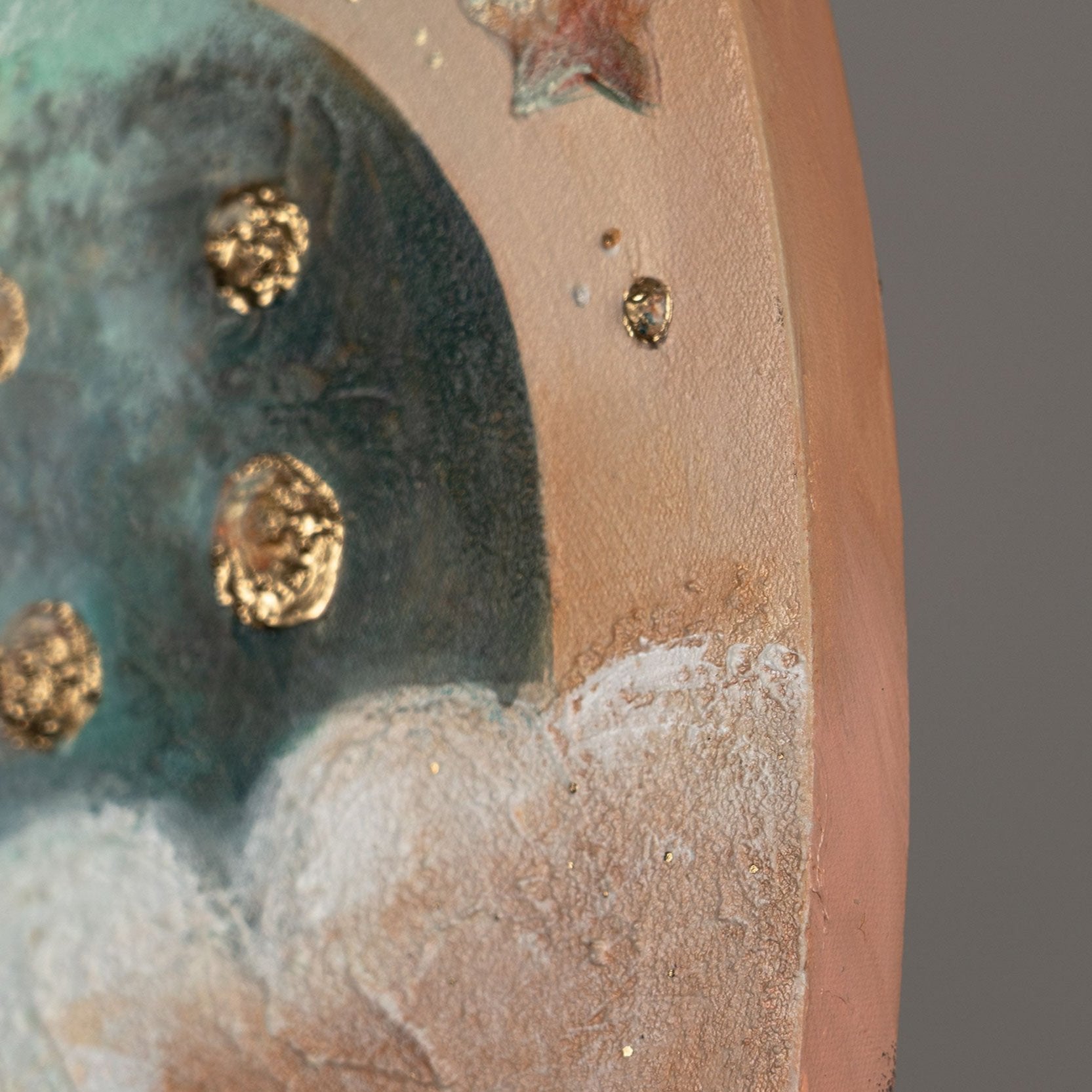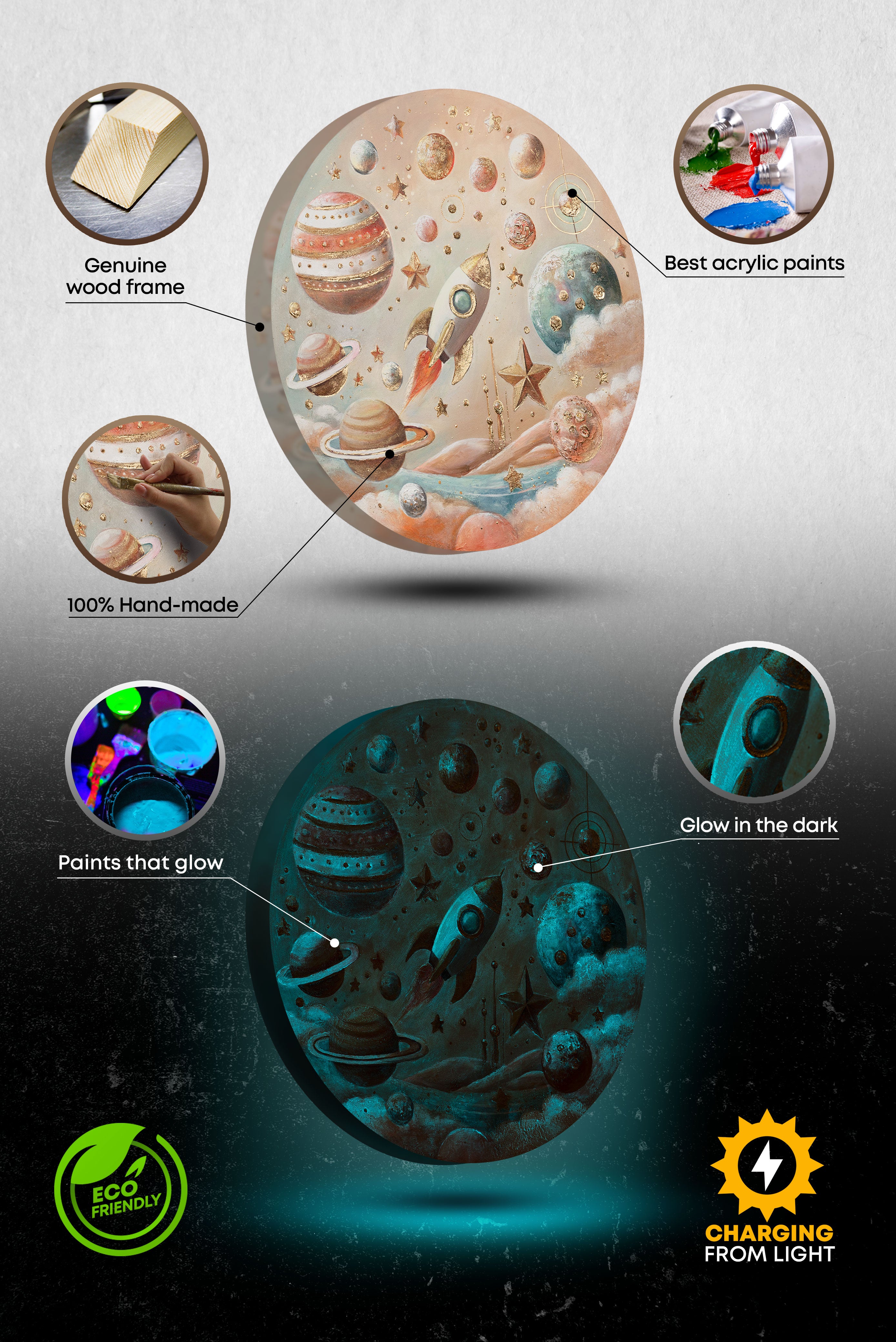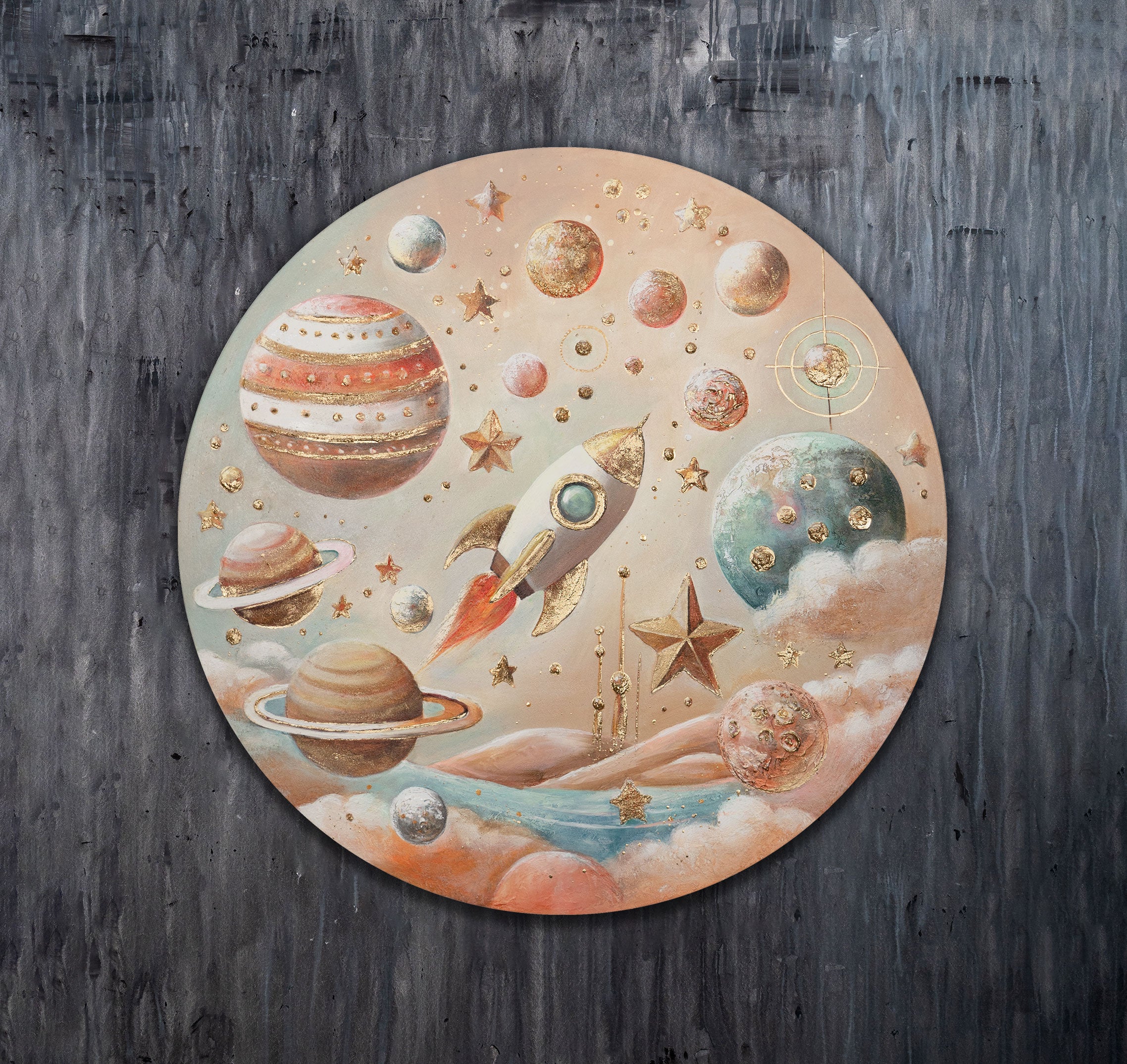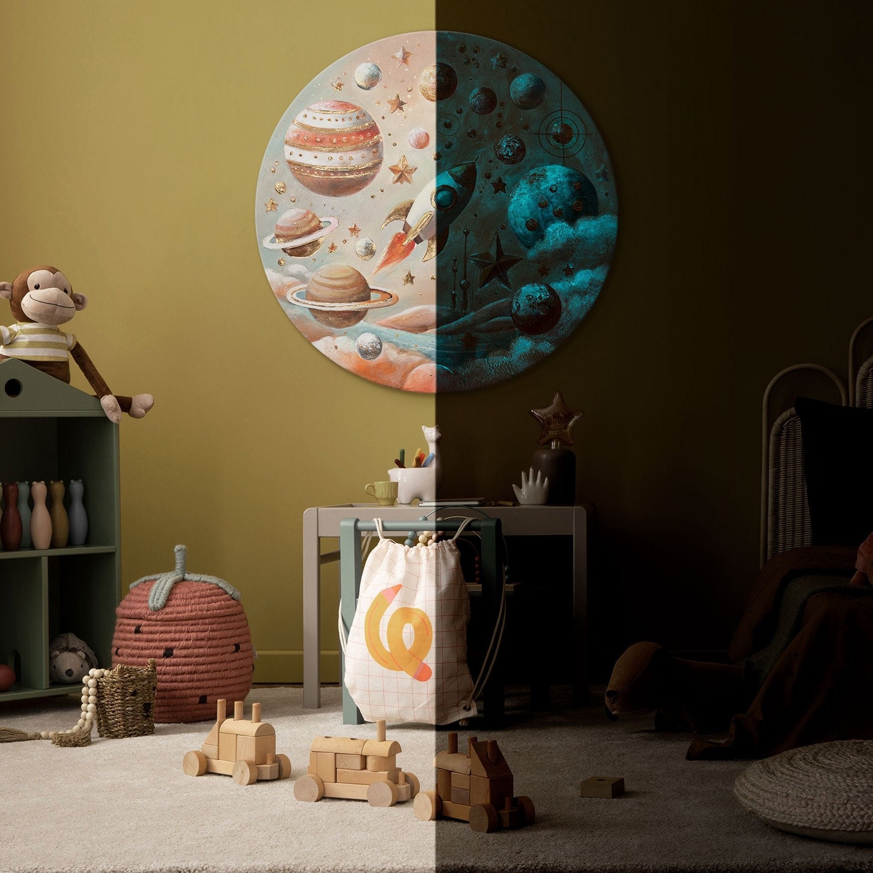 • Runde Leinwand mit strahlenden Sternen und galaktischen Planeten.