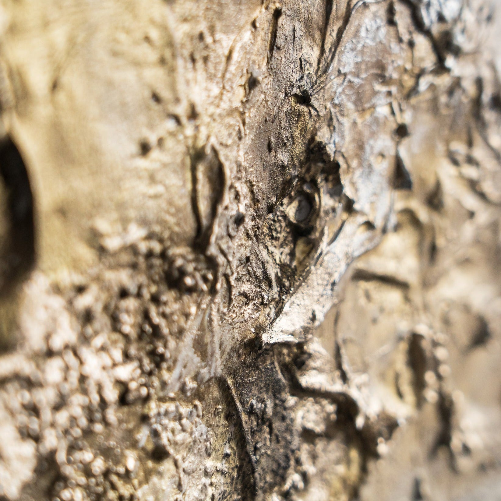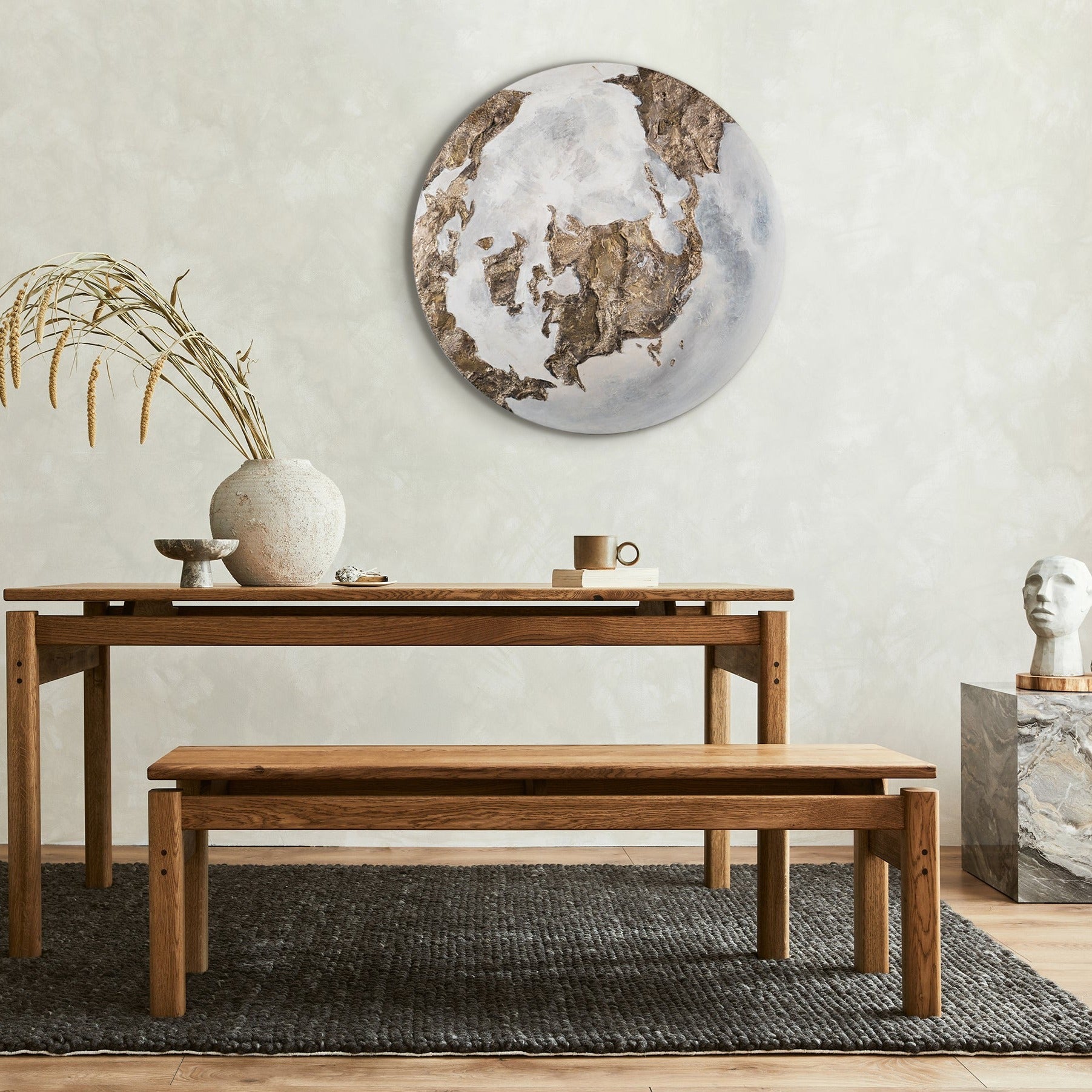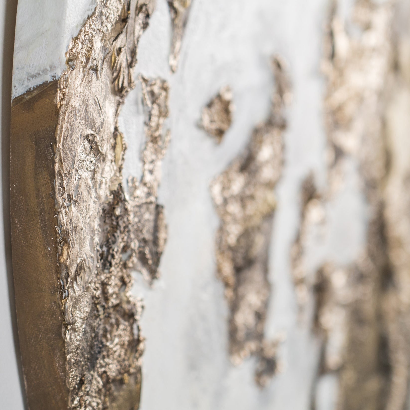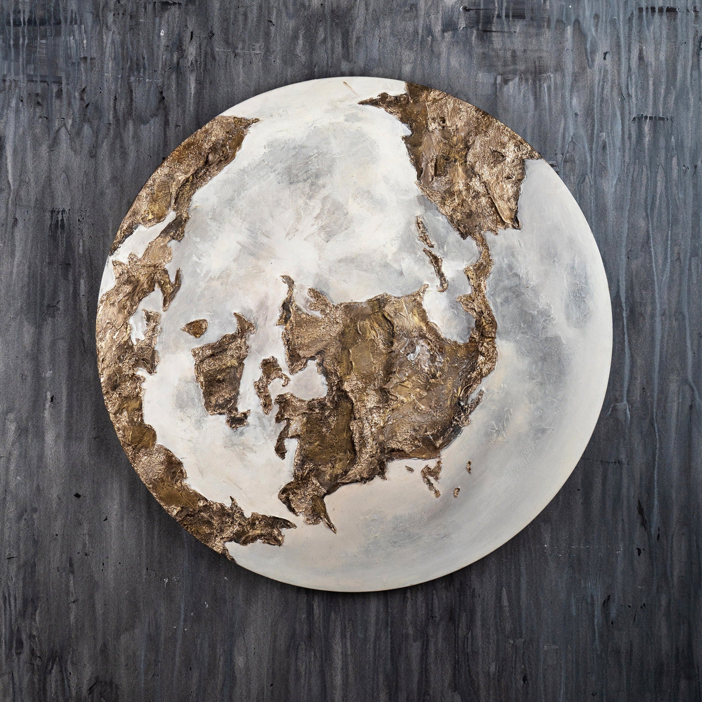 Bereichern Sie Ihr Zuhause oder Büro mit dem eleganten "Goldene Erde" - ein rundes Acryl Gemälde in Form eines Planeten, das in der Dunkelheit dank spezieller Leuchtfarbe strahlt. Diese moderne Kunst besticht durch goldene und erdige Töne, die eine warme und dynamische Atmosphäre schaffen. Das Gemälde ist 100% handgemalt und wird durch einen eleganten Rahmen hervorgehoben.
