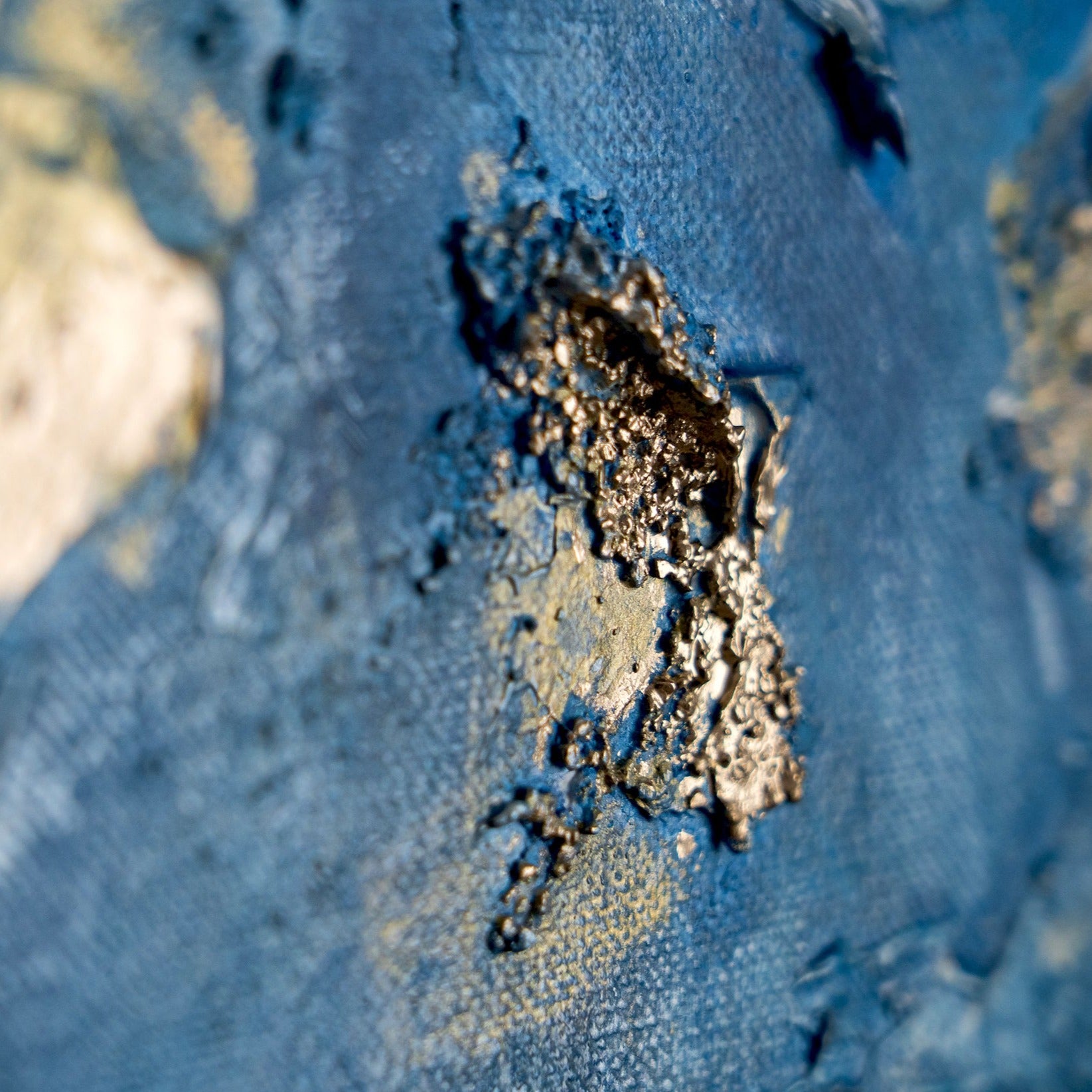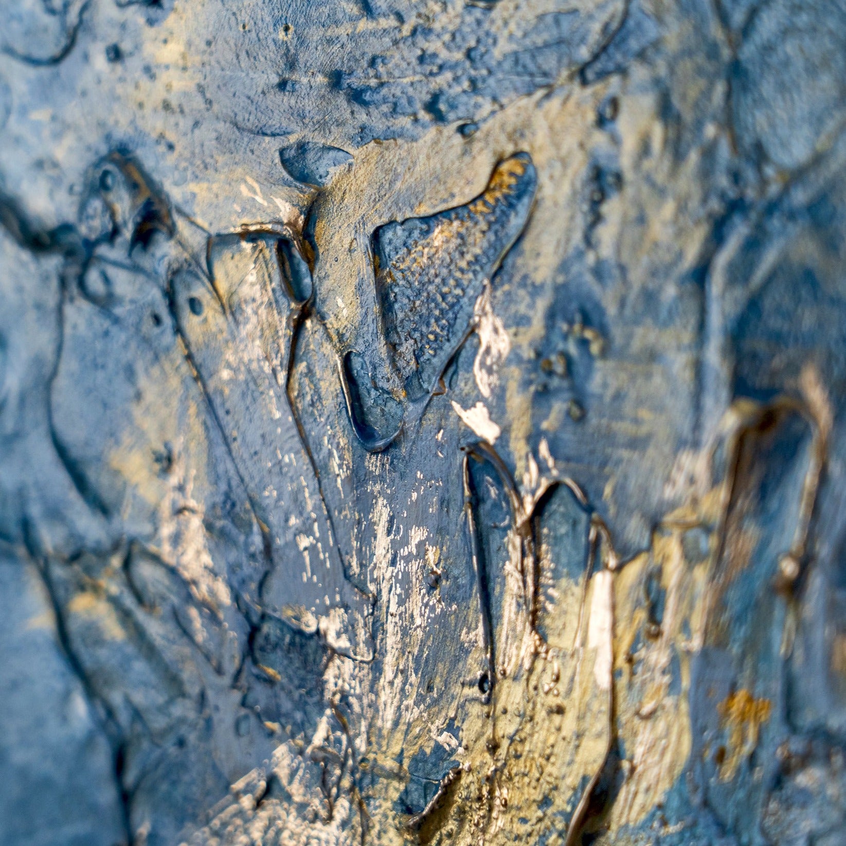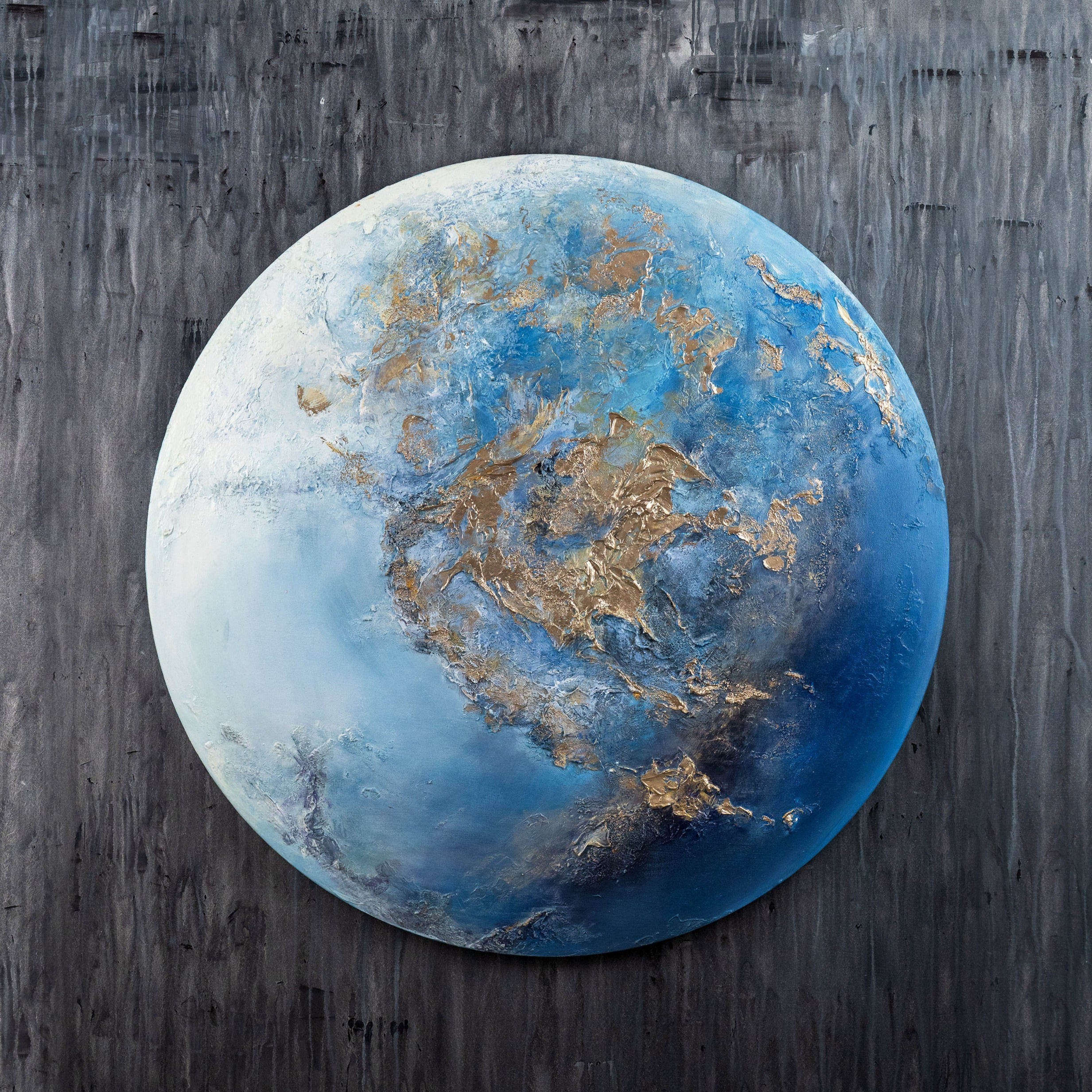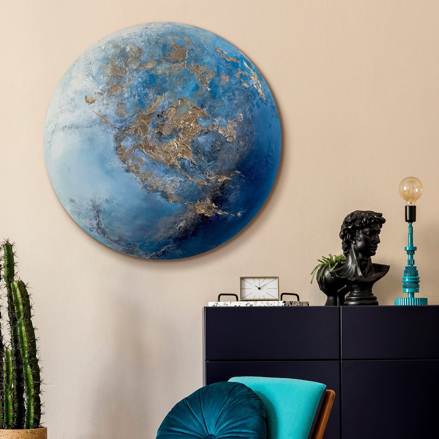 Bereichern Sie Ihr Zuhause oder Büro mit dem eleganten "Neptun" - ein rundes moderne gemälde in Form eines Planeten, das in der Dunkelheit dank spezieller Leuchtfarbe strahlt. Diese moderne Kunst besticht durch eine Kombination von blauen und goldenen Texturen, die eine beruhigende und zugleich dynamische Atmosphäre schaffen. Das Gemälde ist 100% handgemalt und wird durch einen eleganten Rahmen hervorgehoben.