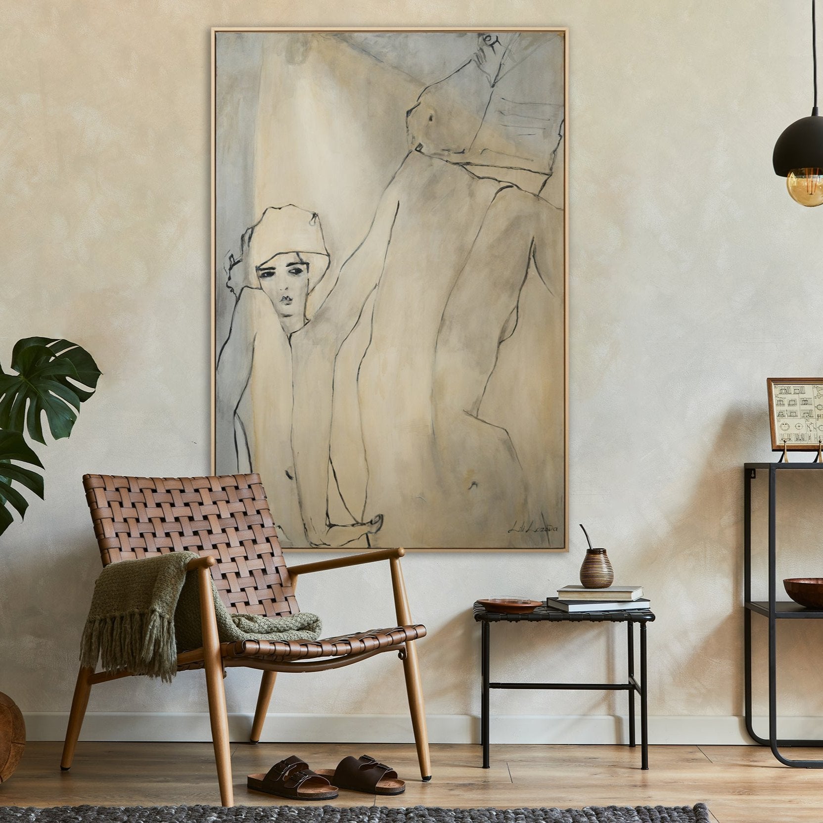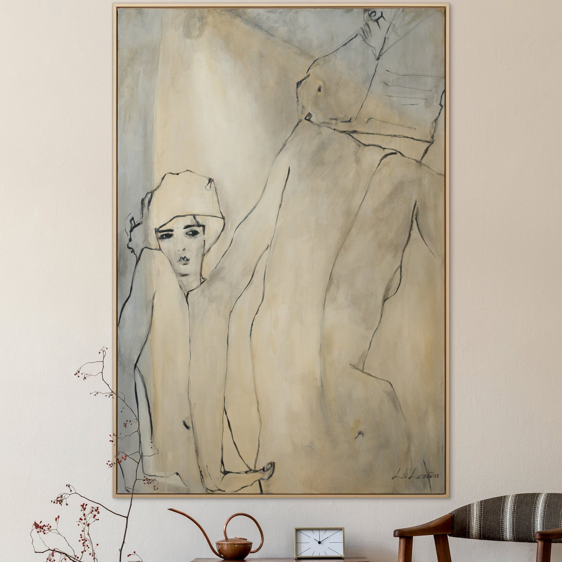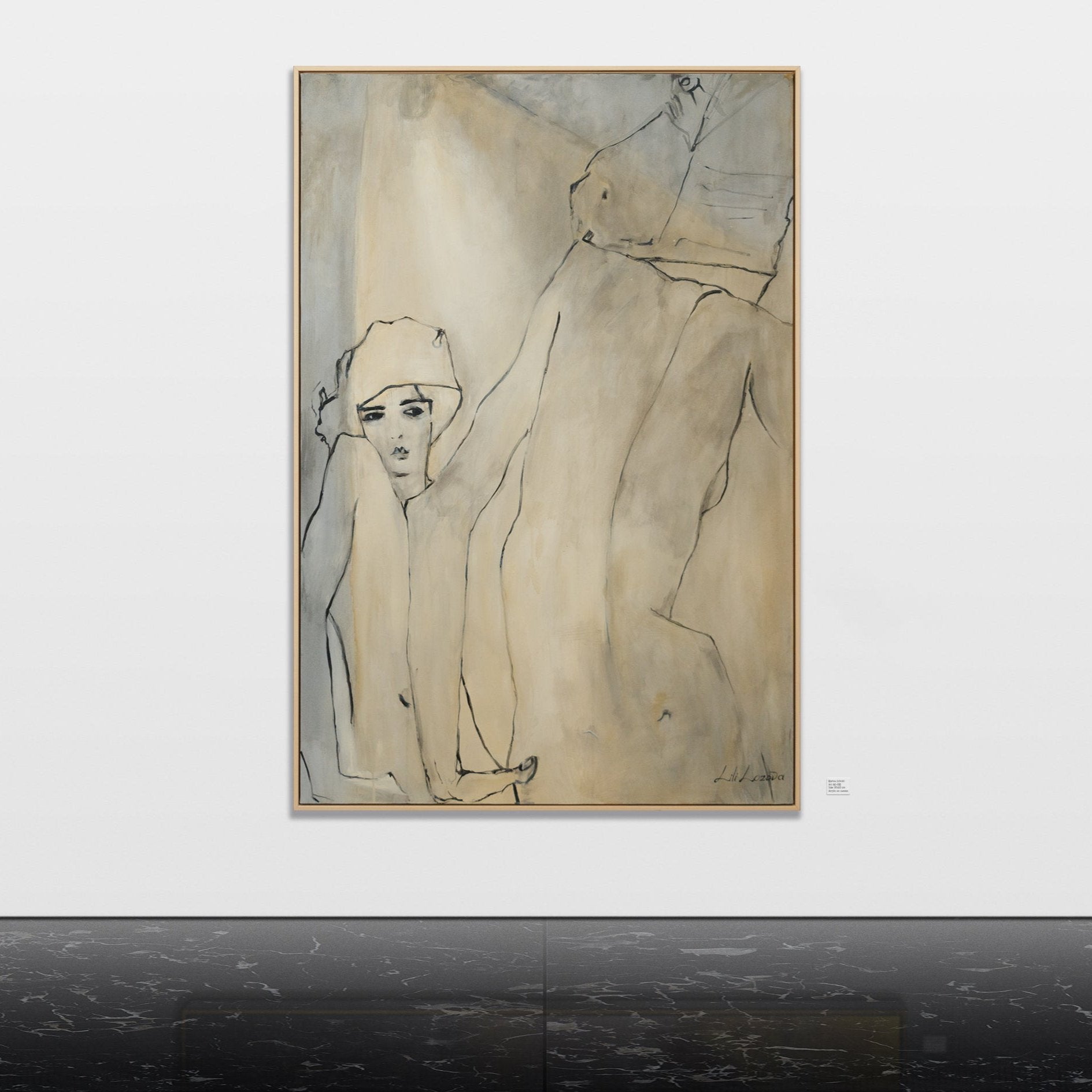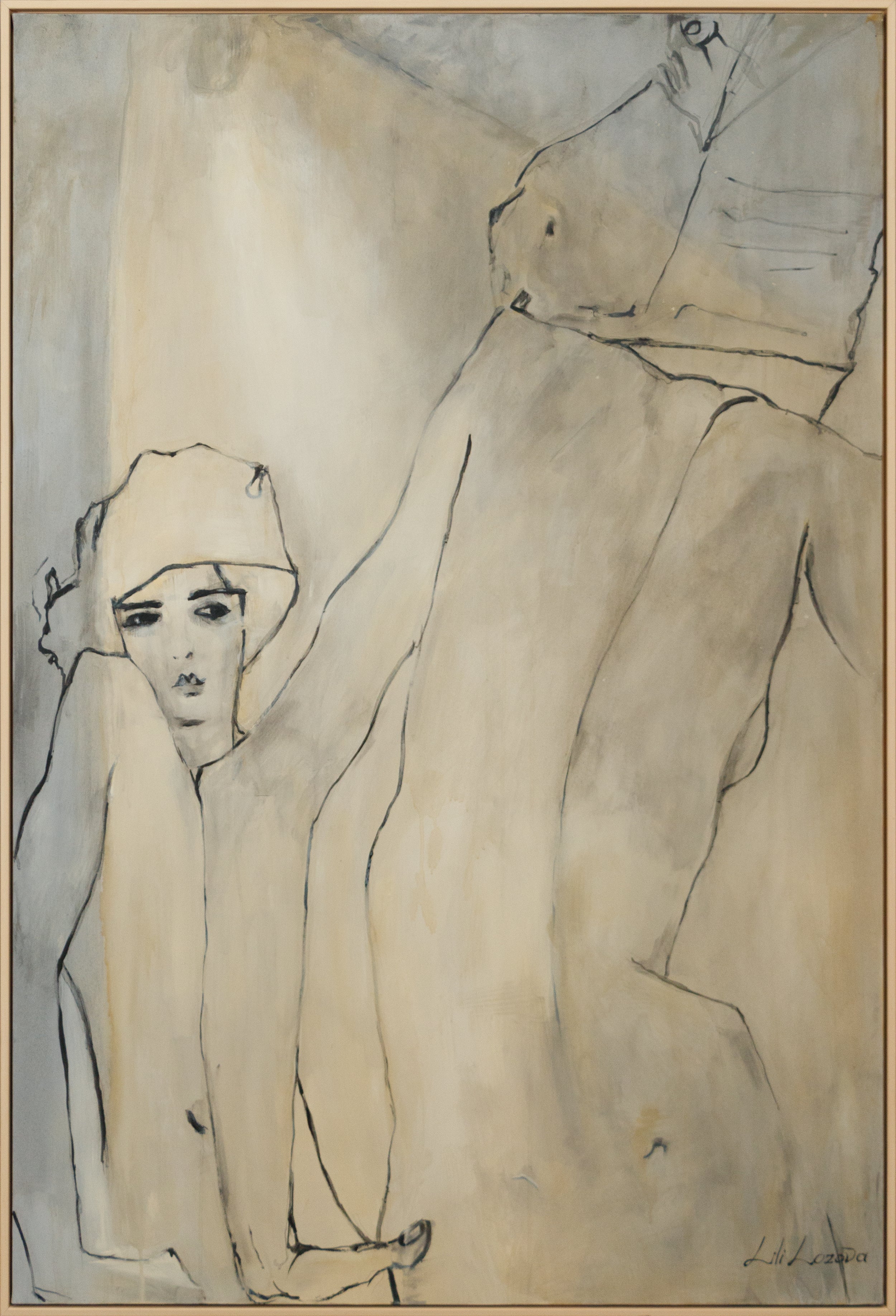 Dieses handgemalte Acrylbild zeigt eine abstrakte Darstellung einer Frau, die mit feinen Linien und sanften Farben eine ruhige und stilvolle Atmosphäre schafft. Die weichen, fließenden Formen und die minimalistische Farbpalette machen dieses Kunstwerk zu einem perfekten Akzent für moderne Innenräume.