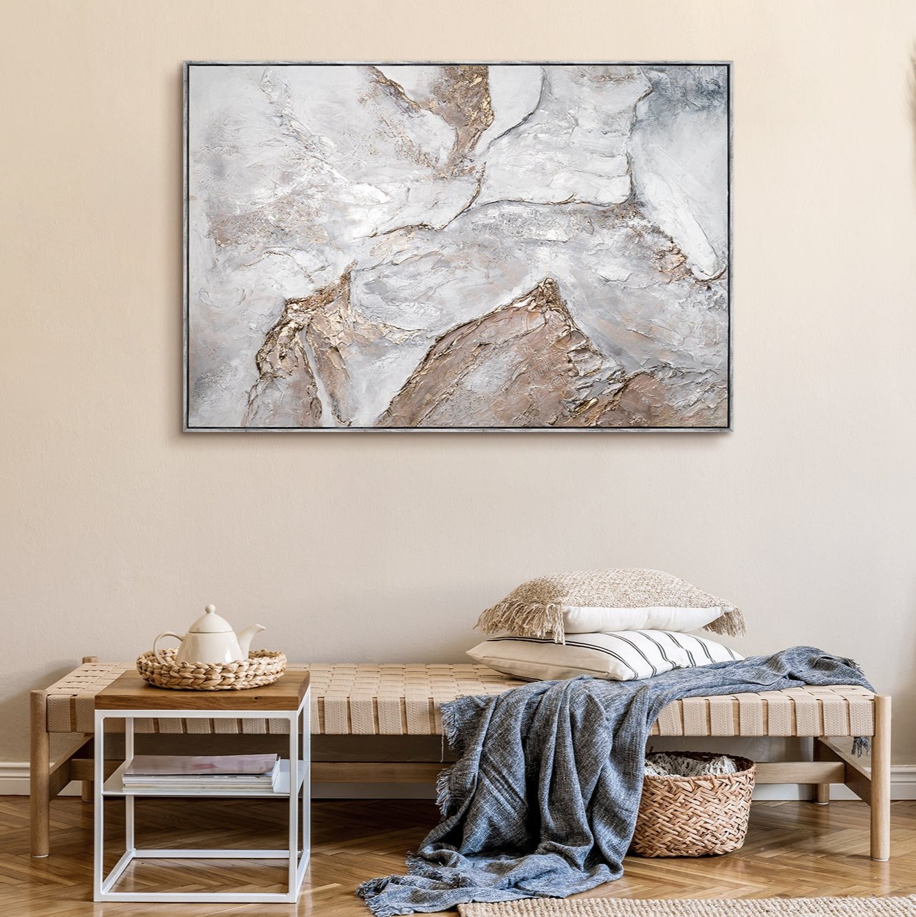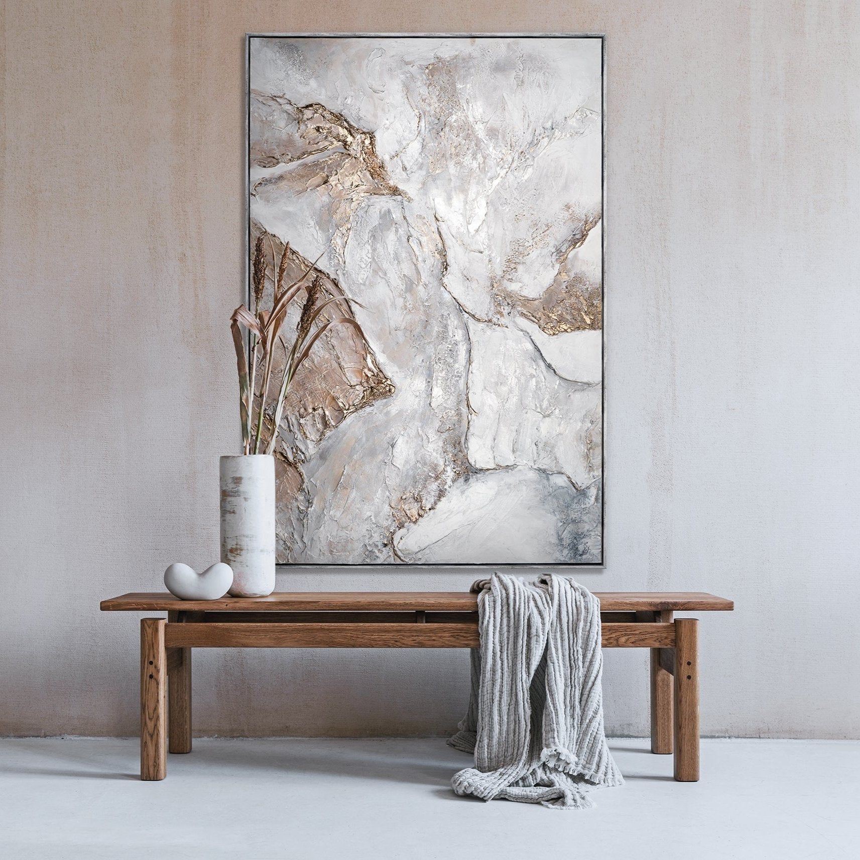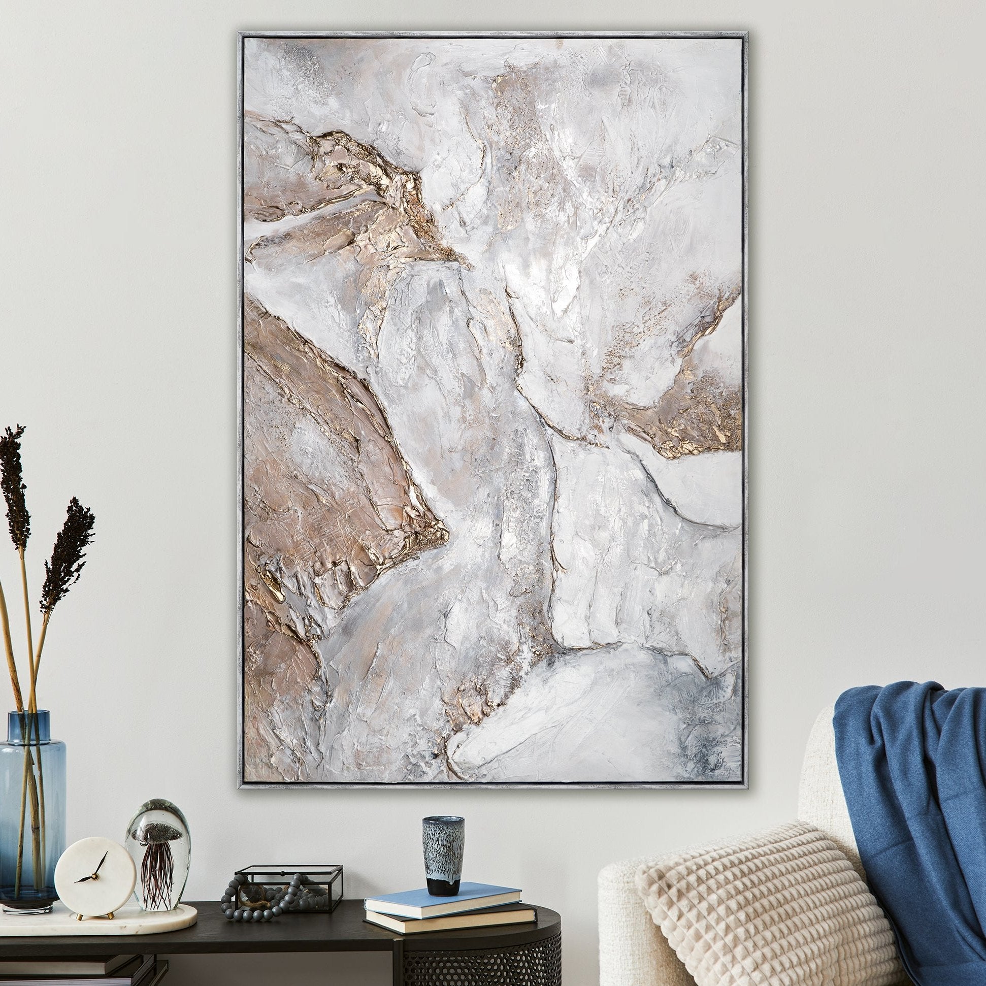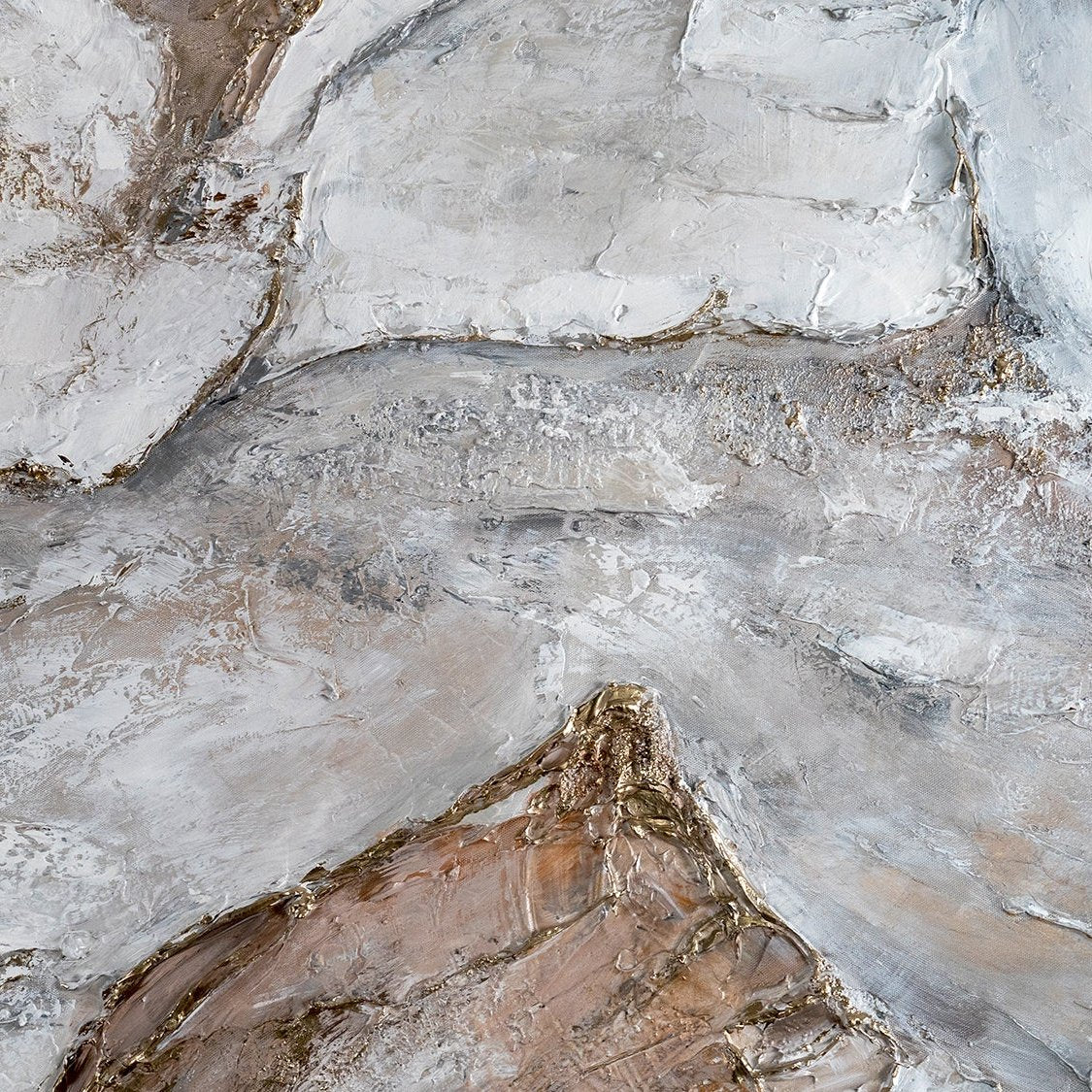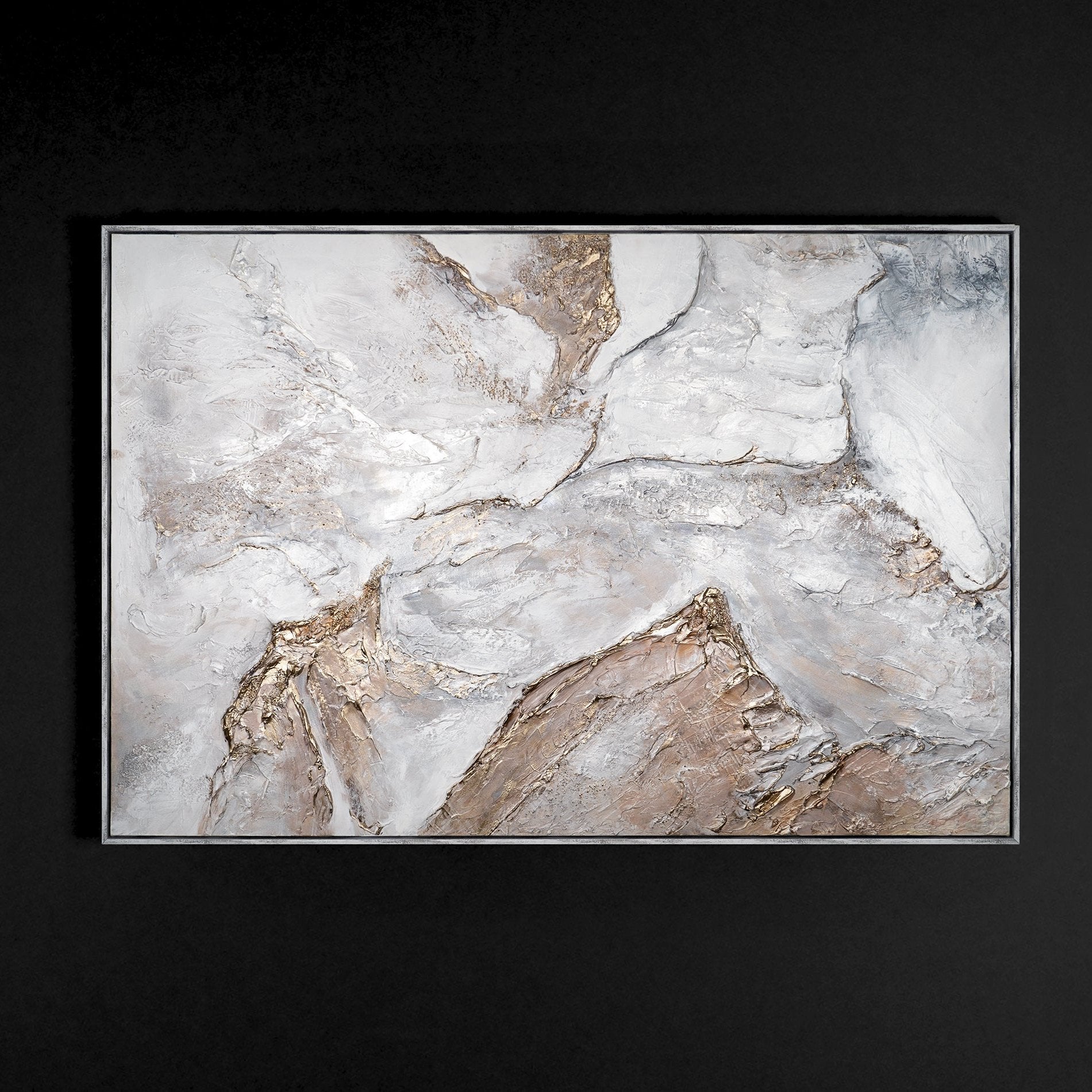 'Kühle Erhebung' ist ein ausdrucksstarkes abstraktes Gemälde, das mit einer faszinierenden Kombination aus Silber-, Grau- und Goldtönen arbeitet.
